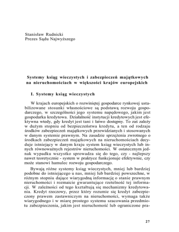 Stanisław Rudnicki Prezes Sądu Najwyższego Systemy ksiąg wieczystych i zabezpieczeń majątkowych na nieruchomościach w większości krajów europejskich I. Systemy ksiąg wieczystych W krajach europejskich o rozwiniętej gospodarce rynkowej ustabilizowane stosunki własnościowe są podstawą rozwoju gospodarczego, w szczególności jego systemu napędowego, jakim jest gospodarka kredytowa. Działalność instytucji kredytowych jest efektywna wtedy, gdy kredyt jest tani i łatwo dostępny. To zaś zależy w dużym stopniu od bezpieczeństwa kredytu, a ten od rodzaju środków zabezpieczeń majątkowych przewidzianych i stosowanych w danym systemie prawnym. Na zasadzie sprzężenia zwrotnego o środkach zabezpieczeń majątkowych na nieruchomościach decyduje istniejący w danym kraju system ksiąg wieczystych lub innych równoważnych rejestrów nieruchomości. W ostatecznym jednak wypadku wszystko sprowadza się do tego, czy - najlepszy nawet teoretycznie - system w praktyce funkcjonuje efektywnie, czy może stanowi hamulec rozwoju gospodarczego. Bywają różne systemy ksiąg wieczystych, mniej lub bardziej podobne do istniejącego u nas, mniej lub bardziej powszechne, w różnym stopniu dające wiarygodną informację o stanie prawnym nieruchomości i rozmaicie gwarantujące rzetelność tej informacji. W zależności od tego kształtują się mechanizmy kredytowania. Kredyt rzeczowy, przez który rozumie się kredyt zabezpieczony prawem zastawniczym na nieruchomości, wymaga także wiarygodnego i w miarę prostego systemu szacowania przedmiotu zabezpieczenia, jakim jest nieruchomość lub ograniczone pra- 27 REJENT Nr 11 - listopad 1995 r. wa rzeczowe. Żadna poważna europejska instytucja kredytowa nie zdecyduje się na udzielenie kredytu bez zbadania wartości oferowanego przez kredytobiorcę zabezpieczenia majątkowego. Musi więc istnieć wyspecjalizowany system oceny wartości tych zabezpieczeń. Celem tego artykułu jest przedstawienie podstawowych informacji o różnych systemach ksiąg wieczystych i zabezpieczeń majątkowych na nieruchomości w krajach europejskich. Przegląd nie obejmuje jedynie krajów skandynawskich. 1. Anglia Obszar obejmujący Anglię, Walię, Szkocję i Irlandię Północną składa się z trzech systemów prawnych, regulujących sytuację prawną nieruchomości: dla Anglii i Walii, dla Szkocji i dla Irlandii Północnej. W tej chwili rozważa się zmianę tego systemu przez zastąpienie go nowym uregulowaniem ustawowym, podobnym do obowiązującego obecnie w Szkocji. Mówiąc o angielskim systemie ksiąg wieczystych niesposób oderwać się od podstaw materialnoprawnych angielskiego prawa, które w prawie kontynentalnym nazywamy prawem rzeczowym. Pierwsza uwaga dotyczyć musi tradycyjnego i podstawowego podziału na common law i eąuity jako na dwa odrębne źródła prawa. Common law jest prawem opartym na historycznej tradycji sięgającej okresu średniowiecza, ujętym w sztywnym system skarg i przywiązanych do nich skutków prawnych, podczas gdy eąuity jest systemem prawa słusznościowego, opartym na normach zwyczajowych. Konsekwencją tego jest podział prawa własności nieruchomości w ustawie Law of Property Act z 1925 r. na dwa rodzaje: freehold i leasehold. Freehold jest prawem własności nieruchomości trwałym pod względem czasu, odpowiadającym prawu własności w naszym pojęciu. Obok tego drugą postacią własności jest leasehold jako pochodna od freehold forma własności ograniczonej co do czasu trwania na 99 lub więcej lat, którą można porównać z wieczystym użytkowaniem w pojęciu naszego prawa. Oprócz tych dwóch form własności Law of Property Act wymienia pięć innych (interests), które mogą istnieć, być przedmio- 28 Systemy ksiąg wieczystych.. tem rozporządzenia i ustanowienia, m.in. a charge by way of legał mortgage. Mortgage jest przeniesieniem prawa na rzeczy dla zabezpieczenia wierzytelności pieniężnej. Nazwy mortgage i charge w odniesieniu do prawa zastawniczego mogą być używane zamiennie. Według wspomnianego LPA wszystkie inne rodzaje własności nieruchomości i prawa rzeczowe na nieruchomościach mogą mieć charakter wyłącznie praw o charakterze eąuity, a nie o charakterze legał. Jedynie w Szkocji nie ma podziału na prawa o charakterze legał i eąuity. Według pochodzącego z 1925 r. Land Registration Act (LRA) na całym obszarze Anglii i Walii obowiązuje przymus rejestracji własności ziemskiej. Jednakże dotyczy on tylko większych transakcji nieruchomościami, a mianowicie sprzedaży prawa własności typu freehold albo ustanowienia prawa typu leasehold, którego czas trwania ma wynosić ponad 21 lat. W związku z tym obowiązek rejestracji obejmuje tylko niektóre nieruchomości i nie obejmuje np. zmian własnościowych będących następstwem dziedziczenia. Ponadto, pewna kategoria praw nie podlega w ogóle rejestracji - są to tzw. overriding interests. Należą do nich np. oddanie nieruchomości w dzierżawę na czas poniżej 21 lat, jak również prawa osób zamieszkujących faktycznie na nieruchomości albo mających prawo pobierania dochodów i pożytków z nieruchomości. Tego rodzaju nie wpisywane do rejestracji transakcje (overriding interests) są trudne do ujawnienia i poważnie zwiększają ryzyko wierzycieli, których wierzytelności mają ulec zabezpieczeniu na nieruchomości. Nieruchomości podlegające rejestracji objęte są Centralnym Rejestrem Królewskim (Her Majesty's Land Registry), o przeznaczeniu podobnym do księgi wieczystej. W tych wypadkach wpis do rejestru następuje na podstawie przepisów ustawy LRA z 1925 r. i wydanych na jej podstawie przepisów wykonawczych. Obok nieruchomości rejestrowych, wiele nieruchomości nie podlegających rejestrowaniu na podstawie ustawy LRA z 1925 r. nie jest objętym żadnym centralnym rejestrem ujawniającym ich stan prawny. Powoduje to, że nabywca nieruchomości lub wierzyciel hipoteczny (mortgagee) muszą u