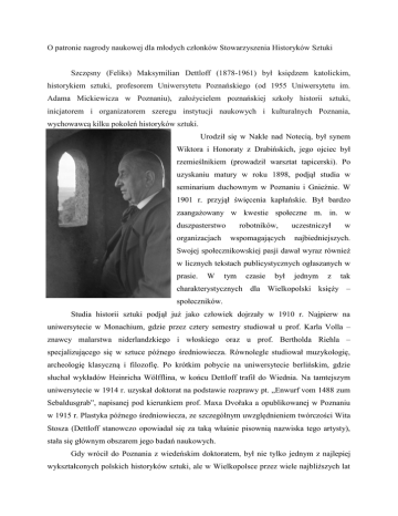 O patronie nagrody naukowej dla młodych członków Stowarzyszenia Historyków Sztuki Szczęsny (Feliks) Maksymilian Dettloff (1878-1961) był księdzem katolickim, historykiem sztuki, profesorem Uniwersytetu Poznańskiego (od 1955 Uniwersytetu im. Adama Mickiewicza w Poznaniu), założycielem poznańskiej szkoły historii sztuki, inicjatorem i organizatorem szeregu instytucji naukowych i kulturalnych Poznania, wychowawcą kilku pokoleń historyków sztuki. Urodził się w Nakle nad Notecią, był synem Wiktora i Honoraty z Drabińskich, jego ojciec był rzemieślnikiem (prowadził warsztat tapicerski). Po uzyskaniu matury w roku 1898, podjął studia w seminarium duchownym w Poznaniu i Gnieźnie. W 1901 r. przyjął święcenia kapłańskie. Był bardzo zaangażowany w kwestie społeczne m. in. w duszpasterstwo robotników, organizacjach wspomagających uczestniczył w najbiedniejszych. Swojej społecznikowskiej pasji dawał wyraz również w licznych tekstach publicystycznych ogłaszanych w prasie. W tym czasie był jednym z tak charakterystycznych dla Wielkopolski księży – społeczników. Studia historii sztuki podjął już jako człowiek dojrzały w 1910 r. Najpierw na uniwersytecie w Monachium, gdzie przez cztery semestry studiował u prof. Karla Volla – znawcy malarstwa niderlandzkiego i włoskiego oraz u prof. Bertholda Riehla – specjalizującego się w sztuce późnego średniowiecza. Równolegle studiował muzykologię, archeologię klasyczną i filozofię. Po krótkim pobycie na uniwersytecie berlińskim, gdzie słuchał wykładów Heinricha Wölfflina, w końcu Dettloff trafił do Wiednia. Na tamtejszym uniwersytecie w 1914 r. uzyskał doktorat na podstawie rozprawy pt. „Enwurf vom 1488 zum Sebaldusgrab”, napisanej pod kierunkiem prof. Maxa Dvořaka a opublikowanej w Poznaniu w 1915 r. Plastyka późnego średniowiecza, ze szczególnym uwzględnieniem twórczości Wita Stosza (Dettloff stanowczo opowiadał się za taką właśnie pisownią nazwiska tego artysty), stała się głównym obszarem jego badań naukowych. Gdy wrócił do Poznania z wiedeńskim doktoratem, był nie tylko jednym z najlepiej wykształconych polskich historyków sztuki, ale w Wielkopolsce przez wiele najbliższych lat był w ogóle jedynym. Angażował się i był angażowany w wiele inicjatyw. Rozwinął szeroką działalność publicystyczną, ogłaszając m. in. artykuły popularyzujące zagadnienia historii sztuki i opieki nad zabytkami. U początków większości poznańskich instytucji związanych z szeroko pojętą historią sztuki – muzealnictwa, służb konserwatorskich, uczelni, społecznego ruchu naukowego – stała inicjatywa i niestrudzona organicznikowska praca księdza Dettloffa. Był m. in. od 1914 r. kierownikiem galerii malarstwa Muzeum im. Mielżyńskich przy Poznańskim Towarzystwie Przyjaciół Nauk. W 1916 r. powierzono mu funkcję dyrektora Muzeum Archidiecezjalnego w Poznaniu. Rok później mianowany został diecezjalnym konserwatorem zabytków, a w 1918 r. przez kilka miesięcy wspólnie z Józefem Kostrzewskim kierował Muzeum Wielkopolskim (wcześniejszym Kaiser-Friedrich-Museum). Odrodzenie Polski dało dodatkowe impulsy dla i tak niezwykłej aktywności społecznej Szczęsnego Dettloffa. Był jednym z inicjatorów powołania w 1919 r. w Poznaniu wyższych uczelni artystycznych – plastycznej (Szkoły Zdobniczej) i muzycznej (Konserwatorium Muzycznego). W Poznańskim Towarzystwie Przyjaciół Nauk powołał w 1921 r. Komisję Historii Sztuki oraz serię wydawniczą: Prace Komisji Historii Sztuki. Głównym polem działalności stał się jednak powstający przy jego znaczącym udziale Uniwersytet Poznański. Pojawienie się i rozwój uniwersyteckiej historii sztuki w Poznaniu jest także jego zasługą. Już w czasie I wojny w latach 1917 i 1918 – prowadził wykłady z historii sztuki w ramach Towarzystwa Wykładów Naukowych, będącego zalążkiem polskiego uniwersytetu, który rzeczywiście mógł powstać po kapitulacji Niemiec. 11. listopada 1918 r. powstała Komisja Organizacyjna Uniwersytetu Polskiego w Poznaniu, a już od maja 1919 r. rozpoczęły się zajęcia dydaktyczne. Kierownikiem Seminarium Historii Sztuki został ks. dr Szczęsny Dettloff. Już w 1920 r. mianowany został na profesora nadzwyczajnego a w 1924 r. uzyskał profesurę zwyczajną. Kolejne lata wypełniła intensywna praca naukowa i dydaktyczna. liczne uczniów grono Wykształcił wybitnych obejmujących stanowiska na wyższych uczelniach, w muzeach, w instytutach badawczych, w służbach konserwatorskich. Swoją nieprzeciętną osobowością określił charakter poznańskiego środowiska historyków sztuki. W 1925 r. uczestniczył w komisji rządowej do spraw rewindykacji dzieł sztuki z ZSRS. Dettloff był znawcą sztuki, przywiązywał wielką wagę do poznania zabytków z autopsji – odbył kilkadziesiąt podróży naukowych, starał się także umożliwić takie wyjazdy studentom organizując je i zapewniając ich finansowanie. We wspomnieniach jego uczniów zgodnie podkreślane są szczególne zaangażowanie i pedagogiczny dar oraz wyjątkowa osobowość prof. Dettloffa. Na początku okupacji w październiku 1939 r. uwięziony przez Niemców jako zakładnik, został uwolniony 4 grudnia dzięki wstawiennictwu niemieckiego historyka sztuki – prof. K. H. Clasena z Królewca. Wywieziony do Generalnej Guberni, do końca okupacji przebywał w Zakopanem i Nowym Targu utrzymując się z pracy biurowej. W 1944 r. uczestniczył jako wykładowca i egzaminator w pracach tajnego Uniwersytetu Ziem Zachodnich w Częstochowie. Już w kwietniu 1945 r. po powrocie do Poznania podjął pracę na Uniwersytecie odbudowując Katedrę Historii Sztuki i przywracając do życia środowisko naukowe. 20 marca 1953 r. został zwolniony z Uniwersytetu, którego był współzałożycielem i który po wojnie odbudowywał. Powodem był donos o niestosownych (według donosiciela) komentarzach Dettloffa o