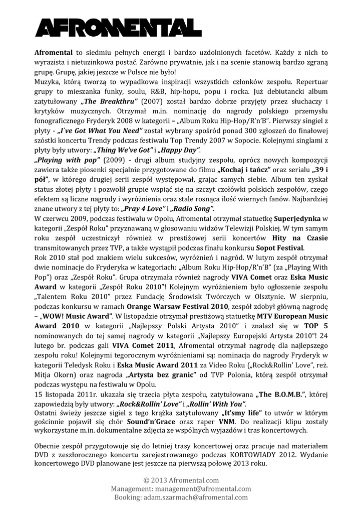 Afromental to siedmiu pełnych energii i bardzo uzdolnionych facetów. Każdy z nich to wyrazista i nietuzinkowa postać. Zarówno prywatnie, jak i na scenie stanowią bardzo zgraną grupę. Grupę, jakiej jeszcze w Polsce nie było! Muzyka, którą tworzą to wypadkowa inspiracji wszystkich członków zespołu. Repertuar grupy to mieszanka funky, soulu, R&B, hip-‐hopu, popu i rocka. Już debiutancki album zatytułowany „The Breakthru” (2007) został bardzo dobrze przyjęty przez słuchaczy i krytyków muzycznych. Otrzymał m.in. nominację do nagrody polskiego przemysłu fonograficznego Fryderyk 2008 w kategorii – „Album Roku Hip-‐Hop/R’n’B”. Pierwszy singiel z płyty -‐ „I`ve Got What You Need” został wybrany spośród ponad 300 zgłoszeń do finałowej szóstki koncertu Trendy podczas festiwalu Top Trendy 2007 w Sopocie. Kolejnymi singlami z płyty były utwory: „Thing We’ve Got” i „Happy Day”. „Playing with pop” (2009) -‐ drugi album studyjny zespołu, oprócz nowych kompozycji zawiera także piosenki specjalnie przygotowane do filmu „Kochaj i tańcz” oraz serialu „39 i pół”, w którego drugiej serii zespół występował, grając samych siebie. Album ten zyskał status złotej płyty i pozwolił grupie wspiąć się na szczyt czołówki polskich zespołów, czego efektem są liczne nagrody i wyróżnienia oraz stale rosnąca ilość wiernych fanów. Najbardziej znane utwory z tej płyty to: „Pray 4 Love” i „Radio Song”. W czerwcu 2009, podczas festiwalu w Opolu, Afromental otrzymał statuetkę Superjedynka w kategorii „Zespół Roku” przyznawaną w głosowaniu widzów Telewizji Polskiej. W tym samym roku zespół uczestniczył również w prestiżowej serii koncertów Hity na Czasie transmitowanych przez TVP, a także wystąpił podczas finału konkursu Sopot Festival. Rok 2010 stał pod znakiem wielu sukcesów, wyróżnień i nagród. W lutym zespół otrzymał dwie nominacje do Fryderyka w kategoriach: „Album Roku Hip-‐Hop/R’n’B” (za „Playing With Pop”) oraz „Zespół Roku”. Grupa otrzymała również nagrody VIVA Comet oraz Eska Music Award w kategorii „Zespół Roku 2010”! Kolejnym wyróżnieniem było ogłoszenie zespołu „Talentem Roku 2010” przez Fundację Środowisk Twórczych w Olsztynie. W sierpniu, podczas konkursu w ramach Orange Warsaw Festival 2010, zespół zdobył główną nagrodę – „WOW! Music Award”. W listopadzie otrzymał prestiżową statuetkę MTV European Music Award 2010 w kategorii „Najlepszy Polski Artysta 2010” i znalazł się w TOP 5 nominowanych do tej samej nagrody w kategorii „Najlepszy Europejski Artysta 2010”! 24 lutego br. podczas gali VIVA Comet 2011, Afromental otrzymał nagrodę dla najlepszego zespołu roku! Kolejnymi tegorocznym wyróżnieniami są: nominacja do nagrody Fryderyk w kategorii Teledysk Roku i Eska Music Award 2011 za Video Roku („Rock&Rollin’ Love”, reż. Mitja Okorn) oraz nagroda „Artysta bez granic” od TVP Polonia, którą zespół otrzymał podczas występu na festiwalu w Opolu. 15 listopada 2011r. ukazała się trzecia płyta zespołu, zatytułowana „The B.O.M.B.”, której zapowiedzią były utwory: „Rock&Rollin’ Love” i „Rollin’ With You”. Ostatni świeży jeszcze sigiel z tego krążka zatytułowany „Itʼsmy life” to utwór w którym gościnnie pojawił się chór SoundʻnʼGrace oraz raper VNM. Do realizacji klipu zostały wykorzystane m.in. dokumentalne zdjęcia ze wspólnych wyjazdów i tras koncertowych. Obecnie zespół przygotowuje się do letniej trasy koncertowej oraz pracuje nad materiałem DVD z zeszłorocznego koncertu zarejestrowanego podczas KORTOWIADY 2012. Wydanie koncertowego DVD planowane jest jeszcze na pierwszą połowę 2013 roku. © 2013 Afromental.com Management: [email protected] Booking: [email protected] Afromental w tym roku zdominował również wiosenne ramówki telewizyjne. Wojtka „Łozo” Łozowskiego można po raz kolejny zobaczyć w roli jurora w piątej już edycji programu „Must be the Music”, a Tomsona ( Tomasza Lacha ) i Barona (Aleksandra Milwiw-‐Barona) jako trenerów w drugiej edycji programu „The voice od Poland”. Afromental to: Łozo (Wojciech Łozowski -‐ wokal), Tomson (Tomasz Lach – wokal), Śniady (Bartosz Śniadecki -‐ instr. klawiszowe), Baron (Aleksander Milwiw-‐Baron – gitara), Lajan (Wojciech Witczak – bas), Torres (Tomasz Torres -‐ perkusja), Dziamas (Grzegorz Dziamka -‐ instr. perkusyjne). © 2013 Afromental.com Management: [email protected] Booking: [email protected]