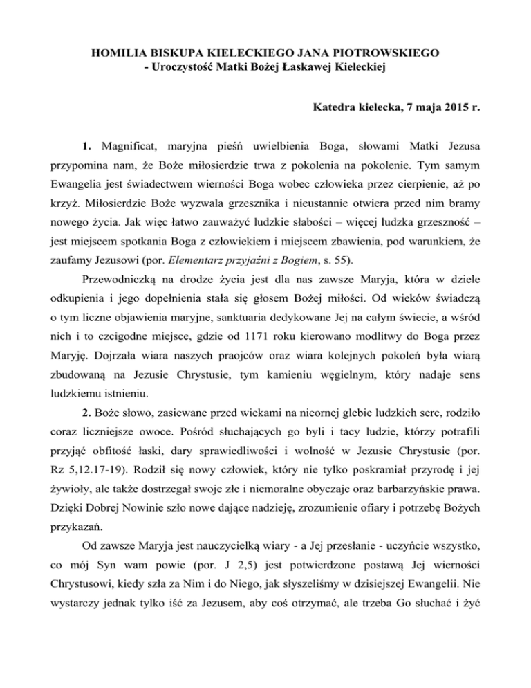 HOMILIA BISKUPA KIELECKIEGO JANA PIOTROWSKIEGO - Uroczystość Matki Bożej Łaskawej Kieleckiej Katedra kielecka, 7 maja 2015 r. 1. Magnificat, maryjna pieśń uwielbienia Boga, słowami Matki Jezusa przypomina nam, że Boże miłosierdzie trwa z pokolenia na pokolenie. Tym samym Ewangelia jest świadectwem wierności Boga wobec człowieka przez cierpienie, aż po krzyż. Miłosierdzie Boże wyzwala grzesznika i nieustannie otwiera przed nim bramy nowego życia. Jak więc łatwo zauważyć ludzkie słabości – więcej ludzka grzeszność – jest miejscem spotkania Boga z człowiekiem i miejscem zbawienia, pod warunkiem, że zaufamy Jezusowi (por. Elementarz przyjaźni z Bogiem, s. 55). Przewodniczką na drodze życia jest dla nas zawsze Maryja, która w dziele odkupienia i jego dopełnienia stała się głosem Bożej miłości. Od wieków świadczą o tym liczne objawienia maryjne, sanktuaria dedykowane Jej na całym świecie, a wśród nich i to czcigodne miejsce, gdzie od 1171 roku kierowano modlitwy do Boga przez Maryję. Dojrzała wiara naszych praojców oraz wiara kolejnych pokoleń była wiarą zbudowaną na Jezusie Chrystusie, tym kamieniu węgielnym, który nadaje sens ludzkiemu istnieniu. 2. Boże słowo, zasiewane przed wiekami na nieornej glebie ludzkich serc, rodziło coraz liczniejsze owoce. Pośród słuchających go byli i tacy ludzie, którzy potrafili przyjąć obfitość łaski, dary sprawiedliwości i wolność w Jezusie Chrystusie (por. Rz 5,12.17-19). Rodził się nowy człowiek, który nie tylko poskramiał przyrodę i jej żywioły, ale także dostrzegał swoje złe i niemoralne obyczaje oraz barbarzyńskie prawa. Dzięki Dobrej Nowinie szło nowe dające nadzieję, zrozumienie ofiary i potrzebę Bożych przykazań. Od zawsze Maryja jest nauczycielką wiary - a Jej przesłanie - uczyńcie wszystko, co mój Syn wam powie (por. J 2,5) jest potwierdzone postawą Jej wierności Chrystusowi, kiedy szła za Nim i do Niego, jak słyszeliśmy w dzisiejszej Ewangelii. Nie wystarczy jednak tylko iść za Jezusem, aby coś otrzymać, ale trzeba Go słuchać i żyć Jego płodnym nauczaniem przez wypełnianie woli Ojca. To jest dopiero prawdziwa wiara i prawdziwa rodzina Jezusa Chrystusa (por. Mt 12,46-50). 3. Dziś, kiedy w ten majowy i odpustowy wieczór oddajemy cześć Matce Bożej Łaskawej Kieleckiej, w duchu dojrzałości naszej wiary, chcemy zobaczyć siebie tak, jak chce nas widzieć Maryja. Czy wierzymy, że Jezus jest Okupicielem człowieka i najdoskonalej objawia nam pardwę o Bogu Ojcu, który jest miłością? Jezus, Syn Boży - jak nauczał Jan Paweł II w Masłowie w 1991 r. - chce nas przywrócić Ojcu. Tak często zbyt głęboko i niemoralnie jesteśmy uwikłani w sprawy świata, aby uczciwie powtarzać modlitwę „Ojcze nasz”. Mimo, że człowiek poznał Boga to zaćmione zostało jego serce i dziś służy raczej stworzeniu i jego przeróżnym zachciankom, modom i pomysłom niż Bogu Stworzycielowi (por. Rz 1,21-25). Każdy, kto prawdziwie kocha swoją matkę słucha jej z uwagą i to, co ona mówi przyjmuje z miłością. Wspólnota Kościoła, którą tworzymy jest przestrzenią słuchania i naśladowania Tej, która wiernie szła w pielgrzymce wiary z Synem aż do Krzyża, ale była tez „służebnicą Pańską”, którą Syn pozostawił jako Matkę wśród rodzącego się Kościoła: „Oto Matka twoja”. Tu zaczęła się kształtować łączność pomiędzy Matką a Kościołem, ponieważ rodzący się Kościół jest owocem Krzyża i zmartwychwstania Jej Syna. Maryja, która oddała się bez reszty osobie i dziełu Jezusa, swoje macierzyństwo przenosi na Kościół. Wstawia się za wszystkimi swoimi dziećmi i współdziała w zbawczym dziele Syna, Odkupiciela świata (por. Redemptoris Mater, 40). Matko Boża Łaskawa Kielecka, Pani o pięknym pełnym miłości obliczu. Wstawiaj się za nami, jako Stolica Mądrości i ucz nas mądrości dla siebie samych, dla naszych rodzin, naszej diecezji i naszej ojczyzny. Królowo Pokoju niech dzięki Twojemu wstawiennictwu zagości pokój w sercach Polaków, pokój Twojego Syna Jezusa Chrystusa. Wspomożenie Wiernych pomóż nam, aby dla Chrystusa prawdziwie otwierały się ludzkie serca, aby dobre obyczaje, ewangeliczna moralność i sprawiedliwość społeczna były znakiem, że zgodnie z Twoim życzeniem wypełniamy to, co mówi nam Twój Syn. Amen.