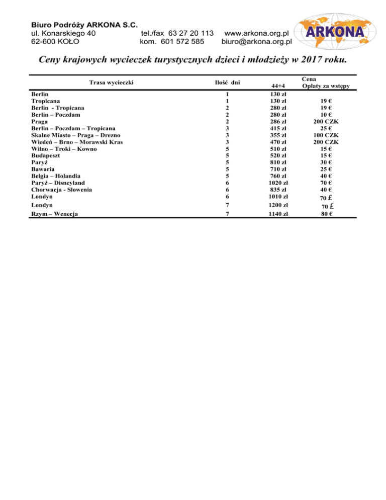 Biuro Podróży ARKONA S.C. ul. Konarskiego 40 tel./fax 63 27 20 113 62-600 KOŁO kom. 601 572 585 www.arkona.org.pl [email protected] Ceny krajowych wycieczek turystycznych dzieci i młodzieży w 2017 roku. Trasa wycieczki Berlin Tropicana Berlin - Tropicana Berlin – Poczdam Praga Berlin – Poczdam – Tropicana Skalne Miasto – Praga – Drezno Wiedeń – Brno – Morawski Kras Wilno – Troki – Kowno Budapeszt Paryż Bawaria Belgia – Holandia Paryż – Disneyland Chorwacja - Słowenia Londyn Londyn Rzym – Wenecja Ilość dni 1 1 2 2 2 3 3 3 5 5 5 5 5 6 6 6 7 7 44+4 130 zł 130 zł 280 zł 280 zł 286 zł 415 zł 355 zł 470 zł 510 zł 520 zł 810 zł 710 zł 760 zł 1020 zł 835 zł 1010 zł 1200 zł 1140 zł Cena Opłaty za wstępy 19 € 19 € 10 € 200 CZK 25 € 100 CZK 200 CZK 15 € 15 € 30 € 25 € 40 € 70 € 40 € 70 £ 70 £ 80 €