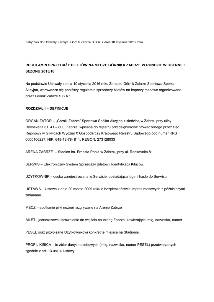 Załącznik do Uchwały Zarządu Górnik Zabrze S.S.A z dnia 10 stycznia 2016 roku REGULAMIN SPRZEDAŻY BILETÓW NA MECZE GÓRNIKA ZABRZE W RUNDZIE WIOSENNEJ SEZONU 2015/16 Na podstawie Uchwały z dnia 10 stycznia 2016 roku Zarządu Górnik Zabrze Sportowa Spółka Akcyjna, wprowadza się poniższy regulamin sprzedaży biletów na imprezy masowe organizowane przez Górnik Zabrze S.S.A.: ROZDZIAŁ I – DEFINICJE ORGANIZATOR – „Górnik Zabrze” Sportowa Spółka Akcyjna z siedzibą w Zabrzu przy ulicy Roosevelta 81, 41 – 800 Zabrze, wpisana do rejestru przedsiębiorców prowadzonego przez Sąd Rejonowy w Gliwicach Wydział X Gospodarczy Krajowego Rejestru Sądowego pod numer KRS 0000106227, NIP: 648-12-78- 811, REGON: 273128033 ARENA ZABRZE – Stadion im. Ernesta Pohla w Zabrzu, przy ul. Roosevelta 81. SERWIS – Elektroniczny System Sprzedaży Biletów i Identyfikacji Kibiców. UŻYTKOWNIK – osoba zarejestrowana w Serwisie, posiadająca login i hasło do Serwisu. USTAWA – Ustawa z dnia 20 marca 2009 roku o bezpieczeństwie imprez masowych z późniejszymi zmianami. MECZ – spotkanie piłki nożnej rozgrywane na Arenie Zabrze BILET– jednorazowe uprawnienie do wejścia na Arenę Zabrze, zawierające imię, nazwisko, numer PESEL oraz przypisane Użytkownikowi konkretne miejsce na Stadionie. PROFIL KIBICA – to zbiór danych osobowych (imię, nazwisko, numer PESEL) przetwarzanych zgodnie z art. 13 ust. 4 Ustawy. CENTRALNY SYSTEM IDENTYFIKACJI – KIBIC – system identyfikacji Kibiców prowadzony na podstawie art. 13 ust. 2a Ustawy, którego Administratorem jest podmiot prowadzący rozgrywki ligi zawodowej Ekstraklasa S.A. siedzibą w Warszawie ul. Wybrzeże Gdyńskie 6D. ROZDZIAŁ II - POSTANOWIENIA OGÓLNE 1. Elektroniczny System Sprzedaży Biletów i Identyfikacji Kibiców jest serwisem prowadzonym przez Organizatora w celu dystrybucji biletów, na potrzeby imprez masowych organizowanych z udziałem drużyny Górnik Zabrze na Arenie Zabrze. 2. Sprzedaż biletów w serwisie prowadzi Organizator. 3. Zakup biletu oraz korzystanie z serwisu https://bilety.arenazabrze.pl oznacza akceptację niniejszego regulaminu. 4. Umowa sprzedaży pomiędzy Użytkownikiem a Organizatorem zostaje zawarta w momencie uiszczenia zapłaty przez Użytkownika i otrzymania potwierdzenia zakupu biletu zawierającego imię, nazwisko i PESEL osoby na rzecz, której bilet został nabyty. Potwierdzenie dokonania transakcji jest dostępne w zakładce Twoje Zakupy w profilu nabywcy w serwisie https://bilety.arenazabrze.pl 5. Zakazuje się kopiowania i przerabiania oryginalnych biletów pod groźbą ich unieważnienia. 6. Bilet jest własnością osoby, której dane osobowe są przypisane do danego dokumentu i nie może być udostępniany innej osobie. 7. Wykorzystując bilet Użytkownik akceptuje ogólne warunki i zasady ustalone przez Organizatora oraz oświadcza, iż zapoznał się z regulaminem obiektu oraz regulaminem imprezy masowej. 8. Użytkownik oświadcza, że będzie korzystał z Elektronicznego Systemu Sprzedaży Biletów i Identyfikacji Kibiców wyłącznie w celu zakupu biletu. 9. Organizator nie ponosi odpowiedzialności za niezawiniony przez Organizatora brak możliwości korzystania przez Użytkowników z serwisu. 10. Biletów nie sprzedaje się: a) osobie wobec której zostało wydane orzeczenie zakazujące wstępu na imprezę masową lub orzeczenie zobowiązujące do powstrzymywania się od przebywania w miejscach przeprowadzania imprez masowych wydane przez sąd w związku z warunkowym zawieszeniem wykonania kary pozbawienia wolności; b) osobie wobec której został wydany zakaz stadionowy nałożony przez uprawnione do tego podmioty innych państw; c) osobie wobec której został wydany zakaz klubowy; d) osobie, co do której zachodzi uzasadnione podejrzenie, że w miejscu i w czasie trwania imprezy masowej może stwarzać zagrożenie dla bezpieczeństwa imprezy masowej. ROZDZIAŁ III - OGÓLNE ZASADY SPRZEDAŻY BILETÓW W SERWISIE www.bilety.arenazabrze.pl 1. Serwis www.bilety.arenazabrze.pl jest serwisem sprzedaży prowadzonym przez Organizatora w celu dystrybucji biletów na imprezy masowe organizowane z udziałem drużyny Górnik Zabrze na Arenie Zabrze. 2. Realizacja płatności w systemie sprzedaży on-line przebiega zgodnie z regulaminem operatora systemu PayU S.A. (z siedzibą w Poznaniu ul. Marcelińska 90). Zapłata jest regulowana przez Użytkownika z własnego konta bankowego lub za pomocą karty kredytowej. 3. System płatności on-line obsługuje następujące sposoby płatności: a) KARTA KREDYTOWA: MasterCard, VISA, Diners Club, b) Szybki przelew bankowy ON LINE: MTransfer, Multi Transfer, Inteligo, Przelew 24, iPKO, Nordea, Pekao24Przelew, Lukas e-przelew, Przelew z Millennium, Przelew Eurobank, Przelew ING. 4. Cena biletu wskazana w cenniku jest ceną brutto i zawiera w sobie wszelkie opłaty manipulacyjne związane z transakcją w serwisie. W związku z powyższym kibic nie będzie obciążony żadnymi opłatami dodatkowymi. 5. Dokonanie zakupu biletu jest możliwe najpóźniej do 4 godzin przed planowanym rozpoczęciem meczu. 6. W celu dokonania zakupu należy zarejestrować się w serwisie www.bilety.arenazabrze.pl zgodnie z procedurą opisaną w Rozdziale IV niniejszego regulaminu 7. Na jednego zarejestrowanego kibica przypada jeden bilet na dany mecz. 8. Każda umowa rejestrowana jest w systemie informatycznym Organizatora. 9. Kwota należności wynikająca z zamówienia winna zostać zrealizowana natychmiast po dokonaniu zamówienia. Bilety pozostają własnością Organizatora do momentu odnotowania płatności na jego rachunku. Złożona rezerwacja pozostaje ważna przez 12 godzin z zastrzeżeniem, że wszelkie nieopłacone rezerwacje zostają anulowane na 72 godziny przed rozpoczęciem danego meczu. 10. W przypadku nie odnotowania w serwisie wpłaty w wymaganym terminie Organizator zastrzega sobie prawo unieważnienia zamówienia. Transakcja zostanie anulowan