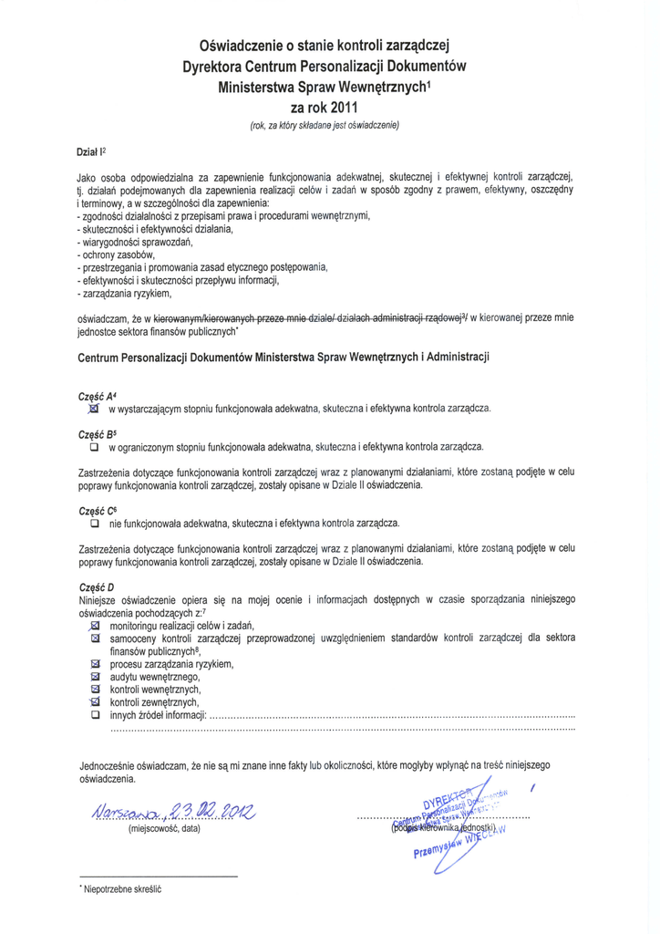 Oświadczenie o stanie kontroli zarządczej Dyrektora Centrum Personalizacji Dokumentów Ministerstwa Spraw Wewn~trznych1 za rok 2011 (rok, za który składane jest oświadczenie) Dział 12 Jako osoba odpowiedzialna za zapewnienie funkcjonowania adekwatnej, skutecznej i efektywnej kontroli zarządczej, tj. działań podejmowanych dla zapewnienia realizacji celów i zadań w sposób zgodny z prawem, efektywny, oszcz~dny i terminowy, a w szczególności dla zapewnienia: - zgodności działalności z przepisami prawa i procedurami wewn~trznymi, - skuteczności i efektywności działania, - wiarygodności sprawozdań, - ochrony zasobów, - przestrzegania i promowania zasad etycznego post~powania, - efektywności i skuteczności przepływu informacji, - zarządzania ryzykiem, oświadczam, że w kiorowanym/kierowanych jednostce sektora finansów publicznych' przeze FRRiedziale! działach administracji rządowoj3t w kierowanej przeze mnie Centrum Personalizacji Dokumentów Ministerstwa Spraw Wewn~trznychi Administracji CZQŚĆA4 )iD w wystarczającym stopniu funkcjonowała adekwatna, skuteczna i efektywna kontrola zarządcza. B5 D w ograniczonym stopniu funkcjonowała adekwatna, skuteczna i efektywna kontrola zarządcza. CZQŚĆ Zastrzeżenia dotyczące funkcjonowania kontroli zarządczej wraz z planowanymi działaniami, które zostaną podj~te w celu poprawy funkcjonowania kontroli zarządczej, zostały opisane w Dziale II oświadczenia. CZQŚĆ D C6 nie funkcjonowała adekwatna, skuteczna i efektywna kontrola zarządcza. Zastrzeżenia dotyczące funkcjonowania kontroli zarządczej wraz z planowanymi działaniami, które zostaną podj~te w celu poprawy funkcjonowania kontroli zarządczej, zostały opisane w Dziale II oświadczenia. CZQŚĆ D Niniejsze oświadczenie opiera si~ na mojej ocenie informacjach dost~pnych w czasie sporządzania niniejszego oświadczenia pochodzących Z:7 ,El monitoringu realizacji celów i zadań, ~ samooceny kontroli zarządczej przeprowadzonej uwzgl~dnieniem standardów kontroli zarządczej dla sektora finansów publicznych8, S procesu zarządzania ryzykiem, ~ audytu wewn~trznego, S kontroli wewn~trznych, 'SI kontroli zewn~trznych, D innych żródeł informacji: . Jednocześnie oświadczam, że nie są mi znane inne fakty lub okoliczności, które mogłyby wpłynąć na treść niniejszego oświadczenia. ;(/tm?~'ł ..e.'?, /14...t:t!1.u (miejscowość, data) , Niepotrzebne skreślić Dział 119 1. Zastrzeżenia dotyczące funkcjonowania kontroli zarządczej w roku ubiegłym . ...................................................................................................................................................................... ...................................................................................................................................................................... ...................................................................................................................................................................... Należy opisać przyczyny złożenia zastrzeżeń w zakresie funkcjonowania kontroli zarządczej, np. istotną słabość kontroli zarządczej, istotną nieprawidłowość w funkcjonowaniu jednostki sektora finansów publicznych albo działu administracji rządowej, istotny cel lub zadanie, które nie zostały zrealizowane, niewystarczający monitoring kontroli zarządczej, wraz z podaniem, jeżeli jest to możliwe, elementu, którego zastrzeżenia dotyczą, w szczególności: zgodność działalności z przepisami prawa oraz procedurami wewnlitrznymi, skuteczności i efektywności działania, wiarygodności sprawozdań, ochrony zasobów, przestrzegania i promowania etycznego Postlipowania, efektywności i skuteczności przepływu informacji lub zarządzania ryzykiem. 2. Planowane działania, które zostaną podj~te w celu poprawy funkcjonowania kontroli zarządczej . ...................................................................................................................................................................... ...................................................................................................................................................................... ...................................................................................................................................................................... Należy opisać kluczowe działania, które zostaną podjlite w celu poprawy funkcjonowania kontroli zarządczej w odniesieniu do złożonych zastrzeżeń, wraz z podaniem terminu ich realizacji. Dział 11110 Działania, które zostały podj~te w ubiegłym roku w celu poprawy funkcjonowania kontroli zarządczej. 1. Działania, które zostały zaplanowane na rok, którego dotyczy oświadczenie: ................................................................................................................................................................... ...................................................................................................................................................................... ...................................................................................................................................................................... Należy opisać najistotniejsze działania, jakie zostały podjlite w roku, którego dotyczy niniejsze oświadczenie w odniesieniu do planowanych działań wskazanych w dziale " oświadczenia za rok poprzedzający rok, którego dotyczy niniejsze oświadczenie. W oświadczeniu za rok 2010 nie wypełnia sili tego punktu. 2. Pozostałe działania: ...................................................................................................................................................................... ....................................................................................................................................................................