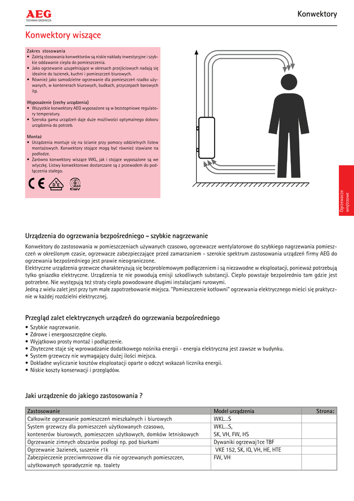Konwektory Konwektory wisz¹ce Zakres stosowania • Zalet¹ stosowania konwektorów s¹ niskie nak³ady inwestycyjne i szybkie oddawanie ciep³a do pomieszczenia. • Jako ogrzewanie uzupe³niaj¹ce w okresach przejœciowych nadaj¹ siê idealnie do ³azienek, kuchni i pomieszczeñ biurowych. • Równie¿ jako samodzielne ogrzewanie dla pomieszczeñ rzadko u¿ywanych, w kontenerach biurowych, budkach, przyczepach barowych itp. Wyposa¿enie (cechy urz¹dzenia) • Wszystkie konwektory AEG wyposa¿one s¹ w bezstopniowe regulatory temperatury. • Szeroka gama urz¹dzeñ daje du¿e mo¿liwoœci optymalnego doboru urz¹dzenia do potrzeb. Ogrzewacze wnêtrzowe Monta¿ • Urz¹dzenia montuje siê na œcianie przy pomocy oddzielnych listew monta¿owych. Konwektory stoj¹ce mog¹ byæ równie¿ stawiane na pod³odze. • Zarówno konwektory wisz¹ce WKL, jak i stoj¹ce wyposa¿one s¹ we wtyczkê. Listwy konwektorowe dostarczane s¹ z przewodem do pod³¹czenia sta³ego. Urz¹dzenia do ogrzewania bezpoœredniego - szybkie nagrzewanie Konwektory do zastosowania w pomieszczeniach u¿ywanych czasowo, ogrzewacze wentylatorowe do szybkiego nagrzewania pomieszczeñ w okreœlonym czasie, ogrzewacze zabezpieczaj¹ce przed zamarzaniem - szerokie spektrum zastosowania urz¹dzeñ firmy AEG do ogrzewania bezpoœredniego jest prawie nieograniczone. Elektryczne urz¹dzenia grzewcze charakteryzuj¹ siê bezproblemowym pod³¹czeniem i s¹ niezawodne w eksploatacji, poniewa¿ potrzebuj¹ tylko gniazdko elektryczne. Urz¹dzenia te nie powoduj¹ emisji szkodliwych substancji. Ciep³o powstaje bezpoœrednio tam gdzie jest potrzebne. Nie wystêpuj¹ te¿ straty ciep³a powodowane d³ugimi instalacjami rurowymi. Jedn¹ z wielu zalet jest przy tym ma³e zapotrzebowanie miejsca. "Pomieszczenie kot³owni" ogrzewania elektrycznego mieœci siê praktycznie w ka¿dej rozdzielni elektrycznej. Przegl¹d zalet elektrycznych urz¹dzeñ do ogrzewania bezpoœredniego • • • • • • • Szybkie nagrzewanie. Zdrowe i energooszczêdne ciep³o. Wyj¹tkowo prosty monta¿ i pod³¹czenie. Zbyteczne staje siê wprowadzanie dodatkowego noœnika energii - energia elektryczna jest zawsze w budynku. System grzewczy nie wymagaj¹cy du¿ej iloœci miejsca. Dok³adne wyliczanie kosztów eksploatacji oparte o odczyt wskazañ licznika energii. Niskie koszty konserwacji i przegl¹dów. Jaki urz¹dzenie do jakiego zastosowania ? Zastosowanie Ca³kowite ogrzewanie pomieszczeñ mieszkalnych i biurowych System grzewczy dla pomieszczeñ u¿ytkowanych czasowo, kontenerów biurowych, pomieszczen u¿ytkowych, domków letniskowych Ogrzewanie zimnych obszarów pod³ogi np. pod biurkami Ogrzewanie 3azienek, suszenie r1k Zabezpieczenie przeciwmrozowe dla nie ogrzewanych pomieszczen, u¿ytkowanych sporadycznie np. toalety Model urz¹dzenia WKL...S WKL...S, SK, VH, FW, HS Dywaniki ogrzewaj1ce TBF VKE 152, SK, IQ, VH, HE, HTE FW, VH Strona: 43 Konwektory Konwektory wisz¹ce WKL • • • • Odczyt nastaw elementów obs³ugowych odbywa siê z góry. Oddzielne listwy monta¿owe. Ochrona przeciwbryzgowa IP 24, klasa bezpieczeñstwa II. Obudowa i kratki powietrza w kolorze alpin-weiß (bia³y alpejski) podobny do RAL 9016. • Ogranicznik temperatury bezpieczeñstwa z funkcj¹ samoczynnego odblokowania. • Pod³¹czenie przewodem o d³ugoœci 1 m, z wtyczk¹. • Dobór mocy zgodny z zapotrzebowaniem. • Bezstopniowy dobór temperatury w zakresie pomiêdzy 6OC i 30OC, z pozycj¹ zabezpieczenia przeciwmrozowego. • Mo¿liwoœæ ograniczenia zakresu regulatora temperatury. • Mechaniczny regulator temperatury. • Grza³ki ze stali nierdzewnej z aluminiowymi lamelami. • Wy³¹cznik W£. / WY£. umieszczony w górnym prawym rogu. WKL 1003 S WKL 503 S 370 Ogrzewacze wnêtrzowe B WKL 753 S 445 WKL 1003 S 445 WKL 1503 S 590 WKL 2003 S 740 WKL 2503 S 890 WKL 3003 S 1040 Wymiary w mm Model Opis WKL WKL WKL WKL WKL WKL WKL Konwektor Konwektor Konwektor Konwektor Konwektor Konwektor Konwektor 503 S 753 S 1003 S 1503 S 2003 S 2503 S 3003 S Moc przy³¹czeniowa w W wisz¹cy wisz¹cy wisz¹cy wisz¹cy wisz¹cy wisz¹cy wisz¹cy Numer katalogowy 500 750 1000 1500 2000 2500 3000 220 220 220 221 221 221 221 996 997 998 000 002 003 004 Cena netto PLN 230,250,260,300,330,370,450,- Dane techniczne Model Napiêcie Moc grzewcza Stopnie mocy Zakres nastaw temperatur Zabezpieczenie przeciwmrozowe Rodzaj pod³¹czenia Klasa zabezpieczenia Rodzaj ochrony Ciê¿ar [V] [W] [W] [OC] [OC] [kg] WKL 503 S WKL 753 S WKL 1003 S 500 0-500 750 0-750 1000 0-1000 4,0 4,6 4,6 WKL 1503 S 1/N ~ 230 50 Hz 1500 0-1500 ok. 6 do 30 ok. 6 wtyczka II IP 24 6,0 WKL 2003 S WKL 2503 S WKL 3003 S 2000 0-2000 2500 0-2500 3000 0-3000 7,2 8,3 10,1 Konwektory Ogrzewacz ³azienkowy VKE, z suszark¹ do rêczników • Ogrzewacz ³azienkowy, a zarazem suszarka do rêczników, w jednym urz¹dzeniu. • Mo¿liwoœæ nastawiania rozprowadzania ciep³a przez konwekcjê lub przy pomocy dmuchawy. • Moc grzewcza 1500 W i wydajna dmuchawa zapewniaj¹ szybkie nagrzewanie. • Obudowa metalowa, lakierowana lakierem piecowym na kolor bia³y, z dwoma stabilnymi uchwytami do rêczników. • Bezstopniowa regulacja temperatury, od zabezpieczenia przeciwmrozowego do ok. 30OC, wy³¹cznik EIN / AUS (w³. / wy³.). Model Opis VKE 152 Ogrzewacz ³azienkowy • Moc grzewcza 700 W + ogrzewanie dmuchaw¹ 800 W. • Programator czasowy z mo¿liwoœci¹ nastaw w zakresie do 120 minut, dla nieregulowanej pracy dmuchawy. • Rodzaj ochrony IP 24, klasa bezpieczeñstwa II. • Specjalny uchwyt monta¿owy ze œrubami mocuj¹cymi zapewnia szybki i bezproblemowy monta¿. • Przewód zasilaj¹cy o d³ugoœci 1 m, do pod³¹czenia sta³ego. • Kolor: RAL 9016. Moc przy³¹czeniowa w W Numer katalogowy 1500 228 913 Cena netto PLN 1 750,- Ogrzewacze wnêtrzowe VKE 152 Konwektory stoj¹ce • SK 204: Konwektor stoj¹cy z trzema stopniami mocy grzewczej 750 W, 1250 W i 2000 W, wyposa¿ony w przewód zasilaj¹cy z wtyczk¹. • 