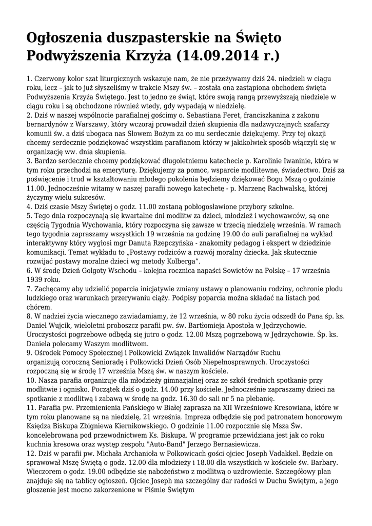 Ogłoszenia duszpasterskie na Święto Podwyższenia Krzyża (14.09.2014 r.) 1. Czerwony kolor szat liturgicznych wskazuje nam, że nie przeżywamy dziś 24. niedzieli w ciągu roku, lecz – jak to już słyszeliśmy w trakcie Mszy św. – została ona zastąpiona obchodem święta Podwyższenia Krzyża Świętego. Jest to jedno ze świąt, które swoją rangą przewyższają niedziele w ciągu roku i są obchodzone również wtedy, gdy wypadają w niedzielę. 2. Dziś w naszej wspólnocie parafialnej gościmy o. Sebastiana Feret, franciszkanina z zakonu bernardynów z Warszawy, który wczoraj prowadził dzień skupienia dla nadzwyczajnych szafarzy komunii św. a dziś ubogaca nas Słowem Bożym za co mu serdecznie dziękujemy. Przy tej okazji chcemy serdecznie podziękować wszystkim parafianom którzy w jakikolwiek sposób włączyli się w organizację ww. dnia skupienia. 3. Bardzo serdecznie chcemy podziękować długoletniemu katechecie p. Karolinie Iwaninie, która w tym roku przechodzi na emeryturę. Dziękujemy za pomoc, wsparcie modlitewne, świadectwo. Dziś za poświęcenie i trud w kształtowaniu młodego pokolenia będziemy dziękować Bogu Mszą o godzinie 11.00. Jednocześnie witamy w naszej parafii nowego katechetę - p. Marzenę Rachwalską, której życzymy wielu sukcesów. 4. Dziś czasie Mszy Świętej o godz. 11.00 zostaną pobłogosławione przybory szkolne. 5. Tego dnia rozpoczynają się kwartalne dni modlitw za dzieci, młodzież i wychowawców, są one częścią Tygodnia Wychowania, który rozpoczyna się zawsze w trzecią niedzielę września. W ramach tego tygodnia zapraszamy wszystkich 19 września na godzinę 19.00 do auli parafialnej na wykład interaktywny który wygłosi mgr Danuta Rzepczyńska - znakomity pedagog i ekspert w dziedzinie komunikacji. Temat wykładu to „Postawy rodziców a rozwój moralny dziecka. Jak skutecznie rozwijać postawy moralne dzieci wg metody Kolberga”. 6. W środę Dzień Golgoty Wschodu – kolejna rocznica napaści Sowietów na Polskę – 17 września 1939 roku. 7. Zachęcamy aby udzielić poparcia inicjatywie zmiany ustawy o planowaniu rodziny, ochronie płodu ludzkiego oraz warunkach przerywaniu ciąży. Podpisy poparcia można składać na listach pod chórem. 8. W nadziei życia wiecznego zawiadamiamy, że 12 września, w 80 roku życia odszedł do Pana śp. ks. Daniel Wujcik, wieloletni proboszcz parafii pw. św. Bartłomieja Apostoła w Jędrzychowie. Uroczystości pogrzebowe odbędą się jutro o godz. 12.00 Mszą pogrzebową w Jędrzychowie. Śp. ks. Daniela polecamy Waszym modlitwom. 9. Ośrodek Pomocy Społecznej i Polkowicki Związek Inwalidów Narządów Ruchu organizują coroczną Senioradę i Polkowicki Dzień Osób Niepełnosprawnych. Uroczystości rozpoczną się w środę 17 września Mszą św. w naszym kościele. 10. Nasza parafia organizuje dla młodzieży gimnazjalnej oraz ze szkół średnich spotkanie przy modlitwie i ognisko. Początek dziś o godz. 14.00 przy kościele. Jednocześnie zapraszamy dzieci na spotkanie z modlitwą i zabawą w środę na godz. 16.30 do sali nr 5 na plebanię. 11. Parafia pw. Przemienienia Pańskiego w Białej zaprasza na XII Wrześniowe Kresowiana, które w tym roku planowane są na niedzielę, 21 września. Impreza odbędzie się pod patronatem honorowym Księdza Biskupa Zbigniewa Kiernikowskiego. O godzinie 11.00 rozpocznie się Msza Św. koncelebrowana pod przewodnictwem Ks. Biskupa. W programie przewidziana jest jak co roku kuchnia kresowa oraz występ zespołu "Auto-Band" Jerzego Bernasiewicza. 12. Dziś w parafii pw. Michała Archanioła w Polkowicach gości ojciec Joseph Vadakkel. Będzie on sprawował Mszę Świętą o godz. 12.00 dla młodzieży i 18.00 dla wszystkich w kościele św. Barbary. Wieczorem o godz. 19.00 odbędzie się nabożeństwo z modlitwą o uzdrowienie. Szczegółowy plan znajduje się na tablicy ogłoszeń. Ojciec Joseph ma szczególny dar radości w Duchu Świętym, a jego głoszenie jest mocno zakorzenione w Piśmie Świętym 13. W kalendarzu liturgicznym pod datą 18 września, tj. najbliższy czwartek, przypada święto św. Stanisława Kostki, patrona polskiej młodzieży. Zapraszamy dzieci i młodzież na Mszę św. na godz. 18.00 14. Do sprzątania kościoła nikt nie przyszedł. Złożono ofiarę w wysokości 127 zł. Bóg zapłać. O pomoc w sprzątaniu kościoła w tym tygodniu prosimy parafian z ul. Ociosowej 80.