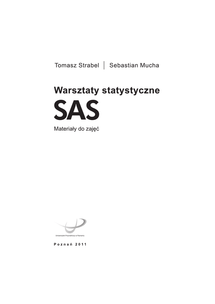 Przewodniczący Komitetu Redakcyjnego prof. dr hab. Waldemar Uchman Redaktor Dziaáu prof. dr hab. Jacek Wójtowski Recenzent dr hab. Zofia Hanusz, prof. Uniwersytetu Przyrodniczego w Lublinie © Copyright by Wydawnictwo Uniwersytetu Przyrodniczego w Poznaniu PoznaĔ 2011, Poland Utwór w caáoĞci ani we fragmentach nie moĪe byü powielany ani rozpowszechniany za pomocą urządzeĔ elektronicznych, kopiujących, nagrywających i innych bez pisemnej zgody posiadacza praw autorskich ISBN 978-83-7160-619-9 Redakcja Ewa Strycka Opracowanie komputerowe i projekt okáadki Exemplum WYDAWNICTWO UNIWERSYTETU PRZYRODNICZEGO W POZNANIU ul. Witosa 45, 61-693 PoznaĔ tel./fax 61 848 78 08, e-mail: [email protected] http://www.wydawnictwo.up-poznan.net Wydanie I. Ark. wyd. 7,4. Ark. druk. 6,3. Druk w Zakáadzie Graficznym Uniwersytetu Przyrodniczego w Poznaniu ul. Wojska Polskiego 67, 60-625 PoznaĔ e-mail: [email protected] SPIS TREĝCI WstĊp ........................................................................................................................................... 5 1. Przygotowanie danych ................................................................................................................ Zasady przygotowania danych........................................................................................... Rodzaje zmiennych ............................................................................................................ Zasady nazywania zmiennych ........................................................................................... Uruchamianie programu w Ğrodowisku Windows............................................................... Problem z uruchamianiem.................................................................................................. Ukáad programu SAS.......................................................................................................... Wprowadzanie danych do systemu SAS ........................................................................... Wprowadzanie danych z klawiatury............................................................................. WyĞwietlanie wczytanych danych................................................................................ Wprowadzanie danych z pliku tekstowego .................................................................. Biblioteki....................................................................................................................... Import danych z arkusza kalkulacyjnego Excel ........................................................... Brakujące obserwacje ........................................................................................................ Przydatne informacje.......................................................................................................... W razie problemów............................................................................................................. Zadania .............................................................................................................................. 7 7 7 8 8 8 9 9 10 10 11 12 12 13 13 14 14 2. Zaawansowane wprowadzanie danych .................................................................................... Importowanie danych do systemu SAS.............................................................................. Formaty wprowadzania danych (informants) ..................................................................... Tymczasowe i staáe bazy danych SAS............................................................................... Eksport danych do plików tekstowych................................................................................ Opcje przydatne przy wczytywaniu plików tekstowych....................................................... Wprowadzanie danych z róĪnymi typami separatorów pól ................................................ Zadania .............................................................................................................................. 15 15 15 18 18 19 23 24 3. Podstawowe statystyki i badanie rozkáadów............................................................................. Miary poáoĪenia i rozrzutu .................................................................................................. Sortowanie ......................................................................................................................... Opcje przydatne przy dáugich wydrukach........................................................................... Przedziaáy ufnoĞci dla Ğredniej ........................................................................................... Tablica kontyngnencji......................................................................................................... Rozkáad empiryczny ........................................................................................................... ZgodnoĞü rozkáadów .......................................................................................................... Eksport statystyk ................................................................................................................ Zadania .............................................................................................................................. 27 27 28 29 30 30 32 34 35 35 4. Testy parametryczne ................................................................................................................ Wprowadzenie.................................................................................................................... Test istotnoĞci dla Ğredniej ................................................................................................. Interpretacja istotnoĞci statystyki........................................................................................ Test istotnoĞci dla par Ğrednich..........