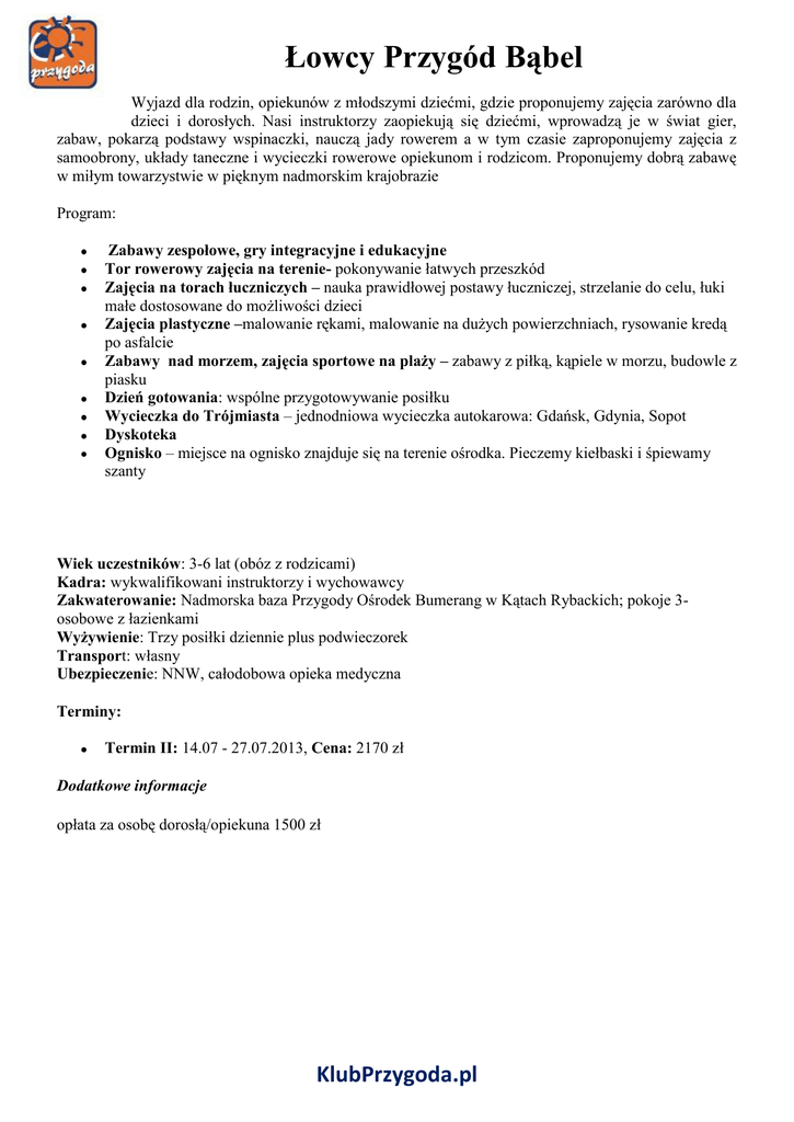 Łowcy Przygód Bąbel Wyjazd dla rodzin, opiekunów z młodszymi dziećmi, gdzie proponujemy zajęcia zarówno dla dzieci i dorosłych. Nasi instruktorzy zaopiekują się dziećmi, wprowadzą je w świat gier, zabaw, pokarzą podstawy wspinaczki, nauczą jady rowerem a w tym czasie zaproponujemy zajęcia z samoobrony, układy taneczne i wycieczki rowerowe opiekunom i rodzicom. Proponujemy dobrą zabawę w miłym towarzystwie w pięknym nadmorskim krajobrazie Program: Zabawy zespołowe, gry integracyjne i edukacyjne Tor rowerowy zajęcia na terenie- pokonywanie łatwych przeszkód Zajęcia na torach łuczniczych – nauka prawidłowej postawy łuczniczej, strzelanie do celu, łuki małe dostosowane do możliwości dzieci Zajęcia plastyczne –malowanie rękami, malowanie na dużych powierzchniach, rysowanie kredą po asfalcie Zabawy nad morzem, zajęcia sportowe na plaży – zabawy z piłką, kąpiele w morzu, budowle z piasku Dzień gotowania: wspólne przygotowywanie posiłku Wycieczka do Trójmiasta – jednodniowa wycieczka autokarowa: Gdańsk, Gdynia, Sopot Dyskoteka Ognisko – miejsce na ognisko znajduje się na terenie ośrodka. Pieczemy kiełbaski i śpiewamy szanty Wiek uczestników: 3-6 lat (obóz z rodzicami) Kadra: wykwalifikowani instruktorzy i wychowawcy Zakwaterowanie: Nadmorska baza Przygody Ośrodek Bumerang w Kątach Rybackich; pokoje 3osobowe z łazienkami Wyżywienie: Trzy posiłki dziennie plus podwieczorek Transport: własny Ubezpieczenie: NNW, całodobowa opieka medyczna Terminy: Termin II: 14.07 - 27.07.2013, Cena: 2170 zł Dodatkowe informacje opłata za osobę dorosłą/opiekuna 1500 zł KlubPrzygoda.pl