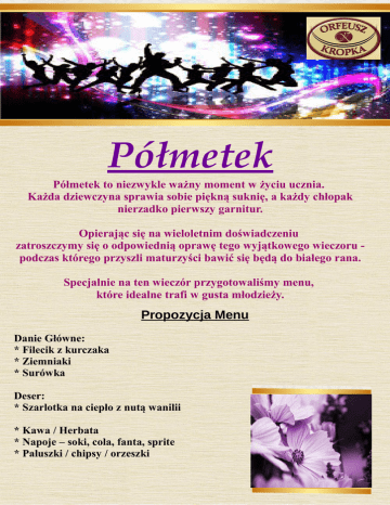Półmetek Półmetek to niezwykle ważny moment w życiu ucznia. Każda dziewczyna sprawia sobie piękną suknię, a każdy chłopak nierzadko pierwszy garnitur. Opierając się na wieloletnim doświadczeniu zatroszczymy się o odpowiednią oprawę tego wyjątkowego wieczoru podczas którego przyszli maturzyści bawić się będą do białego rana. Specjalnie na ten wieczór przygotowaliśmy menu, które idealne trafi w gusta młodzieży. Propozycja Menu Danie Główne: * Filecik z kurczaka * Ziemniaki * Surówka Deser: * Szarlotka na ciepło z nutą wanilii * Kawa / Herbata * Napoje – soki, cola, fanta, sprite * Paluszki / chipsy / orzeszki Propozycja Menu Zimna Płyta: * Płyta wędlinowa * Płyta serowa * Sałatka z gyrosem * Tymbaliki z drobiu * Jajko w sosie tatarskim * Pieczywo / masło Gorąca Kolacja ( do wyboru ): * Bursztynowy Barszczyk z pasztecikiem * Zupa gulaszowa * Żurek śląski z jajkiem CENNIK: 70zł / osoba – propozycja bez ciasta, napojów i kolacji 75zł / osoba – propozycja bez kolacji, ale z ciastem i napojami 80zł / osoba – propozycja pełnego pakietu