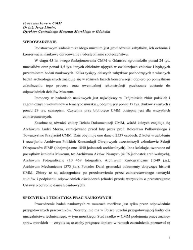 Prace naukowe w CMM Dr inŜ. Jerzy Litwin, Dyrektor Centralnego Muzeum Morskiego w Gdańsku WPROWADZENIE Podstawowym zadaniem kaŜdego muzeum jest gromadzenie zabytków, ich ochrona i konserwacja, naukowe opracowanie i udostępnianie społeczeństwu. W ciągu 45 lat swego funkcjonowania CMM w Gdańsku zgromadziło ponad 24 tys. muzealiów oraz ponad 4,5 tys. innych obiektów ujętych w ewidencjach zbiorów i będących przedmiotem badań naukowych. Kilka tysięcy dalszych zabytków pochodzących z własnych badań archeologicznych znajduje się w róŜnych fazach konserwacji i dopiero po pomyślnym zakończeniu tego procesu oraz ewentualnej rekonstrukcji przekazane zostanie do odpowiednich działów Muzeum. Pomocny w badaniach naukowych jest największy w Trójmieście zbiór polskich i zagranicznych woluminów o tematyce morskiej, obejmujący ponad 17 tys. druków zwartych i ponad 29 tys. czasopism. Czytelnia przy bibliotece CMM dostępna jest dla wszystkich zainteresowanych. Zasobne są równieŜ zbiory Działu Dokumentacji CMM, wśród których znajduje się Archiwum Ludzi Morza, zainicjowane przed laty przez prof. Bolesława Polkowskiego i Towarzystwo Przyjaciół CMM. Dziś obejmuje ono dane o 2537 osobach. Z kolei w załoŜeniu i rozwijaniu Archiwum Polskich Konstrukcji Okrętowych uczestniczyli członkowie Sekcji Okrętowców SIMP (obejmuje ono 1840 jednostek archiwalnych). Inne kolekcje, tworzone od początków istnienia Muzeum, to: Archiwum Aktów Pisanych (4176 jednostek archiwalnych), Archiwum Fotograficzne (10 469 fotografii), Archiwum Kartograficzne (1549 j.a.), Archiwum Mechaniczne (373 j.a.). Ponadto Dział gromadzi dokumenty dotyczące historii CMM. Zbiory te są udostępniane po przedstawieniu przez zainteresowanego tematyki studiów i podpisaniu odpowiednich oświadczeń (chodzi przede wszystkim o przestrzeganie Ustawy o ochronie danych osobowych). SPECYFIKA I TEMATYKA PRAC NAUKOWYCH Prowadzenie badań naukowych w muzeach moŜliwe jest tylko przez odpowiednio przygotowanych pracowników. Niestety, nie ma w Polsce uczelni przygotowującej kadry dla muzealnictwa technicznego, w tym morskiego. Stąd rzadko w CMM podejmują pracę znawcy spraw morskich — zwykle są to osoby pragnące dopiero w ramach zatrudnienia poznawać tę 1 tematykę i doskonalić się w wybranej dziedzinie wiedzy morskiej. Pewien wyjątek stanowią absolwenci archeologii podwodnej Uniwersytetu Mikołaja Kopernika w Toruniu, których CMM zatrudnia kilkoro. Najliczniej reprezentowanym w naszej instytucji kierunkiem ukończonych studiów jest historia ze specjalizacją „muzealnictwo”. Dopiero po kilku latach samokształcenia historycy nabywają kwalifikacje muzealnika morskiego. PRACE NAUKOWE W CENTRALNYM MUZEUM MORSKIM W GDAŃSKU Podstawą pracy naukowej w muzeum są studia nad eksponatami, niezbędne przy tworzeniu kart ewidencyjnych muzealiów. Rozpoznanie cech wspólnych grup obiektów, a takŜe określenie specyfiki danego zabytku prowadzi do uzyskania pogłębionych wiadomości, które następnie stają się podstawą do przygotowania scenariuszy ekspozycji problemowych, katalogów zbiorów i wystaw, referatów i innych publikacji. Wyniki prac naukowych określają równieŜ kierunki rozwoju kolekcji muzealnych. Ustabilizowanie kadry merytorycznej w CMM pod koniec lat 90. umoŜliwiło rozwinięcie zakresu tematyki podejmowanych prac naukowych. Obecnie prowadzone są badania naukowe w następujących dziedzinach: muzealnictwo morskie, historia okrętownictwa, historia Ŝeglugi morskiej i rzecznej, morskie i nadmorskie dziedzictwo kulturowe, malarstwo marynistyczne, historia szkutnictwa ludowego, archeologia nautologiczna, konserwatorstwo zabytków wydobywanych ze środowiska wodnego oraz formy edukacji muzealnej. Pionierską wizytówką CMM były publikacje wyników studiów nad historią szkutnictwa i okrętownictwa. Zapoczątkował je pierwszy dyrektor Muzeum, dr hab. P. Smolarek, skupiając swą uwagę na wczesnośredniowiecznym szkutnictwie skandynawskim i słowiańskim. Po serii artykułów, monografią „Zabytki szkutnictwa skandynawskiego” zainaugurował w 1963 roku serię wydawniczą „Prace Muzeum Morskiego Gdańsku”. Drugim nurtem badań były prowadzone od 1973 roku przez dra inŜ. J. Litwina badania polskiego szkutnictwa ludowego oraz pomorskiego okrętownictwa okresu średniowiecza. W wyniku systematycznych prac na terenie Polski zinwentaryzowano zabytki szkutnictwa ludowego, a wyselekcjonowane łodzie wypełniły wystawy w Muzeum Rybołówstwa w Helu oraz w Muzeum Wisły w Tczewie. Przed kilku laty przeprowadzono w CMM studia nad dłubankami pochodzącymi z badań archeologicznych, zakończone obszernym katalogiem, opracowanym przez dra W. Ossowskiego. Badacz ten następnie podjął studia nad płaskodennymi konstrukcjami 2 pływającymi oraz opracował katalog pt. „Szkutnictwo Pomorza Wschodniego w okresie średniowiecza w świetle analiz dendrochronologicznych”, zawierający datowanie pozostałości średniowiecznych łodzi i statków przechowywanych w muzeach nadbałtyckich. Określono w nim czas i miejsca budowy danej łodzi lub statku. Na projekt ten uzyskano dotację z KBN, a rezultaty tych prac zostały nagrodzone wyróŜnieniem w 2003 roku w konkursie na „Wydarzenie muzealne roku”, w kategorii „Osiągnięcia z zakresu działalności naukowej”. PUBLIKACJE NAUKOWE CMM W RAMACH SERII „PRACE CENTRALNEGO MUZEUM MORSKIEGO W GDAŃSKU” Autorami nieregularnie ukazujących się od 1963 roku tomów byli pracownicy Muzeum oraz badacze spoza tej instytucji. Łącznie do końca 2005 roku ukazało się drukiem dwanaście prac: I. P. Smolarek, Zabytki szkutnictwa skandynawskiego, 1963; II. J. Miciński, Polskie statki pomocnicze i specjalne 1920-1939, 1967; III. P. Smolarek, Studia nad szkutnictwem Pomorza Gdańskiego X-XIII wieku, 1969; IV. Z. Batorowicz, Maszoperie kaszubskie. Studium geograficzno-etnograficzne, 1971; V. W. Arkuszewski, Wiślane statki pasaŜerski