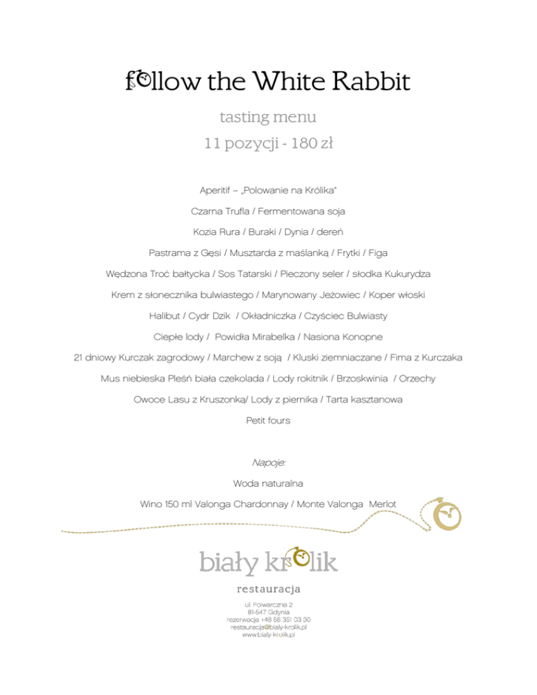 f#llow the White Rabbit tasting menu 11 pozycji - 180 zł Aperitif – „Polowanie na Królika” Czarna Trufla / Fermentowana soja Kozia Rura / Buraki / Dynia / dereń Pastrama z Gęsi / Musztarda z maślanką / Frytki / Figa Wędzona Troć bałtycka / Sos Tatarski / Pieczony seler / słodka Kukurydza Krem z słonecznika bulwiastego / Marynowany Jeżowiec / Koper włoski Halibut / Cydr Dzik / Okładniczka / Czyściec Bulwiasty Ciepłe lody / Powidła Mirabelka / Nasiona Konopne 21 dniowy Kurczak zagrodowy / Marchew z soją / Kluski ziemniaczane / Fima z Kurczaka Mus niebieska Pleśń biała czekolada / Lody rokitnik / Brzoskwinia / Orzechy Owoce Lasu z Kruszonką/ Lody z piernika / Tarta kasztanowa Petit fours Napoje: Woda naturalna Wino 150 ml Valonga Chardonnay / Monte Valonga Merlot