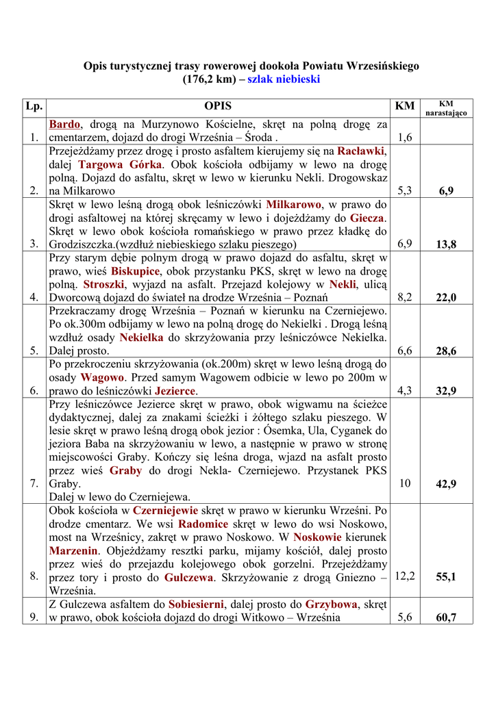 Opis turystycznej trasy rowerowej dookoła Powiatu Wrzesińskiego (176,2 km) – szlak niebieski Lp. 1. 2. 3. 4. 5. 6. 7. 8. 9. OPIS Bardo, drogą na Murzynowo Kościelne, skręt na polną drogę za cmentarzem, dojazd do drogi Września – Środa . Przejeżdżamy przez drogę i prosto asfaltem kierujemy się na Racławki, dalej Targowa Górka. Obok kościoła odbijamy w lewo na drogę polną. Dojazd do asfaltu, skręt w lewo w kierunku Nekli. Drogowskaz na Milkarowo Skręt w lewo leśną drogą obok leśniczówki Milkarowo, w prawo do drogi asfaltowej na której skręcamy w lewo i dojeżdżamy do Giecza. Skręt w lewo obok kościoła romańskiego w prawo przez kładkę do Grodziszczka.(wzdłuż niebieskiego szlaku pieszego) Przy starym dębie polnym drogą w prawo dojazd do asfaltu, skręt w prawo, wieś Biskupice, obok przystanku PKS, skręt w lewo na drogę polną. Stroszki, wyjazd na asfalt. Przejazd kolejowy w Nekli, ulicą Dworcową dojazd do świateł na drodze Września – Poznań Przekraczamy drogę Września – Poznań w kierunku na Czerniejewo. Po ok.300m odbijamy w lewo na polną drogę do Nekielki . Drogą leśną wzdłuż osady Nekielka do skrzyżowania przy leśniczówce Nekielka. Dalej prosto. Po przekroczeniu skrzyżowania (ok.200m) skręt w lewo leśną drogą do osady Wagowo. Przed samym Wagowem odbicie w lewo po 200m w prawo do leśniczówki Jezierce. Przy leśniczówce Jezierce skręt w prawo, obok wigwamu na ścieżce dydaktycznej, dalej za znakami ścieżki i żółtego szlaku pieszego. W lesie skręt w prawo leśną drogą obok jezior : Ósemka, Ula, Cyganek do jeziora Baba na skrzyżowaniu w lewo, a następnie w prawo w stronę miejscowości Graby. Kończy się leśna droga, wjazd na asfalt prosto przez wieś Graby do drogi Nekla- Czerniejewo. Przystanek PKS Graby. Dalej w lewo do Czerniejewa. Obok kościoła w Czerniejewie skręt w prawo w kierunku Wrześni. Po drodze cmentarz. We wsi Radomice skręt w lewo do wsi Noskowo, most na Wrześnicy, zakręt w prawo Noskowo. W Noskowie kierunek Marzenin. Objeżdżamy resztki parku, mijamy kościół, dalej prosto przez wieś do przejazdu kolejowego obok gorzelni. Przejeżdżamy przez tory i prosto do Gulczewa. Skrzyżowanie z drogą Gniezno – Września. Z Gulczewa asfaltem do Sobiesierni, dalej prosto do Grzybowa, skręt w prawo, obok kościoła dojazd do drogi Witkowo – Września KM KM narastająco 1,6 5,3 6,9 6,9 13,8 8,2 22,0 6,6 28,6 4,3 32,9 10 42,9 12,2 55,1 5,6 60,7 10. 11. 12. 13. 14. 15. 16. 17. 18. 19. Skręt w lewo na Witkowo, za mostem w prawo do Sędziwojewa. Na skrzyżowaniu w lewo na Chwałkowice, przed Otoczną w prawo na Węgierki, dojazd do drogi Poznań Konin. Skręt w lewo po ok. 500m skręt w prawo na Gozdowo Węgierki, kierunek Gozdowo, na rozjeździe po ok. 1km odbijamy w prawo i zmierzamy na wiaduktu nad autostradą A2 do skrzyżowania przy cmentarzu w Gozdowie. Dalej w lewo pod górkę przez most do skrzyżowania obok sklepu prosto na Sokolniki. Gozdowo – Bieganowo – Sokolniki na skrzyżowaniu prosto do Borkowa za stawem pod górkę, pierwsza droga w prawo na Ksawerów. Droga Pyzdry – Słupca skręt w prawo na Pietrzyków, Rataje, Dłusk, Pyzdry. Skrzyżowanie skręt w lewo na Kalisz. Most na Warcie. Za mostem po schodach w lewo na wał przeciwpowodziowy. Wałem do zabudowań pod lasem. Przed gospodarstwem w prawo, po stu metrach w lewo. Na rozwidleniu prosto przez las do chatki ornitologa w Białobrzegach Polna drogą do Wrąbczynka, na skrzyżowaniu w prawo, asfaltem do Wrąbczynkowskich Holendrów, koło nieczynnej rozlewni mleka skręt w lewo na polną drogę, wieś Adamierz. Skręt na drogę asfaltową, w prawo Żdżary. Po 200m w polną drogę w lewo, przez pola, dalej lasem do drogi Pyzdry – Kalisz. Potem skręt w lewo na Kolonię Ciemierów. Drogą na Kalisz, skręt w prawo na Ciemierów Lisewo w centrum wsi skręt w prawo asfaltem do Rudy Komorskiej , dalej w lewo w kierunku Warty, przed Wartą w prawo na wał przeciwpowodziowy. Wałem przez Modlicę do mostu na Warcie w Pyzdrach. Przez most do Pyzdr. W lewo ul.Niepodległości, w lewo ul. Spółdzielców w prawo Kaliską i dalej Wrocławską do wsi Tarnowa. Koniec asfaltu, dalej drogą polną do Spławia. Wjazd na asfalt prosto i po 200m drogą polną (asfalt skręca w prawo) asfaltem do Nowej Wsi Podgórnej (PKS). W Nowej Wsi Podgórnej skręt w prawo i zaraz w lewo w polną drogę przez las. W Szczodrzejewie w lewo, przez wieś do Czeszewa, skręt w lewo, na rozwidleniu w prawo obok promu na wał przeciwpowodziowy do Orzechowa. Za basenem w prawo, potem w lewo ulicą Miłosławską. Na głównym skrzyżowaniu w prawo Dworzec PKP Prosto przez tory ulicą Średzką skręt w prawo w ulicę Jabłoniową obok kościoła. Koniec drogi asfaltowej. Wjazd na drogę z płyt betonowych. Betonówką do końca, na skrzyżowaniu obok leśniczówki Wygranka w prawo. Szeroką drogą leśną przez las do wiaduktu kolejowego, przejazd pod wiaduktem 6,6 67,3 4,9 72,2 20,7 92,9 7,4 100,3 13,2 113,5 18 131,5 9,5 141 9,4 150,4 4,6 155 4,2 159,2 20. 21. 22. 23. 24. 25. Prosto drogą przez las, koniec drogi leśnej, wjazd na asfalt. Wieś Bagatelka. Dojazd do drogi Miłosław – Pyzdry obok parku przy szkole, skręt w lewo do miasta. Ulicą Zamkową pod górkę obok kościołów, Plac Wolności Ludów, skręt w lewo ulicą Wrzesińską obok browaru, przy Urzędzie Gminy w lewo skos ulicą Pałczyńską, następnie w lewo ul. Dworcową przez przejazd kolejowy obok dworca PKP Dalej prosto w kierunku Winnej Góry, obok gospodarstwa rolnego w prawo, mijamy park z dworem, kościół. Za kościołem w prawo w drogę polną. Polną drogą w stronę Pałczyna. Dojazd do asfaltu, skręt w prawo na Pałczyn Droga asfaltową do wsi, po ok.700m skręt w lewo w drogę asfaltową, dalej prosto do drogi polnej na Książno. Dojazd do asfaltu (Książno) skręt w prawo Po 400m przy krzyżu skręt w lewo w drogę polną do Barda. Obok krzyża w Bardzie skręt