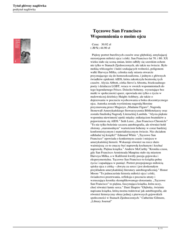 Tytuł główny nagłówka podtytuł nagłówka Tęczowe San Francisco Wspomnienia o moim ojcu Cena: 30.92 zł (-31%) 44.90 zł Piękny portret burzliwych czasów oraz głębokiej, umykającej stereotypom miłości ojca i córki. San Francisco lat 70. i 80. XX wieku stało się sceną zmian, które odbiły się szerokim echem nie tylko w Stanach Zjednoczonych, ale także na świecie. Było mekką włóczęgów i ludzi szukających wolności, poligonem walki Harveya Milka, członka rady miasta otwarcie przyznającego się do homoseksualizmu, i jednym z głównych świadków epidemii AIDS, która zakończyła beztroskę tych czasów. Alysia Abbott, córka Steve’a Abootta, biseksualnego poety i działacza LGBT, wraca w swoich wspomnieniach do tego legendarnego Frisco. Dziecko bohemy, wyrastające bez matki w społeczności queer, opowiada nie tylko o życiu w malowniczej dzielnicy Haight-Ashbury, ale także o dojrzewaniu w poczuciu wyobcowania u boku ekscentrycznego ojca. Autorka została wyróżniona nagrodą Heroine przyznawaną przez Magazyn „Madame Figaro”, Nagrodą Stonewall Amerykańskiego Stowarzyszenia Bibliotekarzy oraz została finalistką Nagrody Literackiej Lambda. "Alysia pięknie wspomina niewinność epoki między zniknięciem beatników a pojawieniem się AIDS." Seth Lerer, „San Francisco Chronicle” "To nie tylko boleśnie szczera autobiografia, ale również hołd złożony „staromodnym” wartościom bohemy w coraz bardziej konformistycznym i materialistycznym świecie. Nie chciałem odkładać tej książki!" Edmund White "„Tęczowe San Francisco” opowiada o konkretnym czasie i miejscu w amerykańskiej historii. Wskazuje również na rzecz dużo ważniejszą: co to znaczy być naprawdę kochanym i kochać naprawdę. Piękna książka." Andrew McCarthy "Kronika czasu, gdy San Francisco Armisteada Maupina stało się miastem Harveya Milka, a w Kalifornii kwitły poezja gejowska i eksperymentalna. Tęczowe San Francisco to książka pełna życia i zapadająca w pamięć. Portret przepojonego miłością spisku ojca z córką – chwyta za serce i jest doskonałym przykładem amerykańskiej literatury autobiograficznej." Honor Moore "To jednocześnie historia miłości ojca i córki, świadectwo przetrwania, refleksja o poczuciu utraty i wzruszająca kronika skomplikowanego dorastania. „Tęczowe San Francisco” to piękna, fascynująca książka, która uczy, choć również łamie serca." Dani Shapiro "Głęboka, świetnie napisana książka, którą można traktować jak autobiografię, ale również historyczny obraz jednej z pierwszych gejowskich społeczności w Stanach Zjednoczonych." Catherine Gilmore, „Library Journal” 1/1 Powered by TCPDF (www.tcpdf.org)
