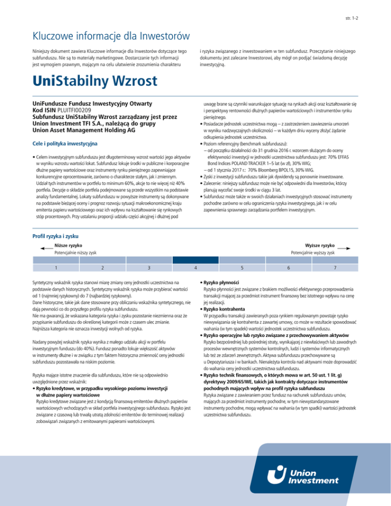str. 1-2 Kluczowe informacje dla Inwestorów Niniejszy dokument zawiera Kluczowe informacje dla Inwestorów dotyczące tego subfunduszu. Nie są to materiały marketingowe. Dostarczanie tych informacji jest wymogiem prawnym, mającym na celu ułatwienie zrozumienia charakteru i ryzyka związanego z inwestowaniem w ten subfundusz. Przeczytanie niniejszego dokumentu jest zalecane Inwestorowi, aby mógł on podjąć świadomą decyzję inwestycyjną. UniStabilny Wzrost UniFundusze Fundusz Inwestycyjny Otwarty Kod ISIN PLUITFI00209 Subfundusz UniStabilny Wzrost zarządzany jest przez Union Investment TFI S.A., należącą do grupy Union Asset Management Holding AG uwagę brane są czynniki warunkujące sytuację na rynkach akcji oraz kształtowanie się i perspektywy rentowności dłużnych papierów wartościowych i instrumentów rynku pieniężnego. • Posiadacze jednostek uczestnictwa mogą – z zastrzeżeniem zawieszenia umorzeń w wyniku nadzwyczajnych okoliczności – w każdym dniu wyceny złożyć żądanie odkupienia jednostek uczestnictwa. • Poziom referencyjny (benchmark subfunduszu): – o d początku działalności do 31 grudnia 2016 r. wzorcem służącym do oceny efektywności inwestycji w jednostki uczestnictwa subfunduszu jest: 70% EFFAS Bond Indices POLAND TRACKER 1–5 lat (w zł), 30% WIG; – o d 1 stycznia 2017 r.: 70% Bloomberg BPOL15, 30% WIG. • Zyski z inwestycji subfunduszu takie jak dywidendy są ponownie inwestowane. • Zalecenie: niniejszy subfundusz może nie być odpowiedni dla Inwestorów, którzy planują wycofać swoje środki w ciągu 3 lat. • Subfundusz może także w swoich działaniach inwestycyjnych stosować instrumenty pochodne zarówno w celu ograniczenia ryzyka inwestycyjnego, jak i w celu zapewnienia sprawnego zarządzania portfelem inwestycyjnym. Cele i polityka inwestycyjna • Celem inwestycyjnym subfunduszu jest długoterminowy wzrost wartości jego aktywów w wyniku wzrostu wartości lokat. Subfundusz lokuje środki w publiczne i korporacyjne dłużne papiery wartościowe oraz instrumenty rynku pieniężnego zapewniające konkurencyjne oprocentowanie, zarówno o charakterze stałym, jak i zmiennym. Udział tych instrumentów w portfelu to minimum 60%, akcje to nie więcej niż 40% portfela. Decyzje o składzie portfela podejmowane są przede wszystkim na podstawie analizy fundamentalnej. Lokaty subfunduszu w powyższe instrumenty są dokonywane na podstawie bieżącej oceny i prognoz rozwoju sytuacji makroekonomicznej kraju emitenta papieru wartościowego oraz ich wpływu na kształtowanie się rynkowych stóp procentowych. Przy ustalaniu proporcji udziału części akcyjnej i dłużnej pod Profil ryzyka i zysku Niższe ryzyko Wyższe ryzyko Potencjalnie niższy zysk Potencjalnie wyższy zysk 1 2 3 Syntetyczny wskaźnik ryzyka stanowi miarę zmiany ceny jednostki uczestnictwa na podstawie danych historycznych. Syntetyczny wskaźnik ryzyka może przybierać wartości od 1 (najmniej ryzykowny) do 7 (najbardziej ryzykowny). Dane historyczne, takie jak dane stosowane przy obliczaniu wskaźnika syntetycznego, nie dają pewności co do przyszłego profilu ryzyka subfunduszu. Nie ma gwarancji, że wskazana kategoria ryzyka i zysku pozostanie niezmienna oraz że przypisanie subfunduszu do określonej kategorii może z czasem ulec zmianie. Najniższa kategoria nie oznacza inwestycji wolnych od ryzyka. Nadany powyżej wskaźnik ryzyka wynika z małego udziału akcji w portfelu inwestycyjnym funduszu (do 40%). Fundusz ponadto lokuje większość aktywów w instrumenty dłużne i w związku z tym faktem historyczna zmienność ceny jednostki subfunduszu pozostawała na niskim poziomie. Ryzyka mające istotne znaczenie dla subfunduszu, które nie są odpowiednio uwzględnione przez wskaźnik: • Ryzyko kredytowe, w przypadku wysokiego poziomu inwestycji w dłużne papiery wartościowe Ryzyko kredytowe związane jest z kondycją finansową emitentów dłużnych papierów wartościowych wchodzących w skład portfela inwestycyjnego subfunduszu. Ryzyko jest związane z czasową lub trwałą utratą zdolności emitentów do terminowej realizacji zobowiązań związanych z emitowanymi papierami wartościowymi. 4 5 6 7 • Ryzyko płynności Ryzyko płynności jest związane z brakiem możliwości efektywnego przeprowadzenia transakcji mającej za przedmiot instrument finansowy bez istotnego wpływu na cenę jej realizacji. • Ryzyko kontrahenta W przypadku transakcji zawieranych poza rynkiem regulowanym powstaje ryzyko niewywiązania się kontrahenta z zawartej umowy, co może w rezultacie spowodować wahania (w tym spadek) wartości jednostek uczestnictwa subfunduszu. • Ryzyko operacyjne lub ryzyko związane z przechowywaniem aktywów Ryzyko bezpośredniej lub pośredniej straty, wynikającej z niewłaściwych lub zawodnych procesów wewnętrznych systemów kontrolnych, ludzi i systemów informatycznych lub też ze zdarzeń zewnętrznych. Aktywa subfunduszu przechowywane są u Depozytariusza i w bankach. Nienależyta kontrola nad aktywami może doprowadzić do wahania ceny jednostki uczestnictwa subfunduszu. • Ryzyko technik finansowych, o których mowa w art. 50 ust. 1 lit. g) dyrektywy 2009/65/WE, takich jak kontrakty dotyczące instrumentów pochodnych mających wpływ na profil ryzyka subfunduszu Ryzyka związane z zawieraniem przez fundusz na rachunek subfunduszu umów, mających za przedmiot instrumenty pochodne, w tym niewystandaryzowane instrumenty pochodne, mogą wpływać na wahania (w tym spadki) wartości jednostek uczestnictwa subfunduszu. str. 2-2 Kluczowe informacje dla Inwestorów UniStabilny Wzrost Opłaty • Opłaty ponoszone przez Inwestora służą pokryciu kosztów związanych z działalnością subfunduszu, w tym kosztów dystrybucji i kosztów wprowadzenia do obrotu. • Opłaty te zmniejszają potencjalny wzrost inwestycji. • Opłaty za nabycie i umorzenie jednostek uczestnictwa podawane są w wysokości maksymalnej. 