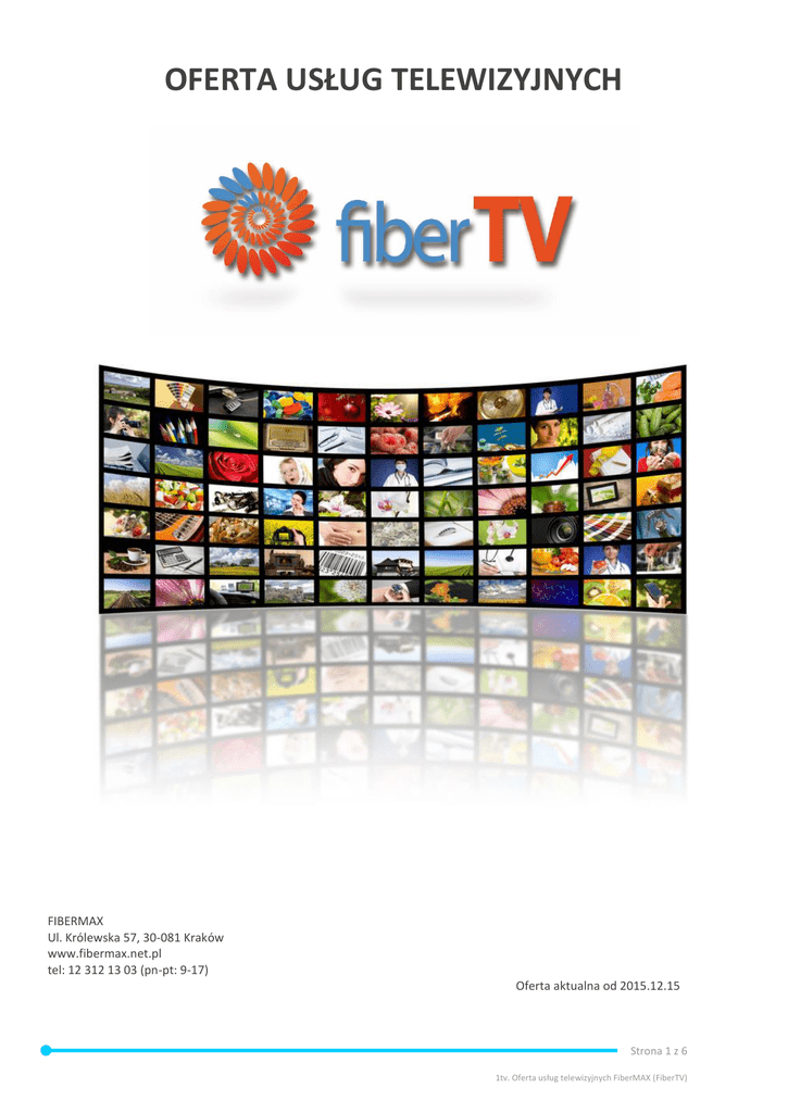 OFERTA USŁUG TELEWIZYJNYCH FIBERMAX Ul. Królewska 57, 30-081 Kraków www.fibermax.net.pl tel: 12 312 13 03 (pn-pt: 9-17) Oferta aktualna od 2015.12.15 Strona 1 z 6 1tv. Oferta usług telewizyjnych FiberMAX (FiberTV) PAKIET START ABONAMENT: OPŁATY JEDNORAZOWE: 25 zł Przy umowie na 24 mce 28 zl Przy umowie na 12 mcy - 1 zł - opłata instalacyjna - 99 zł - opłata aktywacyjna LISTA KANAŁÓW: Załącznik 10tv. Lista kanalow telewizyjnych (FiberTV) Aktualna lista kanałów zawsze dostępna na stronie www.fibermax.net.pl PAKIET DOSTĘPY W KONFIGURACJI: - TELEWIZJA - TELEWIZJA + INTERNET - TELEWIZJA + INTERNET + TELEFON MAG-250 HD PAKIET START HD ABONAMENT: OPŁATY JEDNORAZOWE: 29 zł Przy umowie na 24 mce 34 zl Przy umowie na 12 mcy - 1 zł - opłata instalacyjna - 99 zł - opłata aktywacyjna LISTA KANAŁÓW: Załącznik 10tv. Lista kanalow telewizyjnych (FiberTV) Aktualna lista kanałów zawsze dostępna na stronie www.fibermax.net.pl PAKIET DOSTĘPY W KONFIGURACJI: - TELEWIZJA - TELEWIZJA + INTERNET - TELEWIZJA + INTERNET + TELEFON MAG-250 HD Strona 2 z 6 1tv. Oferta usług telewizyjnych FiberMAX (FiberTV) PAKIET MINI HD ABONAMENT: OPŁATY JEDNORAZOWE: 42 zł Przy umowie na 24 mce 47 zl Przy umowie na 12 mcy - 1 zł - opłata instalacyjna - 99 zł - opłata aktywacyjna PAKIETY TEMATYCZNE Pakiety tematyczne możesz zawsze dokupić do PAKIETU MINI HD. Więcej FILMÓW ABONAMENT MIESIĘCZNY: 6,99 zł Więcej SPORTU ABONAMENT MIESIĘCZNY: 6,99 zł Więcej NAUKI ABONAMENT MIESIĘCZNY: 6,99 zł Więcej BAJEK ABONAMENT MIESIĘCZNY: 4,99 zł Więcej LUZU ABONAMENT MIESIĘCZNY: 6,99 zł PAKIETY PREMIUM Pakiety tematyczne możesz zawsze dokupić do PAKIETU MINI HD oraz MULTI HD. ABONAMENT MIESIĘCZNY: 39,99 zł ABONAMENT MIESIĘCZNY: 49,99 zł LISTA KANAŁÓW PAKIETÓW PREMIUM: Załącznik 10tv. Lista kanalow telewizyjnych (FiberTV) Aktualna lista kanałów zawsze dostępna na stronie www.fibermax.net.pl PAKIET DOSTĘPY W KONFIGURACJI: - TELEWIZJA - TELEWIZJA + INTERNET - TELEWIZJA + INTERNET + TELEFON MAG-250 HD Strona 3 z 6 1tv. Oferta usług telewizyjnych FiberMAX (FiberTV) PAKIET MUTI HD ABONAMENT: OPŁATY JEDNORAZOWE: 72 zł Przy umowie na 24 mce 77 zl Przy umowie na 12 mcy PAKIETY PREMIUM - 1 zł - opłata instalacyjna - 99 zł - opłata aktywacyjna możesz zawsze dokupić do PAKIETU MINI HD oraz MULTI HD. ABONAMENT MIESIĘCZNY: 49,99 zł ABONAMENT MIESIĘCZNY: 39,99 zł LISTA KANAŁÓW PAKIETÓW PREMIUM: Załącznik 10tv. Lista kanalow telewizyjnych (FiberTV) Aktualna lista kanałów zawsze dostępna na stronie www.fibermax.net.pl PAKIET DOSTĘPY W KONFIGURACJI: - TELEWIZJA - TELEWIZJA + INTERNET - TELEWIZJA + INTERNET + TELEFON MAG-250 HD Strona 4 z 6 1tv. Oferta usług telewizyjnych FiberMAX (FiberTV) PAKIET EXTRA HD ABONAMENT: OPŁATY JEDNORAZOWE: 110 zł Przy umowie na 24 mce 120 zl Przy umowie na 12 mcy - 1 zł - opłata instalacyjna - 99 zł - opłata aktywacyjna PAKIETY PREMIUM Pakiety tematyczne możesz zawsze dokupić do PAKIETU MINI HD oraz MULTI HD. ABONAMENT MIESIĘCZNY: 49,99 zł ABONAMENT MIESIĘCZNY: 39,99 zł LISTA KANAŁÓW PAKIETÓW PREMIUM: Załącznik 10tv. Lista kanalow telewizyjnych (FiberTV) Aktualna lista kanałów zawsze dostępna na stronie www.fibermax.net.pl PAKIET DOSTĘPY W KONFIGURACJI: - TELEWIZJA - TELEWIZJA + INTERNET - TELEWIZJA + INTERNET + TELEFON MAG-250 HD Strona 5 z 6 1tv. Oferta usług telewizyjnych FiberMAX (FiberTV) DEKODERY MAG-250 HD DEKODER dostępny dla wszystkich PAKIETÓW MAG250 HD umożliwia w wygodny sposób oglądanie telewizji w wysokiej rozdzielczości HD. Wyposażony w złącze HDMI idealnie współpracuje z telewizorami LED, LCD i plazmowymi. Umożliwia korzystanie z przydatnych i wygodnych funkcji takich jak: przewodnik po programach EPG, ustawianie listy ulubionych kanałów z własną numeracją, ochrona rodzicielska, ustawianie ścieżek dźwiękowych i napisów. Dekoder nie jest wyposażony fabrycznie w dysk twardy, ale po podłączeniu zewnętrznego dysku USB staje się dekoderem z cyfrową nagrywarką umożliwiającą nagrywanie filmów, programów tv, tak aby móc je oglądać wtedy kiedy chcemy a nie wtedy kiedy są emitowane. Po podłączeniu dysku USB jest także możliwość zatrzymywania telewizji na żywo. Ogólna specyfikacja techniczna MAG250: Oparty na systemie Linux Wysoka rozdzielczość HDTV w trybach 1920x1080i oraz 1280x720p Obraz w standardach MPEG4 (H.264) oraz MPEG2 Detekcja formatu panoramicznego TV Dźwięk przestrzenny 5.1 Dolby Digital Obsługa formatu audio MP3, PCM, AAC Bezpieczeństwo SSL Złącza video: HDMI, 9-pin Mini-DIN Złącza audio: Cyfrowe 5.1 SPDIF Złącza: Ethernet, USB 2.0 Wymiary (szer/gł/wys): 125 x 86 x 28 mm Strona 6 z 6 1tv. Oferta usług telewizyjnych FiberMAX (FiberTV)