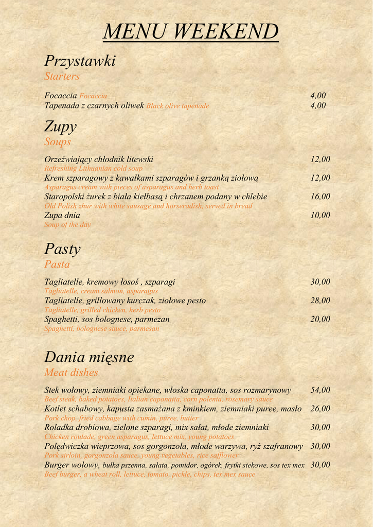 MENU WEEKEND Przystawki Starters Focaccia Focaccia Tapenada z czarnych oliwek Black olive tapenade 4,00 4,00 Zupy Soups Orzeźwiający chłodnik litewski 12,00 Refreshing Lithuanian cold soup Krem szparagowy z kawałkami szparagów i grzanką ziołową 12,00 Asparagus cream with pieces of asparagus and herb toast Staropolski żurek z biała kiełbasą i chrzanem podany w chlebie 16,00 Old Polish zhur with white sausage and horseradish, served in bread Zupa dnia 10,00 Soup of the day Pasty Pasta Tagliatelle, kremowy łosoś , szparagi 30,00 Tagliatelle, cream salmon, asparagus Tagliatelle, grillowany kurczak, ziołowe pesto 28,00 Tagliatelle, grilled chicken, herb pesto Spaghetti, sos bolognese, parmezan 20,00 Spaghetti, bolognese sauce, parmesan Dania mięsne Meat dishes Stek wołowy, ziemniaki opiekane, włoska caponatta, sos rozmarynowy 54,00 Beef steak, baked potatoes, Italian caponatta, corn polenta, rosemary sauce Kotlet schabowy, kapusta zasmażana z kminkiem, ziemniaki puree, masło 26,00 Pork chop, fried cabbage with cumin, puree, butter Roladka drobiowa, zielone szparagi, mix sałat, młode ziemniaki 30,00 Chicken roulade, green asparagus, lettuce mix, young potatoes Polędwiczka wieprzowa, sos gorgonzola, młode warzywa, ryż szafranowy 30,00 Pork sirloin, gorgonzola sauce, young vegetables, rice safflower Burger wołowy, bułka pszenna, sałata, pomidor, ogórek, frytki stekowe, sos tex mex 30,00 Beef burger, a wheat roll, lettuce, tomato, pickle, chips, tex mex sauce MENU WEEKEND Ryby Fish Filet z łososia, warzywne tagiatelle, ryż biały, sos pomarańczowy 36,00 Salmon fillet, vegetable tagiatelle, white rice, orange sauce Polędwiczka z dorsza, cukinia, fasola szparagowa, tłuczone ziemniaki 34,00 Sirloin of cod, zuccchini, green beans, mashed potatoes Sałatki Salad Cezar- sałata rzymska, kurczak grillowany, pieczone crutony, dresing parmezanowy 24,00 Caesar salad – romaine lettuce, grilled chicken, baked croutons, parmezan dressing Mix młodych sałat, pieczona wołowina, piniole, dresing balsamiczny 26,00 Young lettuce mix, roast beef, pine nuts, balsamic dressing Sałatka grecka 24,00 Greek salad Desery Desserts Czekoladowy fondant, konfitura wiśniowa, sos baleys 18,00 Chocolate fondant, cherry preserve, baleys sauce Domowy sernik z brzoskwiniami, bita śmietana, polewa czekoladowa 14,00 Homemade cheesecake with peaches, whipped cream, chocolate sauce Lody Carte D’or, owoce, bita śmietana, sos czekoladowy Carte D’or ice cream, fruits, whipped cream, chocolate sauce Napoje i alkohole – zapytaj obsługę Drinks and alcohols – ask service 14,00