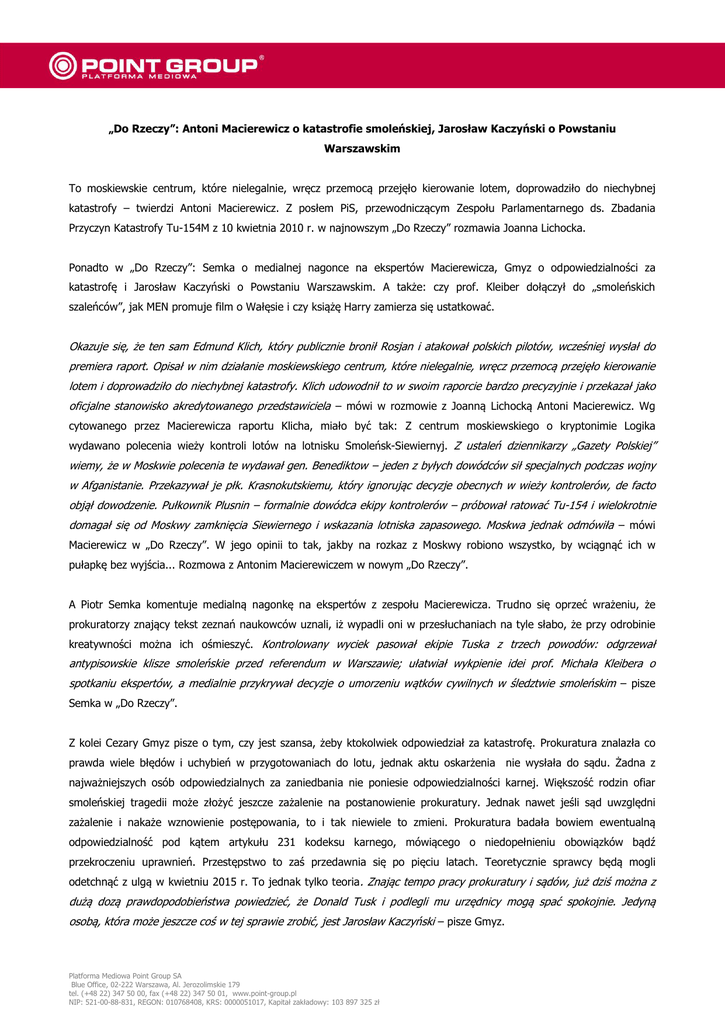„Do Rzeczy”: Antoni Macierewicz o katastrofie smoleńskiej, Jarosław Kaczyński o Powstaniu Warszawskim To moskiewskie centrum, które nielegalnie, wręcz przemocą przejęło kierowanie lotem, doprowadziło do niechybnej katastrofy – twierdzi Antoni Macierewicz. Z posłem PiS, przewodniczącym Zespołu Parlamentarnego ds. Zbadania Przyczyn Katastrofy Tu-154M z 10 kwietnia 2010 r. w najnowszym „Do Rzeczy” rozmawia Joanna Lichocka. Ponadto w „Do Rzeczy”: Semka o medialnej nagonce na ekspertów Macierewicza, Gmyz o odpowiedzialności za katastrofę i Jarosław Kaczyński o Powstaniu Warszawskim. A także: czy prof. Kleiber dołączył do „smoleńskich szaleńców”, jak MEN promuje film o Wałęsie i czy książę Harry zamierza się ustatkować. Okazuje się, że ten sam Edmund Klich, który publicznie bronił Rosjan i atakował polskich pilotów, wcześniej wysłał do premiera raport. Opisał w nim działanie moskiewskiego centrum, które nielegalnie, wręcz przemocą przejęło kierowanie lotem i doprowadziło do niechybnej katastrofy. Klich udowodnił to w swoim raporcie bardzo precyzyjnie i przekazał jako oficjalne stanowisko akredytowanego przedstawiciela – mówi w rozmowie z Joanną Lichocką Antoni Macierewicz. Wg cytowanego przez Macierewicza raportu Klicha, miało być tak: Z centrum moskiewskiego o kryptonimie Logika wydawano polecenia wieży kontroli lotów na lotnisku Smoleńsk-Siewiernyj. Z ustaleń dziennikarzy „Gazety Polskiej” wiemy, że w Moskwie polecenia te wydawał gen. Benediktow – jeden z byłych dowódców sił specjalnych podczas wojny w Afganistanie. Przekazywał je płk. Krasnokutskiemu, który ignorując decyzje obecnych w wieży kontrolerów, de facto objął dowodzenie. Pułkownik Plusnin – formalnie dowódca ekipy kontrolerów – próbował ratować Tu-154 i wielokrotnie domagał się od Moskwy zamknięcia Siewiernego i wskazania lotniska zapasowego. Moskwa jednak odmówiła – mówi Macierewicz w „Do Rzeczy”. W jego opinii to tak, jakby na rozkaz z Moskwy robiono wszystko, by wciągnąć ich w pułapkę bez wyjścia... Rozmowa z Antonim Macierewiczem w nowym „Do Rzeczy”. A Piotr Semka komentuje medialną nagonkę na ekspertów z zespołu Macierewicza. Trudno się oprzeć wrażeniu, że prokuratorzy znający tekst zeznań naukowców uznali, iż wypadli oni w przesłuchaniach na tyle słabo, że przy odrobinie kreatywności można ich ośmieszyć. Kontrolowany wyciek pasował ekipie Tuska z trzech powodów: odgrzewał antypisowskie klisze smoleńskie przed referendum w Warszawie; ułatwiał wykpienie idei prof. Michała Kleibera o spotkaniu ekspertów, a medialnie przykrywał decyzje o umorzeniu wątków cywilnych w śledztwie smoleńskim – pisze Semka w „Do Rzeczy”. Z kolei Cezary Gmyz pisze o tym, czy jest szansa, żeby ktokolwiek odpowiedział za katastrofę. Prokuratura znalazła co prawda wiele błędów i uchybień w przygotowaniach do lotu, jednak aktu oskarżenia nie wysłała do sądu. Żadna z najważniejszych osób odpowiedzialnych za zaniedbania nie poniesie odpowiedzialności karnej. Większość rodzin ofiar smoleńskiej tragedii może złożyć jeszcze zażalenie na postanowienie prokuratury. Jednak nawet jeśli sąd uwzględni zażalenie i nakaże wznowienie postępowania, to i tak niewiele to zmieni. Prokuratura badała bowiem ewentualną odpowiedzialność pod kątem artykułu 231 kodeksu karnego, mówiącego o niedopełnieniu obowiązków bądź przekroczeniu uprawnień. Przestępstwo to zaś przedawnia się po pięciu latach. Teoretycznie sprawcy będą mogli odetchnąć z ulgą w kwietniu 2015 r. To jednak tylko teoria. Znając tempo pracy prokuratury i sądów, już dziś można z dużą dozą prawdopodobieństwa powiedzieć, że Donald Tusk i podlegli mu urzędnicy mogą spać spokojnie. Jedyną osobą, która może jeszcze coś w tej sprawie zrobić, jest Jarosław Kaczyński – pisze Gmyz. Platforma Mediowa Point Group SA Blue Office, 02-222 Warszawa, Al. Jerozolimskie 179 tel. (+48 22) 347 50 00, fax (+48 22) 347 50 01, www.point-group.pl NIP: 521-00-88-831, REGON: 010768408, KRS: 0000051017, Kapitał zakładowy: 103 897 325 zł W „Do Rzeczy” również profesor Michał Kleiber. Szef Polskiej Akademii Nauk nie kryje, że jest mocno zdziwiony tym, co się dzieje wokół niego od kilkunastu dni. W swojej propozycji, by zorganizować debatę poświęconą katastrofie smoleńskiej, w której wzięliby udział eksperci rządowego zespołu Macieja Laska i naukowcy z zespołu parlamentarnego Antoniego Macierewicza, nie widzi niczego nadzwyczajnego. Oba zespoły od dawna kwestionują wzajemne ustalenia i wytykają sobie niekompetencję. W interesie społecznym leży, aby wyciszać emocje i spróbować przynajmniej poszukać wyjścia z tego klinczu, w jakim się znaleźliśmy. I temu miał służyć mój pomysł – tłumaczy w rozmowie z „Do Rzeczy” prof. Kleiber. Podkreśla, że nie stoi za tym żaden interes polityczny czy partyjny, co niektórzy usiłują mu przypisywać. Czy profesor dołączył do groma „smoleńskich szaleńców”? Na łamach „Do Rzeczy” także o filmie „Wałęsa. Człowiek z nadziei”, który jeszcze nie trafił na ekrany kin, a już stał się polskim kandydatem do Oscara. Z nachalną promocją filmu rząd tak się spieszy, że zanim ostatnią część tryptyku Andrzeja Wajdy obejrzy tzw. szary człowiek, ma już materiał edukacyjny formatujący młodzież ponadgimnazjalną i nauczycieli. Na dwa tygodnie przed wejściem „Wałęsy” do kin nauczyciele historii wielu publicznych szkół gimnazjalnych otrzymali edukacyjnego gotowca, którego współwydawcą – wraz z ITI Cinema – jest rządowe Narodowe Centrum Kultury! 48-stronicowy, wydrukowany na papierze kredowym kolorowy „Przewodnik dla nauczycieli”. Z materiału wynika, że statystyczny polski nauczyciel o Lechu Wałęsie myśli źle lub bardzo źle. Trzeba mu więc przedstawić pomysły i roz