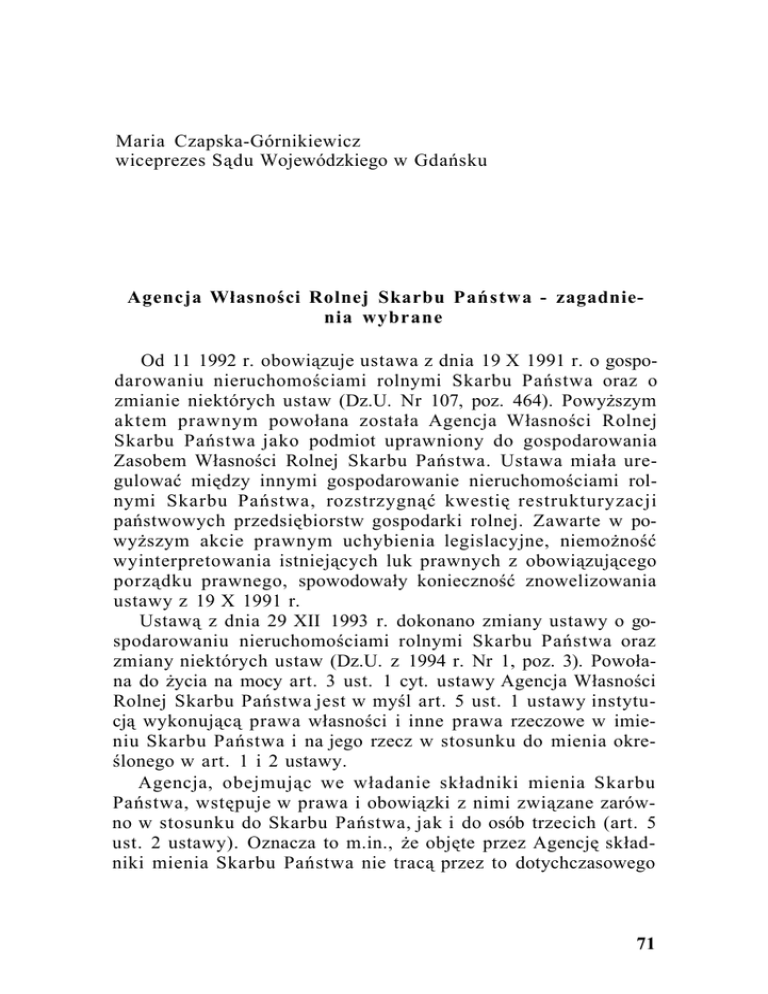 Maria Czapska-Górnikiewicz wiceprezes Sądu Wojewódzkiego w Gdańsku Agencja Własności Rolnej Skarbu Państwa - zagadnienia wybrane Od 11 1992 r. obowiązuje ustawa z dnia 19 X 1991 r. o gospodarowaniu nieruchomościami rolnymi Skarbu Państwa oraz o zmianie niektórych ustaw (Dz.U. Nr 107, poz. 464). Powyższym aktem prawnym powołana została Agencja Własności Rolnej Skarbu Państwa jako podmiot uprawniony do gospodarowania Zasobem Własności Rolnej Skarbu Państwa. Ustawa miała uregulować między innymi gospodarowanie nieruchomościami rolnymi Skarbu Państwa, rozstrzygnąć kwestię restrukturyzacji państwowych przedsiębiorstw gospodarki rolnej. Zawarte w powyższym akcie prawnym uchybienia legislacyjne, niemożność wyinterpretowania istniejących luk prawnych z obowiązującego porządku prawnego, spowodowały konieczność znowelizowania ustawy z 19 X 1991 r. Ustawą z dnia 29 XII 1993 r. dokonano zmiany ustawy o gospodarowaniu nieruchomościami rolnymi Skarbu Państwa oraz zmiany niektórych ustaw (Dz.U. z 1994 r. Nr 1, poz. 3). Powołana do życia na mocy art. 3 ust. 1 cyt. ustawy Agencja Własności Rolnej Skarbu Państwa jest w myśl art. 5 ust. 1 ustawy instytucją wykonującą prawa własności i inne prawa rzeczowe w imieniu Skarbu Państwa i na jego rzecz w stosunku do mienia określonego w art. 1 i 2 ustawy. Agencja, obejmując we władanie składniki mienia Skarbu Państwa, wstępuje w prawa i obowiązki z nimi związane zarówno w stosunku do Skarbu Państwa, jak i do osób trzecich (art. 5 ust. 2 ustawy). Oznacza to m.in., że objęte przez Agencję składniki mienia Skarbu Państwa nie tracą przez to dotychczasowego 71 REJENT Nr 7-8 - lipiec-sierpień 1994 r. statusu, w tym także dotyczącego na przykład zakazu obciążenia takich składników hipoteką przymusową (postanowienie Sądu Najwyższego z 16 XI 1993 r. I CRN 179/93 - nie publikowane). Pojęcie zawarte w art. 5 ust. 2 cyt. ustawy „obejmuje we władanie" należy rozumieć dosłownie, tzn. że chodzi o faktyczne, rzeczywiste władanie wykonywane przez Agencję bez utraty własności przez Skarb Państwa. Skarb Państwa pozostaje nadal właścicielem nieruchomości tworzących Zasób Własności Rolnej Skarbu Państwa, zaś Agencja Własności Rolnej Skarbu Państwa jako podmiot wykonujący prawo własności i inne prawa rzeczowe na rzecz Skarbu Państwa, dysponujący Zasobem Własności Rolnej Skarbu Państwa i gospodarujący tym Zasobem, powinna być wpisana w dziale drugim księgi wieczystej obok Skarbu Państwa (uchwała Sądu Najwyższego z 22 IV 1994 r., sygn. akt III CZP 189/93 - nie publikowana). Odmienna sytuacja będzie zachodziła, gdy mienie stanowiące własność Agencji nie będzie wchodziło do Zasobu (art. 5 ust. 4 i art. 12 ust. 2 ustawy), wówczas wpis w dziale drugim księgi wieczystej winien nastąpić na rzecz Agencji jako właściciela, a nie organu reprezentującego Skarb Państwa (uchwała Sądu Najwyższego z 22 IV 1994 r., sygn. akt III CZP 189/93 - nie publikowana). Agencja, zgodnie z art. 3 ust. 1 ustawy, jest państwową osobą prawną. Nadzór na Agencją sprawuje minister rolnictwa i gospodarki żywnościowej. Rozporządzenie Prezesa Rady Ministrów nadające statut Agencji Własności Rolnej Skarbu Państwa zostało wydane w dniu 16 III 1992 r. i weszło w życie od 31 III 1993 r. (Dz.U Nr 24, poz. 104; zm.: Dz.U. z 1992 r. Nr 80, poz. 409 i Dz.U. z 1993 r. Nr 36, poz. 163). W myśl art. 8 ustawy organem Agencji jest Prezes, który, jak stanowi art. 9 ust. 2 ustawy i § 6 statutu, kieruje jej działalnością, reprezentuje ją na zewnątrz i ponosi odpowiedzialność za realizację zadań Agencji określonych ustawą. Przepisy art. 17b ust. 3, art. 35 ust. 1, 2, art. 36 ust. 1, art. 48 ust. 3 ustawy wskazują, że określone w tych przepisach czynności wymagają zgody, czy też decyzji Prezesa Agencji. I tak: 72 Agencja Własności Rolnej Skarbu Państwa.. 1. zgody Prezesa wymaga zrzeczenie się swego prawa przez użytkownika wieczystego nieruchomości rolnej (art. 17b ust. 3), 2. decyzji Prezesa wymaga przekazanie w zarząd mienia (art. 35 ust. 1), 3. zgody Prezesa wymaga zawarcie umowy między jednostkami, o których mowa w art. 34 o przekazaniu w zarząd mienia (art. 35 ust. 2), 4. decyzji Prezesa wymaga wygaśnięcie zarządu (art. 36 ust. 1), 5. zgody Prezesa wymaga wydanie przez organ założycielski przedsiębiorstwa decyzji o nieodpłatnym przekazaniu majątku w drodze umowy na własność gminy (art. 48 ust. 3). Ustawa w art. 7 ust. 2 wskazuje, że statut Agencji reguluje między innymi zasady udzielania pełnomocnictw. Powyższe unormowanie pozwala na przyjęcie, że w sprawach zastrzeżonych w ustawie dla określonych czynności Agencji możliwe jest udzielenie pełnomocnictw przez Prezesa działającego w jej imieniu. Przepis § 22 statutu upoważnia Prezesa Agencji do udzielenia dyrektorom oddziałów terenowych pełnomocnictw ogólnych do dokonywania wszelkich czynności prawnych, z tym, że § 23 statutu enumeratywnie wymienia te spośród czynności prawnych, dla których wymagane jest odrębne pełnomocnictwo. I tak, statut Agencji wymaga udzielenia odrębnego pełnomocnictwa do każdej z następujących czynności prawnych: 1. sprzedaży nieruchomości o powierzchni powyżej 50 ha, 2. sprzedaży obiektów budowlanych, których wartość ewidencyjna przekracza równowartość 2 tys. ton żyta, ustaloną stosownie do przepisów o podatku rolnym, 3. wydzierżawiania nieruchomości o powierzchni przekraczającej 1500 ha, 4. wniesienia mienia do spółki, z wyjątkiem jednoosobowych spółek Skarbu Państwa, w których aport stanowi mienie pozostałe po likwidacji przedsiębiorstw hodowlanych, o których mowa w § 16 ust. 3 statutu, 5. zaciągania kredytów długoterminowych, o których mowa w art. 22 ust. 2 ustawy, oraz udzielania gwarancji kredytowych. W odniesieniu do czynności prawnej określonej w pkt. 4 podkreślić należy, że statut ści