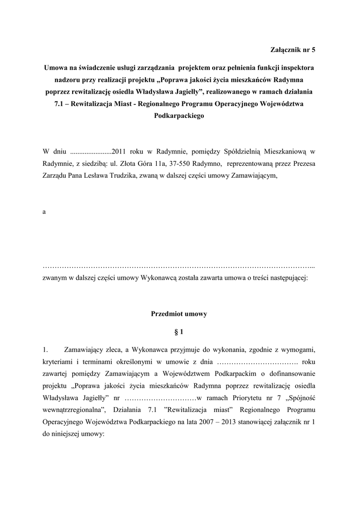 Załącznik nr 5 Umowa na świadczenie usługi zarządzania projektem oraz pełnienia funkcji inspektora nadzoru przy realizacji projektu „Poprawa jakości życia mieszkańców Radymna poprzez rewitalizację osiedla Władysława Jagiełły”, realizowanego w ramach działania 7.1 – Rewitalizacja Miast - Regionalnego Programu Operacyjnego Województwa Podkarpackiego W dniu .......................2011 roku w Radymnie, pomiędzy Spółdzielnią Mieszkaniową w Radymnie, z siedzibą: ul. Złota Góra 11a, 37-550 Radymno, reprezentowaną przez Prezesa Zarządu Pana Lesława Trudzika, zwaną w dalszej części umowy Zamawiającym, a …………………………………………………………………………………………………... zwanym w dalszej części umowy Wykonawcą została zawarta umowa o treści następującej: Przedmiot umowy §1 1. Zamawiający zleca, a Wykonawca przyjmuje do wykonania, zgodnie z wymogami, kryteriami i terminami określonymi w umowie z dnia ……………………………. roku zawartej pomiędzy Zamawiającym a Województwem Podkarpackim o dofinansowanie projektu „Poprawa jakości życia mieszkańców Radymna poprzez rewitalizację osiedla Władysława Jagiełły” nr …………………………w ramach Priorytetu nr 7 „Spójność wewnątrzregionalna”, Działania 7.1 ”Rewitalizacja miast” Regionalnego Programu Operacyjnego Województwa Podkarpackiego na lata 2007 – 2013 stanowiącej załącznik nr 1 do niniejszej umowy: a) Nadzór merytoryczny nad procedurą wyboru usługodawców, wykonawców i dostawców w niezbędnych do realizacji projektu zgodnie z wytycznymi Instytucji Zarządzającej Regionalnego Programu Operacyjnego Województwa Podkarpackiego. b) Finansowe rozliczanie Projektu „Poprawa jakości życia mieszkańców Radymna poprzez rewitalizację osiedla Władysława Jagiełły” Regionalnego Programu Operacyjnego zgodnie z wymogami Województwa Podkarpackiego oraz obowiązującymi przepisami krajowymi, w tym sporządzanie wniosków o płatność wraz z wymaganymi przez Instytucję Zarządzającą (Zarząd Województwa Podkarpackiego) załącznikami oraz sprawozdawczość finansową, c) Monitorowanie finansowej realizacji Projektu w oparciu o harmonogram rzeczowofinansowy i zatwierdzony budżet, d) Weryfikację formalną dokumentów księgowych związanych z realizacją Projektu zgodnie z wymogami Unii Europejskiej, w tym dokonywanie stosownych adnotacji na opisie tych dokumentów, e) Przygotowywanie harmonogramu składania wniosków o płatność we współpracy z Zamawiającym w oparciu o umowy z Dostawcami, f) Przygotowywanie aktualnej prognozy wydatków na bieżący rok budżetowy oraz na rok następny we współpracy z Zamawiającym w oparciu o umowy z Dostawcami, g) Pomoc zamawiającemu w monitorowaniu przebiegu realizacji Projektu oraz w razie konieczności informowanie Zamawiającego o zaistniałych nieprawidłowościach, h) Pomiar wartości wskaźników produktu osiągniętych dzięki realizacji Projektu zgodnie z określonymi wskaźnikami monitoringu dla Projektu., 2. Zamawiający zleca również, a Wykonawca przyjmuje do wykonania, zgodnie z wymogami, kryteriami i terminami określonymi w umowie z dnia ……………………………. roku zawartej pomiędzy Zamawiającym a Województwem Podkarpackim o dofinansowanie projektu „Poprawa jakości życia mieszkańców Radymna poprzez rewitalizację osiedla Władysława Jagiełły” nr …………………………w ramach Priorytetu nr 7 „Spójność wewnątrzregionalna”, Działania 7.1 ”Rewitalizacja miast” Regionalnego Programu Operacyjnego Województwa Podkarpackiego na lata 2007 – 2013 stanowiącej załącznik nr 1 do niniejszej umowy, a także na podstawie i w zgodzie z obowiązującymi w tej materii przepisami Polskiego Prawa Budowlanego pełnienie funkcji inspektora nadzoru budowlanego. §2 1. Jako koordynatora w zakresie realizacji obowiązków umownych ze strony Zamawiającego upoważnia się: 1) Prezes Zarządu ………………………..., 2) Główny Księgowy …………………………………… 3) Prawnik ……………………………………… 4) Dyrektor Techniczno-Administracyjny ………………………….. 2. Wykonawca ma prawo zlecić niektóre prace związane z wykonaniem umowy podwykonawcy, za którego działania lub zaniechania ponosi razem z nim solidarną odpowiedzialność wobec Zamawiającego. Obowiązki Zamawiającego §3 1. Zamawiający dostarcza Wykonawcy dane i dokumenty i materiały niezbędne do wykonania przedmiotu umowy a w szczególności: oferty dostawców, umowy z dostawcami, faktury, dowody bankowe dokonanych przelewów, protokoły odbioru. 2. Zamawiający jest zobowiązany do udostępnienia swoich kadr w celu szkolenia i bieżących konsultacji, w zakresie prawidłowego przygotowywania i prowadzania finansowej dokumentacji rozliczeniowej i technicznej projektu. 3. Zamawiający jest zobowiązany do zastrzeżenia w umowie z wyłonionym inspektorem nadzoru klauzuli o zobowiązaniu współpracy z Wykonawcą w zakresie prawidłowego przygotowywania i prowadzania dokumentacji rozliczeniowej i technicznej projektu 4. W przypadku stwierdzenia przez Wykonawcę, iż otrzymane dokumenty nie odpowiadają wymogom Regionalnego Programu Operacyjnego Województwa Podkarpackiego wówczas Wykonawca niezwłocznie, w terminie umożliwiającym ich skuteczne złożenie do Instytucji Zarządzającej, zawezwie do dostarczenia kompletnych/skorygowanych dokumentów, wskazując sposób ich korekty/uzupełnienia. Wykonawca nie ponosi odpowiedzialności za błędy zawarte w dokumentach, których nie jest bezpośrednim autorem. Obowiązki Wykonawcy §4 1. Wykonawca zobowiązuje się do wykonywania przedmiotu niniejszej umowy zgodnie ze zleceniem Zamawiającego, zasadami współczesnej wiedzy oraz obowiązującymi w tym zakresie przepisami w terminie do 14.12.2012 roku. 2. Jeżeli do przedmiotu umowy zostaną zgłos