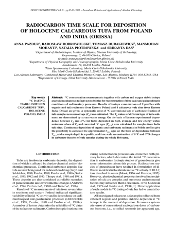 GEOCHRONOMETRIA Vol. 21, pp 85-96, 2002 – Journal on Methods and Applications of Absolute Chronology RADIOCARBON TIME SCALE FOR DEPOSITION OF HOLOCENE CALCAREOUS TUFA FROM POLAND AND INDIA (ORISSA) ANNA PAZDUR1, RADOS£AW DOBROWOLSKI2, TOMASZ DURAKIEWICZ3, MANMOHAN MOHANTI4, NATALIA PIOTROWSKA1 and SRIKANTA DAS4 1 Department of Radioisotopes, Institute of Physics, Silesian University of Technology, Krzywoustego 2, 44-100 Gliwice, Poland (e-mail: [email protected]) 2 Department of Physical Geography and Palaeogeography, Maria Curie-Sk³odowska University, Akademicka 19, 20-033 Lublin, Poland 3 Mass Spectrometry Laboratory, Maria Curie-Sk³odowska University, Plac Marii Curie-Sk³odowskiej 1, 20-031 Lublin, Poland; Los Alamos Laboratory, Condensed Matter and Thermal Physics Group, Los Alamos, Mailstop K764, NM 87545, USA 4 Department of Geology, Utkal University Bhubaneswar - 751004 (Orissa) India Key words words: C DATING, STABLE ISOTOPES, CALCAREOUS TUFA, HOLOCENE, POLAND, INDIA 14 Abstract: 14C concentration measurements together with carbon and oxygen stable isotope analysis in calcareous tufa give possibilities for reconstruction of time scale and palaeoclimatic conditions of sedimentary processes. Results of isotope examinations of 2 profiles with organic and tufa sediments from Eastern Poland and 8 calcareous tufa sites from Eastern India (Orissa) are given. A systematic error of 14C conventional age of carbonate fraction of tufa samples as reservoir age (TR) was estimated. The TR values of different type of tufa sediment are determined by stream water energy. On the basis of known experimental dependence between TR and δ13C for tufas deposited in high, average and low energy water, unknown values of TR and corrected 14C ages (TCCA) were calculated for samples from India tufa sites. Continuous deposition of organic and carbonate sediments in Polish profiles give the possibility to calculate the approximated TCCA ages on the basis of dependence between TCCA and a sample depth in a profile, and time scale reconstruction of δ13C and δ18O changes in carbonate fraction of tufa samples during the whole Holocene. 1. INTRODUCTION Tufas are freshwater carbonate deposits, the deposition of which is affected by physico-chemical and/or biochemical processes. Continental carbonate deposits like tufa are now being used for radiocarbon dating (Geyh and Schleicher, 1990; Pazdur, 1988; Pazdur et al., 1988a; Srdoc et al., 1980, 1982 and 1983; Thorpe et al., 1980 and 1981). These deposits are also considered as reliable recorders of palaeoclimatic and environmental changes (Andrews et al., 1994; Pazdur et al., 1988b and Turi et al., 1986). Results of 14C measurements of tufa from several sites in southern and eastern Poland indicated significant variability of initial 14C activity and its dependence on sedimentological and geochemical processes (Dobrowolski et al., 1999; Pazdur, 1988 and Pazdur et al., 1988a). A number of factors determine the reliability of 14C dates of the tufaceous sediments. Carbon isotopic fractionation during sedimentation processes are concerned with primary factors, which determine the initial 14C concentration in carbonates. Isotopic studies of groundwater give some information about this process. Radiocarbon studies of groundwater have resulted in formulation of different models which estimate initial 14C activity of HCO3ions dissolved in water (Mook, 1976 and Pearson, 1992). However, physicochemical processes involved in precipitation of tufa are complex and numerous environmental factors may influence them (Friedman, 1970; Usdowski et al., 1979 and Pazdur et al., 1988a, b). Direct application of such models in 14C dating of tufa has led to unsatisfactory results. All investigated calcareous tufa samples collected from different regions and profiles indicate depletion in 14C isotope in the moment of deposition. It causes a systematic error of conventional radiocarbon dates of carbonate fractions, i.e., so called reservoir (or apparent) age. RADIOCARBON TIME SCALE FOR DEPOSITION OF HOLOCENE CALCAREOUS TUFA ... Fig. 1. Location of studied sites with tufa deposits in Eastern India (Orissa State): Phulbani, Boudh, Nayagarh, Keonjhar and Mayurbhanj and in Eastern Poland (Lublin Upland): Krzywice-1(K) and Rudka-2(R). Conventional 14C age of carbonate sample is “older” than true radiocarbon age. The value of reservoir age has connection with the environment of tufa deposition. In streams with turbulent and fast flow, tufaceous sediments show the highest values of reservoir age, even 4000 years. Deposits of streams with moderate and variable flow show the lowest values of the reservoir age (ca 2500-2100 years), while the stagnant water deposits have the lowest values (less than 1000 years). According to Szulc (1983) and Pazdur and Szulc (1988a) a slightly simplified classification of was done: l Spring tufa: precipitated in turbulent, high energy water flow (oncoids, stromatolites and moss travertines). l Tufas (oncoids and moss travertines) and peloidal calcareous muds: precipitated in streams with low or variable water flow. l Calcareous muds precipitated in shallow, stagnant-water basins in conditions of semilimnic sedimentation. In the Indian context, tufa deposits (see Figs 3, 4 and 5) are classified as follows (Das and Mohanti, 1997). l Waterfall tufa (Fig. 3): precipitated from turbulent water flow (high energy condition); include stromatolic tufa, phytohermal (moss) tufa, phytoclastic tufa and occasional pisoids. l Slope tufa (Fig. 4): precipitated from moderately agitated water flow conditions; include stromatolitic tufa, phytotermal tufa and phytoclastic tufa. l Low gradient stream /river channel margin tufa (Fig. 5): precipitated from low or variable water flow; include stromatolic tufa and coated pebbles. None of the deposits indicate shallow or stagnantwater basin conditions. 86 A. Pazdur et al. and the type of sediment. The type of calcareous sediments depend