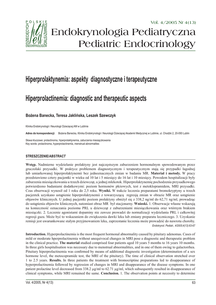 Vol. 4/2005 Nr 4(13) Endokrynologia Pediatryczna Pediatric Endocrinology Hiperprolaktynemia: aspekty diagnostyczne i terapeutyczne Hiperprolactinemia: diagnostic and therapeutic aspects Bożena Banecka, Teresa Jaklińska, Leszek Szewczyk Klinika Endokrynologii i Neurologii Dziecięcej AM w Lublinie Adres do korespondencji: Bożena Banecka, Klinika Endokrynologii i Neurologii Dziecięcej Akademii Medycznej w Lublinie, ul. Chodźki 2, 20-093 Lublin Słowa kluczowe: prolactinoma, hiperprolaktynemia, zaburzenia miesiączkowania Key words: prolactinoma, hyperprolactinemia, menstrual abnormalites STRESZCZENIE/ STRESZCZENIE/ABSTRACT Wstęp. Nadmierne wydzielanie prolaktyny jest najczęstszym zaburzeniem hormonalnym spowodowanym przez gruczolaki przysadki. W praktyce problemem diagnostycznym i terapeutycznym stają się przypadki łagodnej lub umiarkowanej hiperprolaktynemii bez jednoznacznych zmian w badaniu MR. Materiał i metody. W pracy przedstawiono cztery pacjentki w wieku od 10 lat i 5 miesięcy do 16 lat i 10 miesięcy. Powodem hospitalizacji były zaburzenia miesiączkowania u trzech dziewcząt, u jednej mlekotok. Hiperprolaktynemię pochodzenia przysadkowego potwierdzono badaniami dodatkowymi: poziom hormonów płciowych, test z metoklopramidem, MRI przysadki. Czas obserwacji wynosił od 1 roku do 2,5 roku. Wyniki. W trakcie leczenia preparatami bromokryptyny u trzech pacjentek uzyskano ustąpienie hiperprolaktynemii z towarzyszącą regresją zmian w obrazie MR oraz ustąpienie objawów klinicznych. U jednej pacjentki poziom prolaktyny obniżył się z 338,2 ng/ml do 62,71 ng/ml, prowadząc do ustąpienia objawów klinicznych, natomiast obraz MR był stacjonarny. Wnioski. 1. Obserwacje własne wskazują na konieczność oznaczania poziomu PRL u dziewcząt z zaburzeniami miesiączkowania oraz wtórnym brakiem miesiączki. 2. Leczenie agonistami dopaminy nie zawsze prowadzi do normalizacji wydzielania PRL i całkowitej regresji guza. Może być to wskazaniem do zwiększenia dawki leku lub zmiany preparatu leczniczego. 3. Uzyskanie remisji jest uwarunkowane stałym przyjmowaniem leku, zaprzestanie leczenia może prowadzić do nawrotu choroby. Endokrynol. Pediatr., 4/2005;4(13):63-67 Introduction. Hyperprolactinemia is the most frequent hormonal abnormality caused by pituitary adenomas. Cases of mild or moderate hperprolactinemia without unequivocal changes in MRI pose a diagnostic and therapeutic problem in the clinical practice. The material studied comprised four patients aged 10 years 5 months to 16 years 10 months. In three girls hospitalisation was necessary due to menstrual abnormalities, and in one of them owing to galactorrhea. Pituitary hiperprolactinemia was confirmed by means of additional diagnostic investigation (determination of a sex hormone level, the metocopramide test, the MRI of the pituitary). The time of clinical observation stretched over 1 to 2.5 years. Results. In three patients the treatment with bromocriptine preparations led to disappearance of hyperprolactinemia followed by regression of changes in MRI and disappearance of the disease symptoms. In one patient prolactine level decreased from 338.2 µg/ml to 62.71 µg/ml, which subsequently resulted in disappearance of clinical symptoms, while MRI remained the same. Conclusion. 1. The observation points at necessity to determine Vol. 4/2005, Nr 4(13) 63 Praca kazuistyczna Endokrynol. Pediatr., 4/2005;4(13):63-67 a prolactine level in girls with menstrual abnormalities and secondary amenorrhea. 2. Treatment with dopamineagonists did not always lead to normalisation of prolactine secretion and complete regression of the tumor. It may indicate that a drug dose should be increased or a therapeutic preparation changed. 3. Remission, however, is effected on condition that the drug is administered continually as any discontinuity in its administration may induce recurrence of the disease. Pediatr. Endocrinol., 4/2005;4(13):63-67 Wstęp Gruczolaki przysadki są najczęstszą przyczyną zaburzeń czynności układu podwzgórzowo-przysadkowego. Zwykle prowadzą do nadczynności przysadki, rzadziej do jej niedoczynności. Nadczynność przysadki najczęściej, bo w ok. 40%, wiąże się z nadmiernym wydzielaniem prolaktyny [1, 2]. Gruczolak przysadki wywodzący się z komórek laktotropowych autonomicznie wydzielających w nadmiarze prolaktynę nosi nazwę prolactinoma. W wyniku rozwoju guza dochodzi do hipogonadyzmu hiperprolaktynowego, objawiającego się u dziewcząt zespołem amenorrhea-galactorrhoea. Materiał W pracy przedstawiono cztery pacjentki z hiperprolaktynemią pochodzenia przysadkowego, potwierdzoną obserwacją kliniczną (u trzech zaburzenia miesiączkowania, u jednej mlekotok) oraz badaniami dodatkowymi (poziom hormonów płciowych, test z metoklopramidem, MRI przysadki). Wiek dziewcząt w chwili zgłoszenia się do kliniki wynosił od 10 lat i 5 miesięcy do 16 lat i 10 miesięcy. Czas obserwacji w trakcie leczenia trwał od 1 roku do 2,5 roku. Opis przypadków 1. F.E., wiek 10 lat 5 mies. Okres obserwacji 2,5 roku. Przed leczeniem – objawy kliniczne: pierwsza miesiączka miesiąc przed hospitalizacją; mlekotok; w badaniach dodatkowych: poziom prolaktyny 46,6 ng/ml; w USG gruczołów sutkowych obraz odpowiadający mastopatii torbielowato-włóknistej; w MRI przysadka o prawidłowej wielkości, asymetryczna, widoczne pojedyncze ognisko o średnicy 6 mm. Po leczeniu preparatami Bromocorn w dawce 2,5 mg i Mastodynon – stan kliniczny: miesiączki regularne; ustąpienie mlekotoku; w badaniach dodatkowych: zmniejszenie poziomu PRL do 0,33 ng/ml; w MRI regresja zmiany do średnicy 3 mm; w USG gruczołów piersiowych regresja zmian. 2. F.M., wiek 15 lat. Czas obserwacji 2 lata. Przed leczeniem – objawy kliniczne: wtórny brak miesiączki; wyniki badań dodatkowych: poziom 64 PRL 97,6 ng/ml; w MRI przysadka asymetryczna o uwypuklonym górnym zarysie. Obecne ognisko o średnicy 8 mm odpowiadające mikrogruc