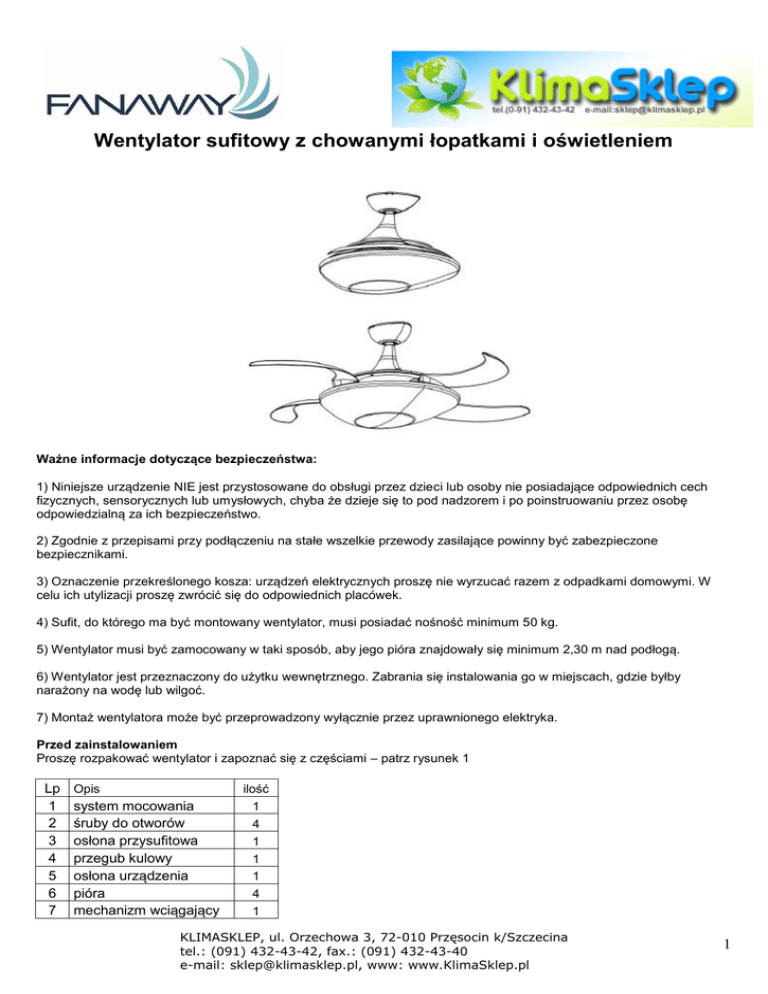 Wentylator sufitowy z chowanymi łopatkami i oświetleniem Ważne informacje dotyczące bezpieczeństwa: 1) Niniejsze urządzenie NIE jest przystosowane do obsługi przez dzieci lub osoby nie posiadające odpowiednich cech fizycznych, sensorycznych lub umysłowych, chyba że dzieje się to pod nadzorem i po poinstruowaniu przez osobę odpowiedzialną za ich bezpieczeństwo. 2) Zgodnie z przepisami przy podłączeniu na stałe wszelkie przewody zasilające powinny być zabezpieczone bezpiecznikami. 3) Oznaczenie przekreślonego kosza: urządzeń elektrycznych proszę nie wyrzucać razem z odpadkami domowymi. W celu ich utylizacji proszę zwrócić się do odpowiednich placówek. 4) Sufit, do którego ma być montowany wentylator, musi posiadać nośność minimum 50 kg. 5) Wentylator musi być zamocowany w taki sposób, aby jego pióra znajdowały się minimum 2,30 m nad podłogą. 6) Wentylator jest przeznaczony do użytku wewnętrznego. Zabrania się instalowania go w miejscach, gdzie byłby narażony na wodę lub wilgoć. 7) Montaż wentylatora może być przeprowadzony wyłącznie przez uprawnionego elektryka. Przed zainstalowaniem Proszę rozpakować wentylator i zapoznać się z częściami – patrz rysunek 1 Lp 1 2 3 4 5 6 7 Opis system mocowania śruby do otworów osłona przysufitowa przegub kulowy osłona urządzenia pióra mechanizm wciągający ilość 1 4 1 1 1 4 1 KLIMASKLEP, ul. Orzechowa 3, 72-010 Przęsocin k/Szczecina tel.: (091) 432-43-42, fax.: (091) 432-43-40 e-mail: [email protected], www: www.KlimaSklep.pl 1 8 9 10 11 12 13 14 podstawa lampy pierścień lampy osłona lampy śruby do drewna kołki rozporowe do ścian taśma wyrównująca regulator ścienny 1 1 1 2 2 4 1 Rysunek 1 2 Przy dotykaniu urządzenia włącznie z silnikiem, mechanizmem wciągającym, piórami i lampą proszę zachować ostrożność. Zaleca się podczas montażu założenie rękawic wełnianych aby uniknąć pozostawienia odcisków palców na powierzchni wentylatora. Dane techniczne: Model LD-0003-11/WH/GS/E27 LD-0003-11/SN/GS/E27 LD-0003-11/CH/GS/E27 Napięcie zasilania 220-240V, 50HZ 220-240V, 50HZ 220-240V, 50HZ Pilot 1,5V, AAA x 4 1,5V, AAA x 4 1,5V, AAA x 4 Wentylator (moc) 55 W 55 W 55 W Lampa Lampa kołowa T5, 55W Lampa kołowa T5, 55W Lampa kołowa T5, 55W Instalacja: Przed rozpoczęciem instalacji proszę upewnić się, że zasilanie zostało odłączone. Montaż mocowania sufitowego: Wywiercić w suficie dwa otwory i zamocować płytkę sufitową za pomocą dwóch podkładek i śrub do sufitu. Sufit musi posiadać nośność min. 50 kg. Uwaga: przy mocowaniu do sufitów betonowych należy zachować szczególną staranność. W razie potrzeby należy zastosować większe śruby i / lub kołki o większej wytrzymałości niż te dołączone w zestawie. 1) Usunąć osłonę przysufitową (3 z rysunku nr 1) poprzez poluzowanie 4 śrub z nacięciami. 2) Przesunąć osłonę na bok 3) Zamocować płytkę przysufitową (rysunek 2) za pomocą długich śrub do belki sufitowej. Zwrócić uwagę, aby śruby były zakotwiczone w belce na głębokość co najmniej 4 cm. Rysunek 2 Okablowanie – OPCJA Z REGULATOREM NAŚCIENNYM Można ułożyć kable do złącza w osłonie przysufitowej wentylatora. Warunki dotyczące złącza: - od zacisku regulatora obrotów oznaczonego „F” do zacisku oznaczonego „L” na złączu przy zaczepie wentylatora. - od zacisku regulatora / wyłącznika ściennego oznaczonego „Licht” do zacisku oznaczonego „LA” na złączu przy zaczepie wentylatora. - zero z zaciskiem „N” na złączu przy zaczepie wentylatora. - uziemienie z zaciskiem oznaczonym lub „N” na złączu przy zaczepie wentylatora. Uwaga: Na wypadek zagubienia pilota zdalnego sterowania lub na wypadek czynności konserwacyjnych doprowadzenie zasilania powinno odbywać się poprzez wyłącznik. Uwaga: Wentylatorów sufitowych posiadających zdalne sterowanie nie można obsługiwać za pomocą wyłączników ściennych (prędkość wentylatora lub lampa). 3 4 Schemat połączenia pomiędzy sterowaniem ściennym a złączem znajdującym się w zaczepie. Montaż osłony: Proszę poluzować złącze kulowe poluzowując śrubę mocującą. Wsunąć kable przez rurę i przez osłonę. Ponownie zamocować drążek do złącza kulowego. 5 Mocowanie wentylatora do płytki sufitowej 1) Unieść wentylator do góry i dosunąć przegub kulowy do płytki sufitowej. Zwrócić uwagę, aby nosek w obudowie płytki wszedł do nacięcia na przegubie. 2) Połączyć wtyczkę silnika z gniazdem (nr 1 – zdjęcie nr 3) 3) Dosunąć osłonę (nr 3 – rys.1) do płytki. Nakierować cztery otwory na siebie i wkręcić w nie śruby. Dokręcić wszystkie 4 śruby. Montaż podstawy lampy 1) Poluzować śrubę (1 – rys.5). Nakierować obie śruby z nacięciami na specjalne otwory w podstawie. 2) Przekręcić podstawę w kierunku przeciwnym do ruchu wskazówek zegara, aby śruby znalazły się na końcu nacięć. 3) Zabezpieczyć tylną śrubę nr 1 przy uchwycie podstawy. Dokręcić następnie wszystkie trzy śruby. Nie dokręcać za mocno. 4) Połączyć górną wtyczkę silnika z dolną wtyczką podstawy lampy. Mocowanie klosza do podstawy lampy Mocowanie klosza odbywa się poprzez przekręcenie go w kierunku zgodnym z ruchem wskazówek zegara. Uwaga: na kloszu znajdują się strzałki wskazujące kierunek obrotu w celu zamontowania klosza. RYSUNEK 6 Wymiana żarówki Wyjąć żarówkę z zaczepu sprężynowego i wymienić na nową. 6 Kierunek obrotów Wentylator może pracować kręcąc się w obu kierunkach. Tryb letni Gdy przełącznik znajduje się w pozycji „Down” (lato) wentylator kręci się w ruchu przeciwnym do ruchu wskazówek zegara. Ruch powietrza jest skierowany w dół w celu chłodzenia w lecie. Tryb zimowy Gdy przełącznik znajduje się w pozycji „up” (zima) wentylator kręci się w ruchu zgodnym z ruchem wskazówek zegara. Ruch powietrza jest skierowany w górę w celu oszczędzania