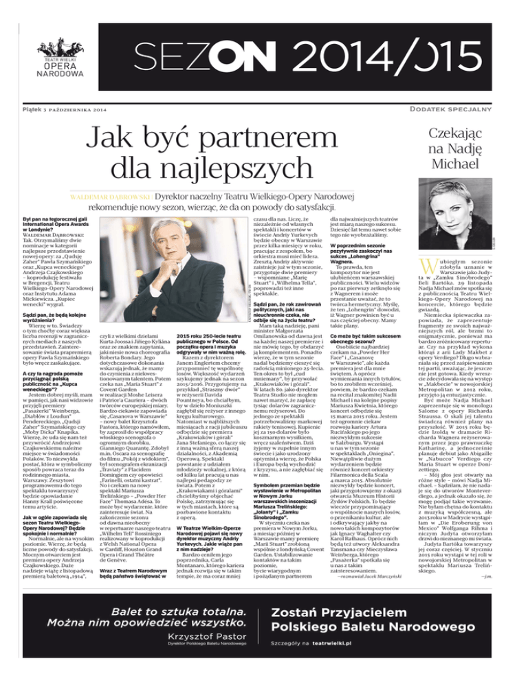 Piątek 3 października 2014 Dodatek specjalny Jak być partnerem dla najlepszych Czekając na Nadję Michael WALDEMAR DĄBROWSKI | Dyrektor naczelny Teatru Wielkiego-Opery Narodowej rekomenduje nowy sezon, wierząc, że da on powody do satysfakcji. KRZYSZTOF BIELIŃSKI/TW-ON Waldemar Dąbrowski: Tak. Otrzymaliśmy dwie nominacje w kategorii najlepsze przedstawienie nowej opery: za „Qudsję Zaher” Pawła Szymańskiego oraz „Kupca weneckiego" Andrzeja Czajkowskiego – koprodukcję festiwalu w Bregencji, Teatru Wielkiego-Opery Narodowej oraz Instytutu Adama Mickiewicza. „Kupiec wenecki” wygrał. Sądzi pan, że będą kolejne wyróżnienia? Wierzę w to. Świadczy o tym choćby coraz większa liczba recenzji w zagranicznych mediach z naszych przedstawień. Zainteresowanie świata prapremierą opery Pawła Szymańskiego było wręcz zaskakujące. A czy ta nagroda pomoże przyciągnąć polską publiczność na „Kupca weneckiego”? Jestem dobrej myśli, mam w pamięci, jak nasi widzowie przyjęli premiery „Pasażerki” Weinberga, „Diabłów z Loudun” Pendereckiego, „Qudsji Zaher” Szymańskiego czy „Moby Dicka” Knapika. Wierzę, że uda się nam też przywrócić Andrzejowi Czajkowskiemu należne miejsce w świadomości Polaków. To niezwykła postać, która w symboliczny sposób powraca teraz do rodzinnego miasta, Warszawy. Zeszytowi programowemu do tego spektaklu towarzyszyć będzie opowiadanie Hanny Krall poświęcone temu artyście. Jak w ogóle zapowiada się sezon Teatru WielkiegoOpery Narodowej? Będzie spokojnie i normalnie? Normalnie, ale na wysokim poziomie. Wierzę, że będą liczne powody do satysfakcji. Mocnym otwarciem jest premiera opery Andrzeja Czajkowskiego. Duże nadzieje wiążę z listopadową premierą baletową „1914”, czyli z wielkimi dziełami Kurta Joossa i Jiřiego Kyliána oraz ze znakiem zapytania, jaki niesie nowa choreografia Roberta Bondary. Jego dotychczasowe dokonania wskazują jednak, że mamy do czynienia z niekwestionowanym talentem. Potem czeka nas „Maria Stuart” z Covent Garden w realizacji Moshe Leisera i Patrice’a Cauriera – dwóch twórców europejskiej miary. Bardzo ciekawie zapowiada się „Casanova w Warszawie” – nowy balet Krzysztofa Pastora, którego namówiłem, by zaprosił do współpracy włoskiego scenografa o ogromnym dorobku, Gianniego Quarantę. Zdobył m.in. Oscara za scenografię do filmu „Pokój z widokiem”, był scenografem ekranizacji „Traviaty” z Placidem Domingiem czy opowieści „Farinelli, ostatni kastrat”. No i czekam na nowy spektakl Mariusza Trelińskiego – „Powder Her Face” Thomasa Adésa. To może być wydarzenie, które zainteresuje świat. Na zakończenie sezonu od dawna nieobecny w repertuarze naszego teatru „Wilhelm Tell” Rossiniego realizowany w koprodukcji z Welsh National Opera w Cardiff, Houston Grand Opera i Grand Théâtre de Genève. Wraz z Teatrem Narodowym będą państwo świętować w 2015 roku 250-lecie teatru publicznego w Polsce. Od początku opera i muzyka odgrywały w nim ważną rolę. Razem z dyrektorem Janem Englertem chcemy przypomnieć tę wspólnotę losów. Większość wydarzeń szykujemy jednak na sezon 2015/2016. Przygotujemy na przykład „Straszny dwór” w reżyserii Davida Pountneya, bo chciałbym, by w dzieło Moniuszki zagłębił się reżyser z innego kręgu kulturowego. Natomiast w najbliższych miesiącach z racji jubileuszu odbędzie się premiera „Krakowiaków i górali” Jana Stefaniego, co łączy się z inną ważną sferą naszej działalności, z Akademią Operową. Spektakl powstanie z udziałem młodzieży wokalnej, z którą od kilku lat pracują u nas najlepsi pedagodzy ze świata. Potem z „Krakowiakami i góralami” chcielibyśmy objechać Polskę, zatrzymując się w tych miastach, które są pozbawione kontaktu z operą. W Teatrze Wielkim-Operze Narodowej pojawi się nowy dyrektor muzyczny Andriy Yurkevych. Jakie wiąże pan z nim nadzieje? Bardzo ceniłem jego poprzednika, Carla Montanaro, którego kariera jednak rozwija się w takim tempie, że ma coraz mniej czasu dla nas. Liczę, że niezależnie od własnych spektakli i koncertów w świecie Andriy Yurkevych będzie obecny w Warszawie przez kilka miesięcy w roku, pracując z zespołem, bo orkiestra musi mieć lidera. Zresztą Andriy aktywnie zaistnieje już w tym sezonie, przygotuje dwie premiery – wspomniane „Marię Stuart” i „Wilhelma Tella”, poprowadzi też inne spektakle. Sądzi pan, że rok zawirowań politycznych, jaki nas nieuchronnie czeka, nie odbije się na życiu teatru? Mam taką nadzieję, pani minister Małgorzata Omilanowska od dawna jest na każdej naszej premierze i nie mówię tego, by obdarzyć ją komplementem. Ponadto wierzę, że w tym sezonie nadal będziemy cieszyć się radością minionego 25-lecia. Ten okres to był „cud mniemany”, by przywołać „Krakowiaków i górali”. W latach 80. jako dyrektor Teatru Studio nie mogłem nawet marzyć, że zapłacę tysiąc dolarów zagranicznemu reżyserowi. Do jednego ze spektakli potrzebowaliśmy markowej rakiety tenisowej. Kupienie jej za 150 dolarów było koszmarnym wysiłkiem, wręcz szaleństwem. Dziś żyjemy w zupełnie innym świecie i jako urodzony optymista wierzę, że Polska i Europa będą wychodzić z kryzysu, a nie zagłębiać się w nim. Symbolem przemian będzie wystawienie w Metropolitan w Nowym Jorku warszawskich inscenizacji Mariusza Trelińskiego: „Jolanty” i „Zamku Sinobrodego”. W styczniu czeka nas premiera w Nowym Jorku, a miesiąc później w Warszawie mamy premierę „Marii Stuart” zrobioną wspólnie z londyńską Covent Garden. Ustabilizowanie kontaktów na takim poziomie, bycie wiarygodnym i pożądanym partnerem dla najważniejszych teatrów jest miarą naszego sukcesu. Dziesięć lat temu nawet sobie tego nie wyobrażaliśmy. W poprzednim sezonie pozytywnie zaskoczył nas sukces „Lohengrina” Wagnera. G. GELLER