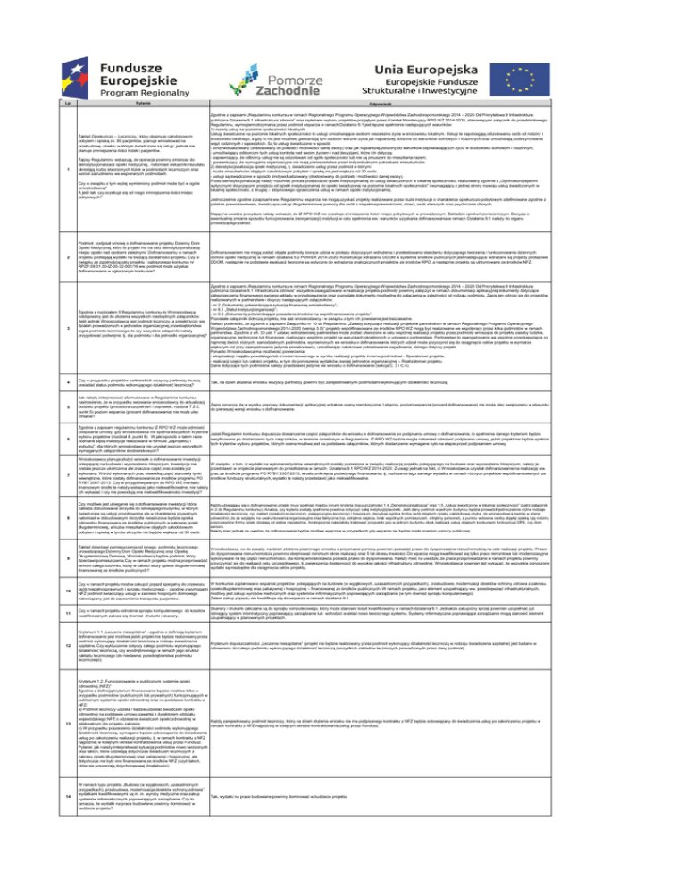 Lp. Pytanie Zakład Opiekuńczo – Leczniczy, który obejmuje całodobowym pobytem i opieką ok. 80 pacjentów, planuje wnioskować na przebudowę obiektu w którym świadczone są usługi, jednak nie planuje zmniejszenia ilości łóżek i pacjentów. 1 Zapisy Regulaminu wskazują, że operacje powinny zmierzać do deinstytucjonalizacji opieki medycznej, natomiast wskaźniki rezultatu określają liczbę stworzonych łóżek w podmiotach leczniczych oraz wzrost zatrudnienia we wspieranych podmiotach. Czy w związku z tym wyżej wymieniony podmiot może być w ogóle wnioskodawcą? A jeśli tak, czy oczekuje się od niego zmniejszenia ilości miejsc pobytowych? Odpowiedź Zgodnie z zapisami „Regulaminu konkursu w ramach Regionalnego Programu Operacyjnego Województwa Zachodniopomorskiego 2014 – 2020 Oś Priorytetowa 9 Infrastruktura publiczna Działanie 9.1 Infrastruktura zdrowia” oraz kryteriami wyboru projektów przyjętymi przez Komitet Monitorujący RPO WZ 2014-2020, stanowiącymi załącznik do przedmiotowego Regulaminu, wymogiem otrzymania przez podmiot wsparcia w ramach Działania 9.1 jest łączne spełnienie następujących warunków: 1) rozwój usług na poziomie społeczności lokalnych. Usługi świadczone na poziomie lokalnych społeczności to usługi umożliwiające osobom niezależne życie w środowisku lokalnym. Usługi te zapobiegają odizolowaniu osób od rodziny i środowiska lokalnego, a gdy to nie jest możliwe, gwarantują tym osobom warunki życia jak najbardziej zbliżone do warunków domowych i rodzinnych oraz umożliwiają podtrzymywanie więzi rodzinnych i sąsiedzkich. Są to usługi świadczone w sposób: - zindywidualizowany (dostosowany do potrzeb i możliwości danej osoby) oraz jak najbardziej zbliżony do warunków odpowiadających życiu w środowisku domowym i rodzinnym; - umożliwiający odbiorcom tych usług kontrolę nad swoim życiem i nad decyzjami, które ich dotyczą; - zapewniający, że odbiorcy usług nie są odizolowani od ogółu społeczności lub nie są zmuszeni do mieszkania razem; - gwarantujący, że wymagania organizacyjne nie mają pierwszeństwa przed indywidualnymi potrzebami mieszkańców. 2) deinstytucjonalizacja opieki medycznej, tj. świadczenie usług przez podmiot w którym: - liczba mieszkańców objętych całodobowym pobytem i opieką nie jest większa niż 30 osób; - usługi są świadczone w sposób zindywidualizowany (dostosowany do potrzeb i możliwości danej osoby). Przez deinstytucjonalizację należy rozumieć proces przejścia od opieki instytucjonalnej do usług świadczonych w lokalnej społeczności, realizowany zgodnie z „Ogólnoeuropejskimi wytycznymi dotyczącymi przejścia od opieki instytucjonalnej do opieki świadczonej na poziomie lokalnych społeczności” i wymagający z jednej strony rozwoju usług świadczonych w lokalnej społeczności, z drugiej – stopniowego ograniczenia usług w ramach opieki instytucjonalnej. Jednocześnie zgodnie z zapisami ww. Regulaminu wsparcia nie mogą uzyskać projekty realizowane przez duże instytucje o charakterze opiekuńczo-pobytowym zdefiniowane zgodnie z polskim prawodawstwem, świadczące usługi długoterminowej pomocy dla osób z niepełnosprawnościami, dzieci, osób starszych oraz psychicznie chorych. Mając na uwadze powyższe należy wskazać, że IZ RPO WZ nie oczekuje zmniejszenia ilości miejsc pobytowych w prowadzonym Zakładzie opiekuńczo-leczniczym. Decyzja o ewentualnej zmianie sposobu funkcjonowania (reorganizacji) instytucji w celu spełnienia ww. warunków uzyskania dofinansowania w ramach Działania 9.1 należy do organu prowadzącego zakład. 2 3 Podmiot podpisał umowę o dofinansowanie projektu Dzienny Dom Opieki Medycznej, który to projekt ma na celu deinstytucjonalizację miejsc opieki nad osobami zależnymi. Dofinansowaniu w ramach projektu podlegają wydatki na bieżącą działalności projektu. Czy w związku ze zgodnością celu projektu i ogłoszonego konkursu nr RPZP.09.01.00-IZ-00-32-001/16 ww. podmiot może uzyskać dofinansowanie w ogłoszonym konkursie? Dofinansowaniem nie mogą zostać objęte podmioty biorące udział w pilotażu dotyczącym wdrożenia i przetestowania standardu dotyczącego tworzenia i funkcjonowania dziennych domów opieki medycznej w ramach działania 5.2 POWER 2014-2020. Konstrukcja wdrażania DDOM w systemie środków publicznych jest następująca: wdrażane są projekty pilotażowe DDOM, następnie na podstawie ewaluacji tworzone są wytyczne do wdrażania analogicznych projektów ze środków RPO, a następnie projekty są utrzymywane ze środków NFZ. Zgodnie z zapisami „Regulaminu konkursu w ramach Regionalnego Programu Operacyjnego Województwa Zachodniopomorskiego 2014 – 2020 Oś Priorytetowa 9 Infrastruktura publiczna Działanie 9.1 Infrastruktura zdrowia” wszystkie zaangażowane w realizację projektu podmioty powinny załączyć w ramach dokumentacji aplikacyjnej dokumenty dotyczące zabezpieczenia finansowego swojego wkładu w przedsięwzięcie oraz pozostałe dokumenty niezbędne do załączenia w zależności od rodzaju podmiotu. Zapis ten odnosi się do projektów realizowanych w partnerstwie i dotyczy następujących załączników: - nr 2 „Dokumenty potwierdzające sytuację finansową wnioskodawcy”; - nr 6.1 „Statut instytucji/organizacji”; Zgodnie z rozdziałem 5 Regulaminu konkursu to Wnioskodawca - nr 6.5 „Dokumenty potwierdzające posiadanie środków na współfinansowanie projektu”. zobligowany jest do złożenia wszystkich niezbędnych załączników. Pozostałe załączniki dotyczą projektu, nie zaś wnioskodawcy i w związku z tym ich powielanie jest bezzasadne. Jeśli jednak Wnioskodawcą jest podmiot leczniczy, a projekt tyczy się Należy podkreślić, że zgodnie z zapisami Załącznika nr 10 do Regulaminu: „Zasady dotyczące realizacji projektów partnerskich w ramach Regionalnego Programu Operacyjnego działań prowadzonych w jednostce or