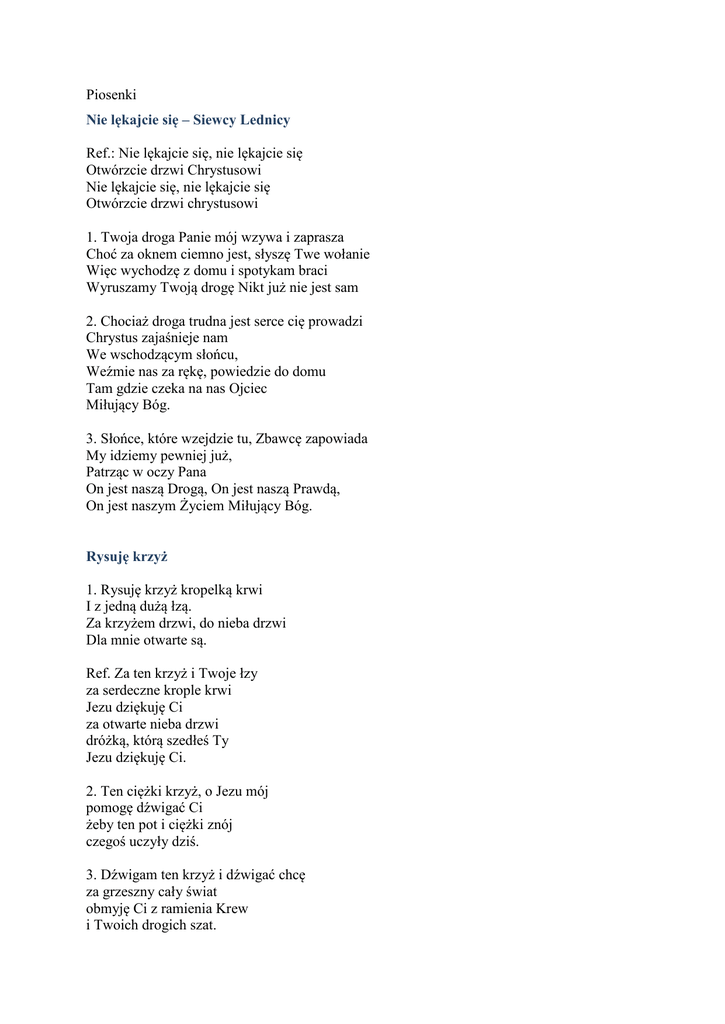 Piosenki Nie lękajcie się – Siewcy Lednicy Ref.: Nie lękajcie się, nie lękajcie się Otwórzcie drzwi Chrystusowi Nie lękajcie się, nie lękajcie się Otwórzcie drzwi chrystusowi 1. Twoja droga Panie mój wzywa i zaprasza Choć za oknem ciemno jest, słyszę Twe wołanie Więc wychodzę z domu i spotykam braci Wyruszamy Twoją drogę Nikt już nie jest sam 2. Chociaż droga trudna jest serce cię prowadzi Chrystus zajaśnieje nam We wschodzącym słońcu, Weźmie nas za rękę, powiedzie do domu Tam gdzie czeka na nas Ojciec Miłujący Bóg. 3. Słońce, które wzejdzie tu, Zbawcę zapowiada My idziemy pewniej już, Patrząc w oczy Pana On jest naszą Drogą, On jest naszą Prawdą, On jest naszym Życiem Miłujący Bóg. Rysuję krzyż 1. Rysuję krzyż kropelką krwi I z jedną dużą łzą. Za krzyżem drzwi, do nieba drzwi Dla mnie otwarte są. Ref. Za ten krzyż i Twoje łzy za serdeczne krople krwi Jezu dziękuję Ci za otwarte nieba drzwi dróżką, którą szedłeś Ty Jezu dziękuję Ci. 2. Ten ciężki krzyż, o Jezu mój pomogę dźwigać Ci żeby ten pot i ciężki znój czegoś uczyły dziś. 3. Dźwigam ten krzyż i dźwigać chcę za grzeszny cały świat obmyję Ci z ramienia Krew i Twoich drogich szat. Matka, która pod krzyżem stała 1. Jeśli masz chwile smutne w swym życiu powiedz to Matce Kiedy rozpacz rozdziera Twe serce ofiaruj się Jej Ref.: Matce która pod krzyżem stała Matce która się z Synem żegnała Która uczyć cię będzie pokory Cierpienia znieść ci pomoże Przepraszam Cię, Boże Przepraszam Cię, Boże skrzywdzony w człowieku Przepraszam dziś wszystkich was. Żałuję za wszystko. To moja wina jest. Bóg kocha mnie Bóg kocha mnie Takiego jakim jestem Raduje się każdym moim gestem ALLELUJA!! Boża radość mnie rozpiera OOOO!! Alleluja, wznieś pod niebo głos Alleluja, wznieś pod niebo głos, Pan dał chleba moc, alleluja Jezus Pan komunią dla nas, co dzień staje się, On rozrywa grzechu pęta złe. Cóż uczyni mi człowiek, kiedy ze mną Pan, Bóg podnosi, podtrzymuje mnie. Choć jestem mały jak palec 1. Choć jestem mały jak palec Choć jestem mały jak mrówka Ale proszę Cię Panie Wejdź do mego serduszka Na na na na na Ale proszę Cię Panie Wejdź do mego serduszka 2. Jesteś w moim serduszku Wszechmogący mój Panie. Wspieraj mego tatusia, Pobłogosław też mamie Na na na na na Wspieraj mego tatusia, Pobłogosław też mamie. Dzięki Jezu 1. Dzięki Jezu, dzięki Jezu Dzięki Ci, że kochasz mnie. Dzięki Jezu, dzięki Jezu Dzięki Ci o dzięki Ci, że kochasz mnie. 2. Tam na Golgocie umarłeś za mnie Dzięki Ci, że kochasz mnie... 3 Zmartwychwstałeś, żyjesz we mnie Dzięki ci, że kochasz mnie... 4. Wkrótce przyjdziesz, stąd mnie weźmiesz Dzięki ci, że kochasz mnie… 5. Alleluja, alleluja Dzięki Ci, że kochasz mnie… Gdybym wiarę tak maleńką miał Gdybym wiarę tak maleńką miał Jak ziarenko gorczycy jest Powiedziałbym górze tej przesuń się A z hukiem by zmieniła miejsce swe / x2 Jak mi dobrze Jak mi dobrze z Tobą być, Panie /x2 Trzymaj mnie mocno dziś Chcę przy Tobie zawsze być /x2 Panie, Panie, Panie, Panie /x2 Twoja Miłość wypełnia mnie, Panie /x2 Twoja radość wypełnia mnie, Panie /x2 I Twój pokój wypełnia mnie, Panie /x2 O Jezu ufam Tobie za ręce, stopy obie Za przebite serce Ufam, ufam Tobie Lolek – Magda Anioł Wadowice, rok 20, Emil rodzi syna szkoła, teatr i kapłaństwo tutaj się zaczyna. Pierwsze mecze, pierwsze smutki, w gimnazjum klasówki, po maturze z kolegami wypad na kremówki. Ref: Nie ma lepszego od Jana Pawła II!! Nie ma lepszego od Jana Pawła II!! Kapłan Lolek dla Kościoła to prawdziwy diament W Polsce wtedy, krótko mówiąc jest niemały zamęt Ksiądz Sapiecha bez wątpienia prym w Krakowie wiedzie Lolek rzeczy swe pakuje i do Rzymu jedzie W Niegowici i Krakowie posługę zaczyna Najpierw biskup, potem arcy i w końcu kardynał Przyjaciele czują w sercu, że ciąg dalszy będzie Paweł VI siedzi wtedy na Piotra Urzędzie Całą drogę życia oddał Lolek swemu Panu, wnet ta droga go zawiedzie aż do Watykanu. 16 października 78 roku słyszy świat "Habemus Papam" i doznaje szoku!! Papież Polak ma pomysły, nowy duch się budzi Nie chce siedzieć w Watykanie - ciągnie go do ludzi Pielgrzymuje, przełamuje i wyzwania stawia Wszyscy widzą jak oblicze ziemi się odnawia 13 maja cały świat oddech wstrzymuj, Ali w stronę Jana Pawła pistolet kieruje. Matka Boża miała tutaj plany widać własne, Totus Tuus i wszystko staje się zupełnie jasne. Wielki rodak w swej Ojczyźnie czuje się jak w niebie Jest tu gościem numer jeden, chociaż jest u siebie Ziemia Święta i świat cały stoją mu otworem Dla tych którzy cenią pokój, jest Jan Paweł wzorem Stary meczet, synagoga, mowa w ONZ-ecie Encykliki, Jubileusz, Trzecie Tysiąclecie Mimo bólu i zmęczenia szlaki wciąż przemierza Papież kocha młodych, młodzi kochają papieża 2005 to kwiecień Bóg sam decyduje, świat się modli, gdy Jan Paweł Niebo obejmuje. Pontyfikat się nie kończy, dobrze o tym wiecie. Papież dalej pielgrzymuje lecz na tamtym świecie. Ofiaruję Tobie, Panie mój Ofiaruję Tobie, Panie mój całe życie me. Cały jestem Twój, aż na wieki. Oto moje serce, przecież wiesz – Tyś miłością mą jedyną jest. Ofiaruję Ci Ofiaruje Ci moją noc i mój dzień, moją pracę i mój sen, wszystko, co drogie mi, Panie, ofiaruję Ci. Bo dla Ciebie ja żyję, moim Królem jesteś Ty. To, co mam, wszystko ofiaruję Ci. O o o Niebo jest w sercu mym O, o, o, niebo jest w sercu mym O, o, o, niebo jest w sercu mym 1. Królestwo Boga tutaj jest - Niebo jest w sercu mym Majestat Jego wokół nas - Niebo jest w sercu mym I w Nim radości pełnia jest - Niebo jest w sercu mym Świętości światło bije w krąg - Niebo jest w sercu mym 2. Swe cenne życie za mnie dał - ... Bym w sobie wieczne życie miał - ... W Chrystusie moja świętość jest - ... Nadzieja ma, dziedzic