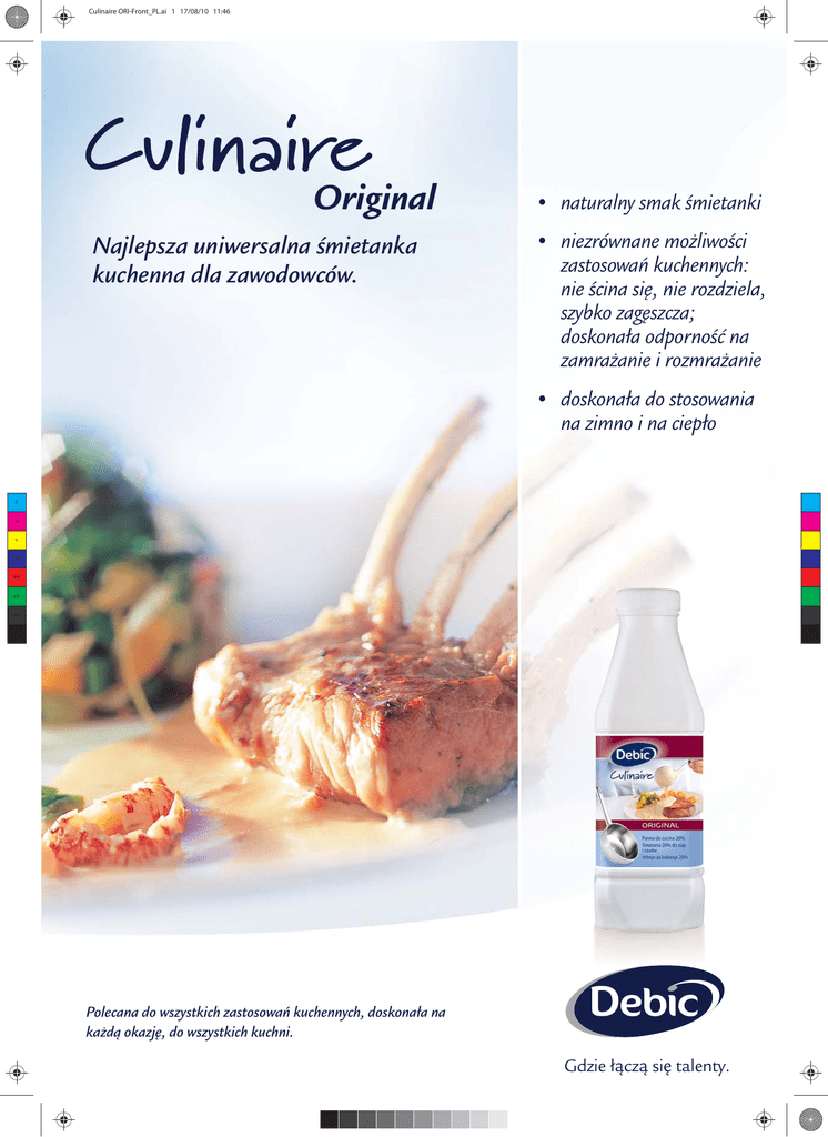 Culinaire ORI-Front_PL.ai 1 17/08/10 11:46 Original Najlepsza uniwersalna śmietanka kuchenna dla zawodowców. • naturalny smak śmietanki • niezrównane możliwości zastosowań kuchennych: nie ścina się, nie rozdziela, szybko zagęszcza; doskonała odporność na zamrażanie i rozmrażanie • doskonała do stosowania na zimno i na ciepło C M Y CM MY CY CMY K Polecana do wszystkich zastosowań kuchennych, doskonała na każdą okazję, do wszystkich kuchni. Gdzie łączą się talenty. Culinaire ORI-Back PL.ai 1 9/08/10 14:42 Gwarancja szybkiego wiązania: Original Szybkie wiązanie pozwala uzyskać doskonałą konsystencję śmietany do dekoracji potraw. Szybkość wiązania śmietanki Culinaire Original daje czas o 1 minutę krótszy (3 min 40 sekund zamiast 4 min 40 sekund w przypadku typowej śmietanki 35%), co oznacza oszczędność czasu o 21,5%. Tradycyjna śmietanka kuchenna o pełnym, burgundzkim smaku i zrównoważonym posmaku. Właściwości • bez kłopotu: nie ścina się, tłuszcz się nie oddziela. Pozostaje jednorodna nawet na dużym ogniu • odporna na zamrażanie i rozmrażanie (stabilna przy odświeżaniu) • odporna na głębokie zamrażanie . Typowa śmietanka 35% Czas Debic – marka dla zawodowców: • ponad trzydziestoletnie doświadczenie w przetwarzaniu i uszlachetnianiu śmietany Stosowanie • do przygotowywania gorących sosów • do przygotowywania dressingów, np. tradycyjnego sosu miętowego • do zabielania zup, sosów itd • od ponad 30 lat produkty na bazie śmietany wyłącznie dla zawodowców • wszystkie produkty na bazie śmietany Debic wytwarzane są z mleka pochodzącego z własnych gospodarstw mleczarskich, co gwarantuje całkowicie zintegrowany łańcuch jakości. Dzięki temu Debic zawsze gwarantuje klientom najwyższą jakość produktów mlecznych. Przechowywanie • przechowywać w lodówce w temperaturze nie wyższej niż +7°C • po otwarciu przechowywać w lodówce i zużyć w ciągu 4 dni • optymalna temperatura stosowania: od +2°C do +7°C C Culinaire Original M Y CM MY CY CMY K Więcej informacji o naszych produktach oraz ciekawe przepisy na stronie www.debic.com DB04-324.0-1PL-0810 ASORTYMENT OPAKOWANIE ŚREDNIA WARTOŚĆ ODŻYWCZA W 100 g Produkt Culinaire Original 12 x 1L Produkt Culinaire Original 12 x 1L Zawartość opakowania 1L Wymiary kartonu w mm (dł. x szer. x wys.) 323 x 244 x 256 Rodzaj opakowania Butelka Liczba opakowań w kartonie 12 Liczba kartonów na palecie 50 Numer produktu 7221424 EAN - opakowanie jednostkowe 54 10488 014836 EAN - karton 54 10488 060048 Okres przechowywania po wyprodukowaniu 136 dni Przechowywanie w lodówce 12,8 Waga brutto kartonu, kg Waga brutto palety, kg 664 Wymiary palety w cm (dł. x szer. x wys.) 120 x 80 x 143 Produkt Culinaire Original kJ 885 kcal 212 Białka 2,8 g Węglowodany 4,9 g Tłuszcze 20 g Wyprodukowane w Belgii przez FrieslandCampina Professional Wyłączny dystrybutor w Polsce: Farutex Sp. z.o.o. Centralny Dział Sprzedaży, ul. Białołęcka 168, 03-253 Warszawa e-mail: [email protected] - Więcej informacji na www.farutex.pl Gdzie łączą się talenty.