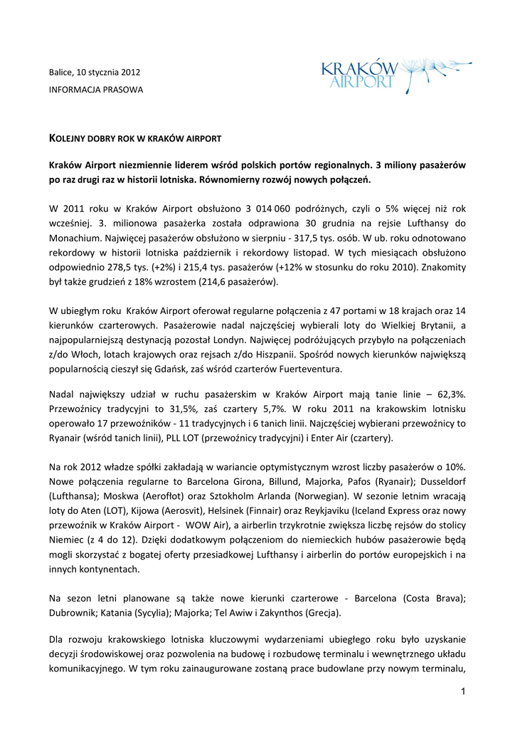 Balice, 10 stycznia 2012 INFORMACJA PRASOWA KOLEJNY DOBRY ROK W KRAKÓW AIRPORT Kraków Airport niezmiennie liderem wśród polskich portów regionalnych. 3 miliony pasażerów po raz drugi raz w historii lotniska. Równomierny rozwój nowych połączeń. W 2011 roku w Kraków Airport obsłużono 3 014 060 podróżnych, czyli o 5% więcej niż rok wcześniej. 3. milionowa pasażerka została odprawiona 30 grudnia na rejsie Lufthansy do Monachium. Najwięcej pasażerów obsłużono w sierpniu - 317,5 tys. osób. W ub. roku odnotowano rekordowy w historii lotniska październik i rekordowy listopad. W tych miesiącach obsłużono odpowiednio 278,5 tys. (+2%) i 215,4 tys. pasażerów (+12% w stosunku do roku 2010). Znakomity był także grudzień z 18% wzrostem (214,6 pasażerów). W ubiegłym roku Kraków Airport oferował regularne połączenia z 47 portami w 18 krajach oraz 14 kierunków czarterowych. Pasażerowie nadal najczęściej wybierali loty do Wielkiej Brytanii, a najpopularniejszą destynacją pozostał Londyn. Najwięcej podróżujących przybyło na połączeniach z/do Włoch, lotach krajowych oraz rejsach z/do Hiszpanii. Spośród nowych kierunków największą popularnością cieszył się Gdańsk, zaś wśród czarterów Fuerteventura. Nadal największy udział w ruchu pasażerskim w Kraków Airport mają tanie linie – 62,3%. Przewoźnicy tradycyjni to 31,5%, zaś czartery 5,7%. W roku 2011 na krakowskim lotnisku operowało 17 przewoźników - 11 tradycyjnych i 6 tanich linii. Najczęściej wybierani przewoźnicy to Ryanair (wśród tanich linii), PLL LOT (przewoźnicy tradycyjni) i Enter Air (czartery). Na rok 2012 władze spółki zakładają w wariancie optymistycznym wzrost liczby pasażerów o 10%. Nowe połączenia regularne to Barcelona Girona, Billund, Majorka, Pafos (Ryanair); Dusseldorf (Lufthansa); Moskwa (Aerofłot) oraz Sztokholm Arlanda (Norwegian). W sezonie letnim wracają loty do Aten (LOT), Kijowa (Aerosvit), Helsinek (Finnair) oraz Reykjaviku (Iceland Express oraz nowy przewoźnik w Kraków Airport - WOW Air), a airberlin trzykrotnie zwiększa liczbę rejsów do stolicy Niemiec (z 4 do 12). Dzięki dodatkowym połączeniom do niemieckich hubów pasażerowie będą mogli skorzystać z bogatej oferty przesiadkowej Lufthansy i airberlin do portów europejskich i na innych kontynentach. Na sezon letni planowane są także nowe kierunki czarterowe - Barcelona (Costa Brava); Dubrownik; Katania (Sycylia); Majorka; Tel Awiw i Zakynthos (Grecja). Dla rozwoju krakowskiego lotniska kluczowymi wydarzeniami ubiegłego roku było uzyskanie decyzji środowiskowej oraz pozwolenia na budowę i rozbudowę terminalu i wewnętrznego układu komunikacyjnego. W tym roku zainaugurowane zostaną prace budowlane przy nowym terminalu, 1 hotelu i stacji kolejowej, a także rozpocznie się remont dróg kołowania. Zakończenie wszystkich prac zaplanowano na rok 2015 r. Terminal pasażerski po rozbudowie będzie miał blisko 55 tys. m kw. powierzchni użytkowej (obecnie 15 tys.), 46 stanowisk check in, 18 gateów, a jego docelowa przepustowość wyniesie 8 mln pasażerów. Naziemną kładką będzie on połączony ze stacją kolejową, która zostanie wybudowana na tyłach parkingu wielopoziomowego. Nowy wewnętrzny układ komunikacyjny, z pięcioma pasami ruchu, ułatwi dojazd do terminalu, parkingu oraz czterogwiazdkowego hotelu Hilton Garden Inn. Wartość budowy i rozbudowy terminalu oraz przebudowy wewnętrznego układu komunikacyjnego to ok. 400 mln zł, z czego 100 mln zł mają stanowić unijne dotacje (z Programu Operacyjnego Infrastruktura i Środowisko oraz Małopolskiego Regionalnego Programu Operacyjnego). Kontakt dla mediów: Urszula Podraza Rzecznik prasowy/Kierownik Działu PR [email protected] Tel.: 12 639 33 03, 0 664 404 486 2