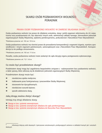 SKARGI OSÓB POZBAWIONYCH WOLNOŚCI PORADNIK PRAWA OSOBY POZBAWIONEJ WOLNOŚCI W ZAKRESIE SKŁADANIA SKARG Osoba pozbawiona wolności ma prawo do składania wniosków, skarg i próśb organowi właściwemu do ich rozpatrzenia oraz przedstawiania ich, bez obecności innych osób, administracji zakładu karnego, kierownikom jednostek organizacyjnych Służby Więziennej, sędziemu penitencjarnemu, prokuratorowi i Rzecznikowi Praw Obywatelskich.* *Podstawa prawna: art. 102 ust. 10 k.k.w. Osoba pozbawiona wolności ma również prawo do prowadzenia korespondencji z organami ścigania, wymiaru sprawiedliwości i innymi organami państwowymi, samorządowymi oraz z Rzecznikiem Praw Obywatelskich. Korespondencja ta nie podlega cenzurowaniu. *Podstawa prawna: art. 102 ust. 11 k.k.w. Ponadto, osoba pozbawiona wolności może zaskarżyć do sądu decyzję organu postępowania wykonawczego. *Podstawa prawna: art. 7 § 1. k.k.w. Co może być przedmiotem skargi? Przedmiotem skargi mogą być zagadnienia bezpośrednio związane z wykonywaniem kary pozbawienia wolności, a także sprawy, które odnoszą się do działalności jednostek organizacyjnych Służby Więziennej. Przedmiotem skargi może być: niewłaściwa opieka medyczna; traktowanie przez funkcjonariuszy i pracowników Służby Więziennej; stosowanie kar dyscyplinarnych; niewłaściwe warunki bytowe; sposób załatwiania skarg. Jaką drogą można złożyć skargę? Istnieją trzy drogi składania skarg: Skarga w tzw. systemie wewnętrznym; Skarga w tzw. systemie zewnętrznym składana do sądu penitencjarnego; Skarga w tzw. systemie zewnętrznym składana do Rzecznika Praw Obywatelskich. * śledczych Informacje dotyczą osób skazanych i tymczasowo aresztowanych, przebywających zarówno w zakładach karnych jak i aresztach Należy pamiętać, że w wielu przypadkach osoba pozbawiona wolności ma prawo do dochodzenia swoich praw również na drodze cywilnej. Pozew cywilny należy wnieść do sądu właściwego dla jednostki, w której więzień przebywa. W wypadkach związanych z niewłaściwą opieką medyczną podstawą pozwu może być art. 448 k.c. w związku z art. 24 k.c. – naruszenie dób osobistych Podstawa prawna: art. 102 § 10 k.k.w Skarga w systemie wewnętrznym i zewnętrznym może być złożona równolegle. SKARGA W SYSTEMIE WEWNĘTRZNYM Kto może złożyć skargę •Osoba pozbawiona wolności Ponadto, za jej zgodą lub w interesie publicznym skargi składać mogą: rodzina; inna osoba; pełnomocnik prawny osoby pozbawionej wolności; organizacje społeczne; organizacje pozarządowe; Rzecznik Praw Obywatelskich Kto rozpatruje skargi? Skargi dotyczące działalności zakładów karnych i aresztów śledczych oraz postępowania funkcjonariuszy i pracowników Służby Więziennej są rozpatrywane przez: Kierownika jednostki organizacyjnej, a więc najczęściej dyrektora więzienia - jeżeli skarga jest do niego adresowana, a nie dotyczy jego bezpośredniej działalności lub bezpośredniej działalności jego zastępcy i podjętych przez nich decyzji, chyba że w tym zakresie zostanie uznana za zasadną; Dyrektora Okręgowego Służby Więziennej - jeżeli skarga dotyczy działalności nadzorowanej przez niego jednostki organizacyjnej i nie została załatwiona w trybie określonym jak powyżej lub przekazana temu kierownikowi przez Dyrektora Okręgowego Służby Więziennej Dyrektora Generalnego Służby Więziennej lub osobę przez niego wyznaczoną - jeżeli skarga dotyczy działalności okręgowego inspektoratu Służby Więziennej i nie została załatwiona w trybie określonym w pkt 1; Ministra Sprawiedliwości lub osobę przez niego wyznaczoną - jeżeli skarga dotyczy działalności Centralnego Zarządu Służby Więziennej i nie została załatwiona w trybie określonym w pkt 1. *Podstawa prawna:§ 3 Rozporządzenia Ministra Sprawiedliwości z dnia 13 sierpnia 2003 r. w sprawie sposobów załatwiania wniosków, skarg i próśb osób osadzonych w zakładach karnych i aresztach śledczych W jakiej formie należy złożyć skargę? Skarga może zostać złożona: pisemnie telegraficznie telefaksem pocztą elektroniczną ustnie do protokołu. Protokół musi zawierać: datę przyjęcia wniosku/skargi/prośby, imię i nazwisko osoby zgłaszającej, zwięzły opis treści sprawy Osoby pozbawione wolności mają prawo do złożenia skargi bez obecności innych osób. *Podstawa prawna:§7 p. 1 Rozporządzenia Ministra Sprawiedliwości z dnia 13 sierpnia 2003 r. w sprawie sposobów załatwiania wniosków, skarg i próśb osób osadzonych w zakładach karnych i aresztach śledczych. W jakim terminie należy rozpatrzyć skargę? Skargi w systemie wewnętrznym powinny zostać rozpatrzone w ciągu 14 dni, jednak w przypadku, gdy konieczne jest przeprowadzenie czynności wyjaśniających, termin ten wydłuża się – w takiej sytuacji skarga powinna zostać rozpatrzona bez zbędnej zwłoki. *Podstawa prawna: §8 pkt 1 i 2 Rozporządzenia Ministra Sprawiedliwości z dnia 13 sierpnia 2003 r. w sprawie sposobów załatwiania wniosków, skarg i próśb osób osadzonych w zakładach karnych i aresztach śledczych. Gdy skarga nie jest precyzyjna, przyznany zostaje termin do jej uzupełnienia – 7 dni. W sytuacji, gdy skarga została złożona do niewłaściwego organu, powinna zostać przekazana do właściwego organu w terminie 7 dni. *Podstawa prawna: §5 oraz §7 pkt. 5 Rozporządzenia Ministra Sprawiedliwości z dnia 13 sierpnia 2003 r. w sprawie sposobów załatwiania wniosków, skarg i próśb osób osadzonych w zakładach karnych i aresztach śledczych Jak może zakończyć się wewnętrzne postępowanie skargowe? Postępowanie skargowe może dotyczyć różnych aspektów wykonywania kary pozbawienia wolności. Jeżeli przedmiotem postępowania była decyzja, z którą osoba pozbawiona wolności się nie zgadza, w wyniku wewnętrznego postępowania skargowego może dojść do uchylenia lub zmiany tej decyzji albo wydania no