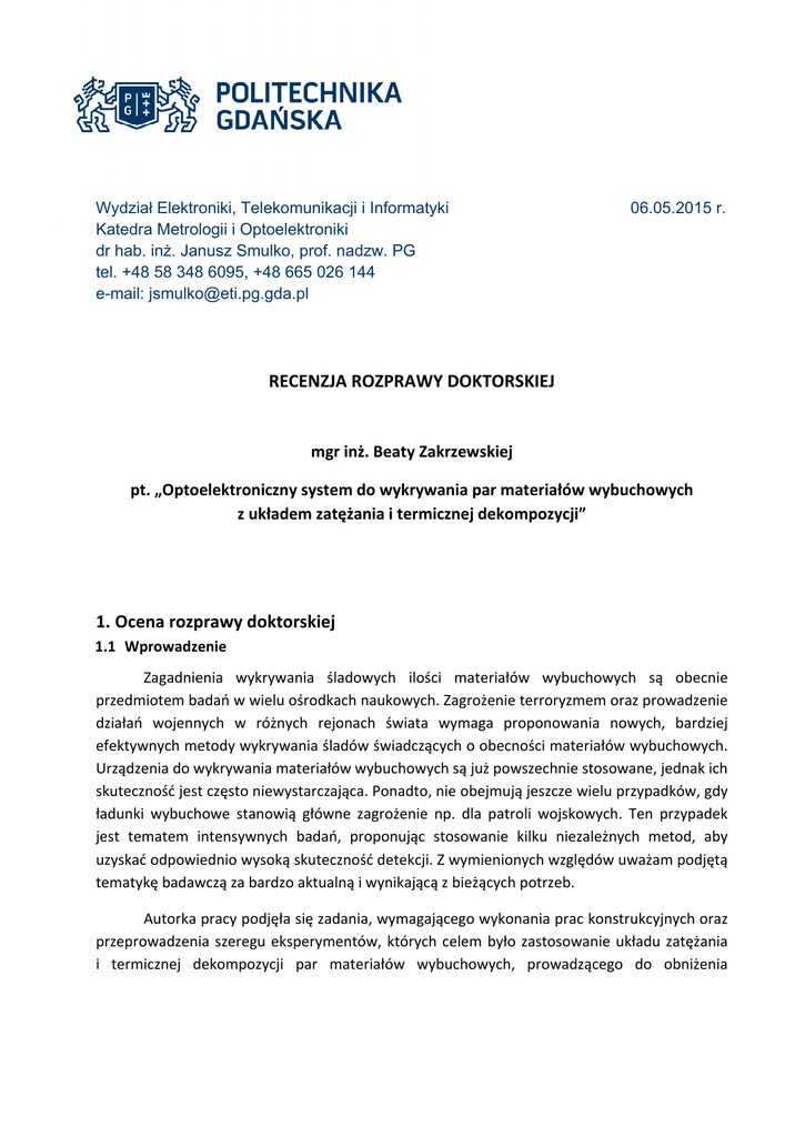 Wydział Elektroniki, Telekomunikacji i Informatyki Katedra Metrologii i Optoelektroniki dr hab. inż. Janusz Smulko, prof. nadzw. PG tel. +48 58 348 6095, +48 665 026 144 e-mail: [email protected] 06.05.2015 r. RECENZJA ROZPRAWY DOKTORSKIEJ mgr inż. Beaty Zakrzewskiej pt. „Optoelektroniczny system do wykrywania par materiałów wybuchowych z układem zatężania i termicznej dekompozycji” 1. Ocena rozprawy doktorskiej 1.1 Wprowadzenie Zagadnienia wykrywania śladowych ilości materiałów wybuchowych są obecnie przedmiotem badań w wielu ośrodkach naukowych. Zagrożenie terroryzmem oraz prowadzenie działań wojennych w różnych rejonach świata wymaga proponowania nowych, bardziej efektywnych metody wykrywania śladów świadczących o obecności materiałów wybuchowych. Urządzenia do wykrywania materiałów wybuchowych są już powszechnie stosowane, jednak ich skuteczność jest często niewystarczająca. Ponadto, nie obejmują jeszcze wielu przypadków, gdy ładunki wybuchowe stanowią główne zagrożenie np. dla patroli wojskowych. Ten przypadek jest tematem intensywnych badań, proponując stosowanie kilku niezależnych metod, aby uzyskać odpowiednio wysoką skuteczność detekcji. Z wymienionych względów uważam podjętą tematykę badawczą za bardzo aktualną i wynikającą z bieżących potrzeb. Autorka pracy podjęła się zadania, wymagającego wykonania prac konstrukcyjnych oraz przeprowadzenia szeregu eksperymentów, których celem było zastosowanie układu zatężania i termicznej dekompozycji par materiałów wybuchowych, prowadzącego do obniżenia minimalnego stężenia wykrywanych tych par przez dostępny system optoelektroniczny. Doktorantka sformułowała w rozprawie tezę, że „możliwe jest zmniejszenie granicy wykrywalności optoelektronicznego systemu służącego do wykrywania par materiałów wybuchowych poprzez zastosowanie układu zatężania i termicznej dekompozycji”. Tak sformułowany cel pracy oraz postawiona teza wymagała przeprowadzenia szeregu badań w kolejnych, wyróżnionych etapach. Mgr inż. Beata Zakrzewska przedstawiła w rozprawie przegląd metod stosowanych do detekcji materiałów wybuchowych, zwracając uwagę na konieczność zwiększenia czułości tych metod oraz podkreślając, że dla wielu stosowanych metod nie jest możliwy dalszy wzrost ich czułości przez zmianę parametrów stosowanego czujnika. Doktorantka zwróciła uwagę, że w systemach optoelektronicznych (pracujących z zastosowaniem metody spektroskopii strat we wnęce optycznej) można obniżyć próg detekcji par materiałów wybuchowych przez zastosowanie układów zatężania i termicznej dekompozycji tych par. Przygotowanie propozycji sposobu zwiększenia czułości wykrywania par materiałów wybuchowych przez opracowanie koncepcji i następnie wykonanie układu zatężania wymagało opanowania przez mgr inż. Beatę Zakrzewską szerokiej wiedzy z zakresu właściwości i budowy materiałów – adsorbentów – stosowanych w procesie zwiększania stężenia par materiałów wybuchowych. Zdobyta wiedza pozwoliła na wybór odpowiednich materiałów oraz termicznego sposobu zmiany ich właściwości – uwalniania adsorbowanych par w wyniku wzrostu temperatury adsorbenta według zadanego profilu czasowego jej zmian. 1.2 Ocena ogólna Opiniowana rozprawa dotyczy istotnych ze względów praktycznych zagadnień wykrywania materiałów wybuchowych. Tego typu badania, ze względu na ograniczony prawem obrót materiałami wybuchowymi, są zawsze utrudnione. Dodatkowo, stężenia wykrywanych par są bardzo małe, co powoduje pojawienie się szeregu nowych problemów metrologicznych. Doktorantka systematycznie starała się je rozwiązywać analizują układ zwiększający możliwosci detekcji takich par przez ich zagęszczanie. Następnie przeprowadziła szereg szczegółowych badań eksperymentalnych, które potwierdziły słuszność prowadzonych analiz i skuteczność opracowanych układów, zwiększających stężenie wykrywanych par NO2. Rozprawa doktorska zawiera 85 stron tekstu. Literatura obejmuje 99 pozycji związanych z tematyką rozprawy, w tym 19 pozycji gdzie Doktorantka jest współautorem. Rozprawa jest podzielona na osiem rozdziałów, w tym wnioski końcowe, ułożonych w sposób merytorycznie poprawny. Pracę rozpoczyna wstęp przybliżający tematykę rozprawy i przedstawiający wybrane i istotne z punktu widzenia detekcji parametry popularnych materiałów wybuchowych. Autorka 2 zwróciła uwagę, że cechą charakterystyczną tych materiałów jest istnienie grup nitrowych, co powoduje występowanie w parach materiałów wybuchowych tlenków azotu (NO, NO2, N2O). Z tych względów skupiła się na ocenie możliwości wykrywania wymienionych gazów. Autorka analizę problematyki wykrywania śladowych ilości materiałów wybuchowych rozpoczyna od przeglądu w drugim rozdziale aktualnie stosowanych różnych metod detekcji, analizując ich właściwości, takie jak próg detekcji czy powtarzalność uzyskiwanych wyników. Następnie opisała materiały stosowane jako adsorbenty oraz podała ich podział ze względu na rodzaje występujących porów (ich wielkość). W kolejnej części rozdziału przedstawiła przykładowe rozwiązania układów zatężania. Zwróciła uwagę na znaczenie wyboru materiału adsorbenta, decydującego o skuteczności procesu zatężania oraz przedstawiła rozwiązania układu grzejnego, stosowanego podczas procesu uwalniania adsorbowanych gazów w wyniku dostarczanej energii cieplnej. Trzeci rozdział rozprawy został przeznaczony na przedstawienie celu i podanie stawianej tezy. Zaproponowana teza wynikła z prezentowanej wcześniej analizy układów detekcji par materiałów wybuchowych oraz właściwości adsorbentów w układach zatężania. Doktorantka w następnych rozdziałach dążyła konsekwentnie do jej udowodnienia. W czwartym rozdziale rozprawy opisano w sposób szczegółowy właściwości ma