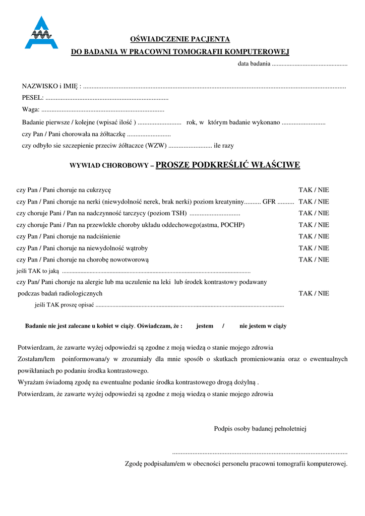 OŚWIADCZENIE PACJENTA DO BADANIA W PRACOWNI TOMOGRAFII KOMPUTEROWEJ data badania ............................................... NAZWISKO i IMIĘ : ............................................................................................................................................................ PESEL: ......................................................................... Waga: ......................................................................... Badanie pierwsze / kolejne (wpisać ilość ) .......................... rok, w którym badanie wykonano .......................... czy Pan / Pani chorowała na żółtaczkę .......................... czy odbyło sie szczepienie przeciw żółtaczce (WZW) .......................... ile razy WYWIAD CHOROBOWY – PROSZĘ PODKREŚLIĆ WŁAŚCIWE czy Pan / Pani choruje na cukrzycę TAK / NIE czy Pan / Pani choruje na nerki (niewydolność nerek, brak nerki) poziom kreatyniny.......... GFR .......... TAK / NIE czy choruje Pani / Pan na nadczynność tarczycy (poziom TSH) .............................. TAK / NIE czy choruje Pani / Pan na przewlekłe choroby układu oddechowego(astma, POCHP) TAK / NIE czy Pan / Pani choruje na nadciśnienie TAK / NIE czy Pan / Pani choruje na niewydolność wątroby TAK / NIE czy Pan / Pani choruje na chorobę nowotworową TAK / NIE jeśli TAK to jaką ........................................................................................................................... czy Pan/ Pani choruje na alergie lub ma uczulenie na leki lub środek kontrastowy podawany podczas badań radiologicznych TAK / NIE jeśli TAK proszę opisać ........................................................................................................................... Badanie nie jest zalecane u kobiet w ciąży. Oświadczam, że : jestem / nie jestem w ciąży Potwierdzam, że zawarte wyżej odpowiedzi są zgodne z moją wiedzą o stanie mojego zdrowia Zostałam/łem poinformowana/y w zrozumiały dla mnie sposób o skutkach promieniowania oraz o ewentualnych powikłaniach po podaniu środka kontrastowego. Wyrażam świadomą zgodę na ewentualne podanie środka kontrastowego drogą dożylną . Potwierdzam, że zawarte wyżej odpowiedzi są zgodne z moją wiedzą o stanie mojego zdrowia Podpis osoby badanej pełnoletniej ........................................................................................................ Zgodę podpisałam/em w obecności personelu pracowni tomografii komputerowej. PRZYGOTOWANIE DO BADANIA W dniu badania proszę zgłosić się na badanie tomografu komputerowego z następującymi dokumentami: 1. oświadczenie Pacjenta do badania w pracowni tomografii komputerowej 2. dowód osobisty, 3. obowiązkowo zabrać wszystkie wcześniejsze wyniki (przede wszystkim zdjęcia RTG + opisy, ksero kart informacyjnych pobytów szpitalnych). W przypadku braku zdjęć RTG struktur kostnych należy je wykonać przed badaniem!!! 4. w przypadku badania z podaniem kontrastu, zaleca się wypicie ok. 1 litra wody niegazowanej wieczorem przed badaniem oraz około 2,5 litra wody niegazowanej w ciągu następnych 24 godzin. 5. proszę posiadać aktualny wynik GFR lub poziom KREATYNINY Do badania na czczo: TAK NIE ODBIÓR WYNIKU W REJESTRACJI GŁÓWNEJ: - OSOBIŚCIE Z DOKUMENTEM TOŻSAMOŚCI lub - OSOBA PISEMNIE UPOWAŻNIONA Z WŁASNYM DOKUMENTEM TOŻSAMOŚCI WAŻNE Pacjenci chorujący na cukrzycę, przyjmujący mieszanki insulinowe w dniu badania powinni przejść na insulinę krótkodziałającą (Actrapid, NovoRapid). Pacjenci na lekach doustnych przyjmują leki hipoglikemizujące po badaniu. W przypadku pacjentów przyjmujących Metforminę (Metformax, Siofor, Glukophage, Metfogamma, Metforatio, Metformin, Metifor, Gluformin) koniecznie 2 doby przed badaniem muszą odstawić lek. Pacjenci chorujący na nadczynność tarczycy powinni dostarczyć aktualny wynik badania TSH. Pacjenci z niewydolnością nerek oraz po nefrektomii (z jedną nerką) powinni koniecznie dostarczyć wynik GFR i poziom kreatyniny. W TRAKCIE BADANIA Badanie Tomografii komputerowej jest bezbolesne, chociaż może wywołać uczucie lekkiego dyskomfortu w związku z koniecznością pozostania przez kilka minut w jednej pozycji. Jest to badanie krótkotrwałe, w zależności od badanego narządu i tego czy podawany jest środek kontrastowy, trwa ono od 5 do 20 minut. W trakcie badania pacjent leży na stole, który przesuwa się wewnątrz szerokiego pierścienia aparatu, zawierającego lampę emitującą promienie i czujniki, które te promienie odbierają. Dane otrzymane w ten sposób przekazywane są do komputera, który przedstawia je w postaci obrazu narządów człowieka. Podanie często stosowanych w Tomografii Komputerowej jodowych środków kontrastowych może niekiedy wywołać zawroty głowy, swędzenie, uczucie gorąca, metaliczny smak w ustach czy też kołatanie serca. W rzadkich przypadkach po badaniu z podaniem środka kontrastowego mogą pojawić się nudności, wysypka, swędzenie. Objawy te zaleca się jak najszybciej zgłosić lekarzowi!!! W DNIU BADANIA PROSZĘ ZGŁOSIĆ SIĘ BEZPOŚREDNIO DO PRACOWNI !
