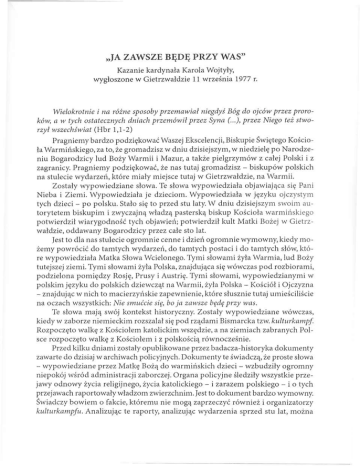 „JA ZAWSZE BĘDĘ PRZY WAS” Kazanie kardynała Karola Wojtyły, wygłoszone w Gietrzwałdzie 11 września 1977 r. Wielokrotnie i na różne sposoby przemawiał niegdyś Bóg do ojców przez proro ków, a w tych ostatecznych dniach przemówił przez Syna (…), przez Niego też stwo rzył wszechświat (Hbr 1,1-2) Pragniemy bardzo podziękować Waszej Ekscelencji, Biskupie Świętego Kościo ła Warmińskiego, za to, że gromadzisz w dniu dzisiejszym, w niedzielę po Narodze niu Bogarodzicy lud Boży Warmii i Mazur, a także pielgrzymów z całej Polski i z zagranicy. Pragniemy podziękować, że nas tutaj gromadzisz – biskupów polskich na stulecie wydarzeń, które miały miejsce tutaj w Gietrzwałdzie, na Warmii. Zostały wypowiedziane słowa. Te słowa wypowiedziała objawiająca się Pani Nieba i Ziemi. Wypowiedziała je dzieciom. Wypowiedziała w języku ojczystym tych dzieci – po polsku. Stało się to przed stu laty. W dniu dzisiejszym swoim au torytetem biskupim i zwyczajną władzą pasterską biskup Kościoła warmińskiego potwierdził wiarygodność tych objawień; potwierdził kult Matki Bożej w Gietrz wałdzie, oddawany Bogarodzicy przez całe sto lat. Jest to dla nas stulecie ogromnie cenne i dzień ogromnie wymowny, kiedy mo żemy powrócić do tamtych wydarzeń, do tamtych postaci i do tamtych słów, któ re wypowiedziała Matka Słowa Wcielonego. Tymi słowami żyła Warmia, lud Boży tutejszej ziemi. Tymi słowami żyła Polska, znajdująca się wówczas pod rozbiorami, podzielona pomiędzy Rosję, Prusy i Austrię. Tymi słowami, wypowiedzianymi w polskim języku do polskich dziewcząt na Warmii, żyła Polska – Kościół i Ojczyzna – znajdując w nich to macierzyńskie zapewnienie, które słusznie tutaj umieściliście na oczach wszystkich: Nie smućcie się, bo ja zawsze będę przy was. Te słowa mają swój kontekst historyczny. Zostały wypowiedziane wówczas, kiedy w zaborze niemieckim rozszalał się pod rządami Bismarcka tzw. kulturkampf. Rozpoczęto walkę z Kościołem katolickim wszędzie, a na ziemiach zabranych Pol sce rozpoczęto walkę z Kościołem i z polskością równocześnie. Przed kilku dniami zostały opublikowane przez badacza-historyka dokumenty zawarte do dzisiaj w archiwach policyjnych. Dokumenty te świadczą, że proste słowa – wypowiedziane przez Matkę Bożą do warmińskich dzieci – wzbudziły ogromny niepokój wśród administracji zaborczej. Organa policyjne śledziły wszystkie prze jawy odnowy życia religijnego, życia katolickiego – i zarazem polskiego – i o tych przejawach raportowały władzom zwierzchnim. Jest to dokument bardzo wymowny. Świadczy bowiem o fakcie, któremu nie mogą zaprzeczyć również i organizatorzy kulturkampfu. Analizując te raporty, analizując wydarzenia sprzed stu lat, można 162 ANEKS 2 powiedzieć, że Maryja na tym miejscu upomniała się o prawa człowieka i prawa narodu. Upomniała się w imieniu swojego Syna Ta, która jest Matką wszystkich ludzi i wszystkich narodów, ale w szczególny sposób są Jej bliscy ci, którzy są uciskani, prześladowani. W szczególny sposób są Jej zawsze bliscy ci, którzy swoje pielgrzymowanie dokonują wśród płaczu, łez i dźwigają krzyż na swoich barkach. I dlatego też całe stulecie lud Warmii, a wraz z nim cały naród polski, zwłaszcza od czasu, kiedy te ziemie znalazły się znowu w obrębie naszego państwa, dziękuje Matce Bożej Gietrzwałdzkiej za Jej proste, macierzyńskie słowa. Za wszystko, co powiedziała. Za to, że powiedziała w ojczystym języku; za to, że podniosła na duchu, że przypomniała różaniec, że dodała nadziei, pomogła przetrwać, że wypomniała te wady, które przeszkadzają nam w utrzymaniu ludzkiej godności i w obronie praw narodu. Dzisiaj, kiedy się tu gromadzimy po stu latach, za to wszystko raz jeszcze chcemy podziękować Matce Bożej – Pani Gietrzwałdzkiej w imieniu nie tylko Warmii i Mazur, Kościoła warmińskiego, ale całego Kościoła na polskiej ziemi; w imieniu wszystkich Polaków i imieniu Kościoła wszystkich ludzi. Bo tutaj, na tym miejscu okazała się Bogarodzica Matką naszą, Matką ludzi, w szczególny sposób Matką Warmii i Matką Ojczyzny naszej. Zostało wypowiedziane słowo. To słowo proste, wypowiedziane ustami Matki, było dalekim echem Słowa, które stało się Ciałem, to Przedwieczne Słowo było jak gdyby u korzenia wszystkich ludzkich słów; natchnęło całą ludzką kulturę. O tym na pewno nie myśleli organizatorzy kulturkampfu. Nie myśleli, że u ko rzenia prawdziwej ludzkiej kultury, która zawsze jest tworzona ludzkim słowem, stanęło Słowo Boże. Stał się człowiekiem Syn Boży. Swoim Apostołom, żegnając się z nimi po zmartwychwstaniu, powiedział: Idźcie na cały świat, nauczajcie wszyst kie narody, tzn. Słowo Boże przyoblekajcie w Ciało, aby weszło do innych języków i kultur, ażeby te ludzkie kultury, te ludzkie języki miały swój pełny wymiar: wymiar Bożej prawdy, wymiar miłości, sprawiedliwości, wolności. Żeby te ludzkie kultury kształtowały człowieka, utworzonego na obraz i podobieństwo Boga; człowieka, który ma swoje sumienie, który żyje prawdą i do niej dąży; który chce kształtować swoje życie i współżycie wedle zasad sprawiedliwości i miłości. Idźcie na cały świat, nauczajcie wszystkie narody. Jak legło to odwieczne Sło wo Boże u podstaw tworzenia tylu języków i kultury tej ziemi, tak legło ono od ty siąca lat u korzenia, stanęło u fundamentów wielkiej budowli dziejowej, którą sta ła się nasza, tysiąc lat temu ochrzczona, Ojczyzna – Polska. Kształtowała się kul tura polska w ciągu całego tysiąclecia z tych odwiecznych źródeł: prawdy, wolno ści, miłości. Kształtowała się przez słowo, Słowo Przedwieczne, które stało się Cia łem. Rodziła się także szczególna miłość i cześć dla Tej, która Bogu Przedwieczne mu, Współistotnemu Bogu Ojcu, 