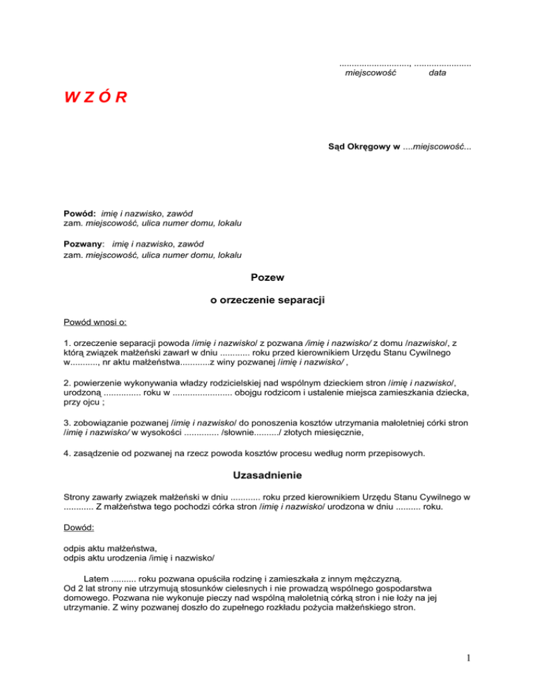 ............................, ....................... miejscowość data WZÓR Sąd Okręgowy w ....miejscowość... Powód: imię i nazwisko, zawód zam. miejscowość, ulica numer domu, lokalu Pozwany: imię i nazwisko, zawód zam. miejscowość, ulica numer domu, lokalu Pozew o orzeczenie separacji Powód wnosi o: 1. orzeczenie separacji powoda /imię i nazwisko/ z pozwana /imię i nazwisko/ z domu /nazwisko/, z którą związek małżeński zawarł w dniu ............ roku przed kierownikiem Urzędu Stanu Cywilnego w..........., nr aktu małżeństwa............z winy pozwanej /imię i nazwisko/ , 2. powierzenie wykonywania władzy rodzicielskiej nad wspólnym dzieckiem stron /imię i nazwisko/, urodzoną ............... roku w ........................ obojgu rodzicom i ustalenie miejsca zamieszkania dziecka, przy ojcu ; 3. zobowiązanie pozwanej /imię i nazwisko/ do ponoszenia kosztów utrzymania małoletniej córki stron /imię i nazwisko/ w wysokości .............. /słownie........../ złotych miesięcznie, 4. zasądzenie od pozwanej na rzecz powoda kosztów procesu według norm przepisowych. Uzasadnienie Strony zawarły związek małżeński w dniu ............ roku przed kierownikiem Urzędu Stanu Cywilnego w ............ Z małżeństwa tego pochodzi córka stron /imię i nazwisko/ urodzona w dniu .......... roku. Dowód: odpis aktu małżeństwa, odpis aktu urodzenia /imię i nazwisko/ Latem .......... roku pozwana opuściła rodzinę i zamieszkała z innym mężczyzną. Od 2 lat strony nie utrzymują stosunków cielesnych i nie prowadzą wspólnego gospodarstwa domowego. Pozwana nie wykonuje pieczy nad wspólną małoletnią córką stron i nie łoży na jej utrzymanie. Z winy pozwanej doszło do zupełnego rozkładu pożycia małżeńskiego stron. 1 Dowód: - przesłuchanie stron Pozwana jest kelnerką, pracuje w klubie nocnym i zarabia miesięcznie ............. złotych. Powód jest tokarzem, pracuje w .............. i zarabia ........... złotych miesięcznie. Obecnie pozwana nie alimentuje córki. Małoletnia /imię i nazwisko/ mieszka z powodem, który w całości ponosi koszty jej utrzymania i wykonuje pieczę nad osobą dziecka. Ponieważ doszło do zerwania więzi uczuciowej, fizycznej i gospodarczej między stronami, które jednak nie zamierzają zawrzeć nowych związków, powód wnosi o orzeczenie separacji. podpis powoda Załącznik: 1. 2. 3. 4. odpis aktu małżeństwa, odpis aktu urodzenia /imię i nazwisko/, zaświadczenie o zarobkach powoda, odpis pozwu i załączników 1-3 2 Dodatkowe informacje 1. Jeżeli między małżonkami nastąpił zupełny rozkład pożycia, każdy z małżonków może żądać, ażeby sąd orzekł separację. Orzekając separację, sąd orzeka także, czy i który z małżonków ponosi winę rozkładu pożycia. Orzekając separację na zgodne żądanie małżonków, sąd nie orzeka o winie rozkładu pożycia. W tym wypadku następują skutki takie, jak gdyby żaden z małżonków nie ponosił winy. Z żądaniem separacji może wystąpić także małżonek, który jest wyłącznie winny rozkładu pożycia. 2. Jeżeli jeden z małżonków żąda orzeczenia separacji, a drugi orzeczenia rozwodu i żądanie to jest uzasadnione, sąd orzeka rozwód. 3. Mimo zupełnego rozkładu pożycia małżeńskiego orzeczenie separacji nie jest dopuszczalne, jeżeli wskutek niej miałoby ucierpieć dobro wspólnych małoletnich dzieci małżonków, albo jeżeli z innych względów orzeczenie separacji byłoby sprzeczne z zasadami współżycia społecznego. 4. Jeżeli małżonkowie nie mają wspólnych małoletnich dzieci, sąd może orzec separację na podstawie zgodnego żądania małżonków. 5. Orzeczenie separacji ma skutki takie jak rozwiązanie małżeństwa przez rozwód z następującymi wyjątkami : • małżonek pozostający w separacji nie może zawrzeć małżeństwa, • jeżeli wymagają tego względy słuszności, małżonkowie pozostający w separacji obowiązani są do wzajemnej pomocy, • małżonek pozostający w separacji, który wskutek zawarcia małżeństwa zmienił swoje dotychczasowe nazwisko, nie może powrócić do tego nazwiska. 6. Orzeczenie separacji powoduje między małżonkami rozdzielność majątkową. 7. Na zgodne żądanie małżonków sąd orzeka o zniesieniu separacji. 8. Właściwym do rozpoznania sprawy o orzeczenie separacji jest sąd okręgowy, w którego okręgu małżonkowie mieli ostatnie wspólne zamieszkanie, jeżeli choć jedno z nich w okręgu tym jeszcze przebywa. W braku takiej podstawy właściwym jest sąd miejsca zamieszkania strony pozwanej, a gdy i tej podstawy nie ma sąd miejsca zamieszkania powoda. 9. Wpis wynosi 500 złotych i jest stały. 3