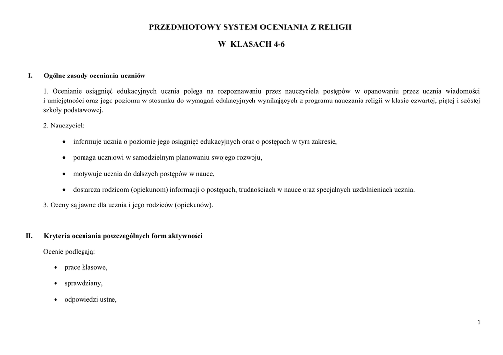 PRZEDMIOTOWY SYSTEM OCENIANIA Z RELIGII W KLASACH 4-6 I. Ogólne zasady oceniania uczniów 1. Ocenianie osiągnięć edukacyjnych ucznia polega na rozpoznawaniu przez nauczyciela postępów w opanowaniu przez ucznia wiadomości i umiejętności oraz jego poziomu w stosunku do wymagań edukacyjnych wynikających z programu nauczania religii w klasie czwartej, piątej i szóstej szkoły podstawowej. 2. Nauczyciel: informuje ucznia o poziomie jego osiągnięć edukacyjnych oraz o postępach w tym zakresie, pomaga uczniowi w samodzielnym planowaniu swojego rozwoju, motywuje ucznia do dalszych postępów w nauce, dostarcza rodzicom (opiekunom) informacji o postępach, trudnościach w nauce oraz specjalnych uzdolnieniach ucznia. 3. Oceny są jawne dla ucznia i jego rodziców (opiekunów). II. Kryteria oceniania poszczególnych form aktywności Ocenie podlegają: prace klasowe, sprawdziany, odpowiedzi ustne, 1 aktywność i praca ucznia na lekcji, ćwiczenia praktyczne, prace domowe, prace dodatkowe, szczególne osiągnięcia, znajomość podstawowych prawd wiary, modlitw i formuł oraz umiejętność ich zastosowania, postawy wskazujące na potrzebę wartościowania. 1. Prace klasowe przeprowadza się w formie pisemnej, a ich celem jest sprawdzenie wiadomości i umiejętności ucznia z zakresu kilku lub kilkunastu jednostek tematycznych (najczęściej jednego działu). Uczeń jest informowany o planowanej pracy klasowej i jej zakresie programowym z co najmniej tygodniowym wyprzedzeniem. Każdą pracę klasową poprzedza lekcja powtórzeniowa, podczas której nauczyciel zwraca uwagę uczniów na najważniejsze zagadnienia. Uczeń jest zobowiązany do zaliczenia wszystkich prac klasowych przewidzianych w danym semestrze. Nauczyciel jest zobowiązany w ciągu 14 dni sprawdzić, poprawić i okazać do wglądu pracę klasową uczniowi na lekcji. Omówione są wszelkie wątpliwości. Sprawdzone prace klasowe są do wglądu dla ucznia i jego rodziców (opiekunów) u nauczyciela. W przypadku „ściągania” w czasie trwania pracy klasowej nauczyciel zabiera pracę, a uczeń otrzymuje ocenę niedostateczną. Uczeń może uzyskać ocenę celującą (6) tylko z niektórych (wyznaczonych przez nauczyciela) prac klasowych, jeśli prawidłowo odpowie na pytania obowiązkowe i dodatkowe. Uczeń może poprawić ocenę z pracy klasowej tylko wtedy, jeśli otrzymał ocenę niższą niż 5-. Z pracy klasowej poprawkowej uczeń może otrzymać maksymalnie ocenę bardzo dobrą (5). Uczeń może przystąpić do poprawy tylko jeden raz i w terminie nie przekraczającym 2 tygodni od otrzymania sprawdzonej pracy. Formę pracy klasowej poprawkowej wybiera nauczyciel. 2 Uczeń nieobecny na pracy klasowej lub w danym dniu zwolniony przez nauczyciela z jej napisania musi zaliczyć materiał w formie wyznaczonej przez nauczyciela (pisemnej lub ustnej) w ciągu tygodnia od terminu pracy klasowej. W przypadku nie przystąpienia przez ucznia do zaliczenia pracy klasowej, nauczyciel ma prawo w trybie dowolnym, jednak wyłącznie w toku zajęć lekcyjnych, sprawdzić i ocenić stopień opanowania materiału przez ucznia. 2. Sprawdziany przeprowadza się w formie pisemnej, a ich celem jest sprawdzenie wiadomości i umiejętności ucznia z zakresu programowego 1-3 ostatnich lekcji. Nauczyciel nie ma obowiązku uprzedzania uczniów o terminie i zakresie programowym sprawdzianu. Sprawdzian jest tak skonstruowany, aby uczeń mógł wykonać wszystkie polecenia w czasie nie dłuższym niż 15 minut. Nauczyciel jest zobowiązany w ciągu 14 dni sprawdzić, poprawić i oddać uczniowi sprawdzian. Uczeń nie może poprawić oceny ze sprawdzianu. 3. Odpowiedź ustna obejmuje zakres tematyczny trzech ostatnich lekcji. Oceniając odpowiedź ustną, nauczyciel bierze pod uwagę: zgodność wypowiedzi z postawionym pytaniem, poprawne posługiwanie się pojęciami, wartość merytoryczną wypowiedzi, sposób formułowania wypowiedzi, wyrażanie sądów, argumentację. Uczeń nie może poprawić oceny z odpowiedzi ustnej. 3 4. Aktywność i praca ucznia na lekcji są oceniane, zależnie od ich charakteru, za pomocą oceny, plusów i minusów. Uczeń może otrzymać ocenę pozytywną za samodzielne wykonanie krótkiej pracy na lekcji, krótką poprawną odpowiedź ustną. Plus uczeń może uzyskać m.in. za samodzielne wykonanie krótkiej pracy na lekcji, krótką poprawną odpowiedź ustną, aktywną pracę w grupie, pomoc koleżeńską na lekcji przy rozwiązaniu problemu, przygotowanie do lekcji. Minus uczeń może uzyskać m.in. za brak przygotowania do lekcji (np. brak zeszytu przedmiotowego, brak podręcznika, brak potrzebnych materiałów i przyrządów), brak zaangażowania na lekcji. Za cztery minusy uczeń otrzymuje ocenę niedostateczną (1), a za cztery plusy ocenę bardzo dobrą (5). Uczeń nie może poprawić oceny za aktywność i pracę na lekcji. 5. Ćwiczenia praktyczne obejmują zadania praktyczne, które uczeń wykonuje podczas lekcji. Oceniając je nauczyciel bierze pod uwagę: wartość merytoryczną, dokładność wykonania polecenia, staranność i estetykę, w wypadku pracy w grupie stopień zaangażowania w wykonanie ćwiczenia. Uczeń nie może poprawić oceny z ćwiczenia praktycznego. Przynajmniej jeden raz w semestrze przeprowadzana jest kompleksowa ocena zeszytu przedmiotowego. 6. Praca domowa jest pisemną lub ustną formą ćwiczenia umiejętności i utrwalania wiadomości zdobytych przez ucznia podczas lekcji. Pisemną pracę domową uczeń wykonuje w zeszycie przedmiotowym lub w formie zleconej przez nauczyciela. 4 Przy wystawianiu oceny za pracę domową nauczyciel bierze pod uwagę samodzielność, poprawność i estetykę wykonania. Brak pracy domowej odnotowywany jest w postaci minusa. Uczeń jest zobowiązany do odrobienia zaległej pracy domowej na najbliższą lekcję. Za zaniechanie tego obowiązku otrzymuje kolejny minus. Za cztery minusy uczeń otrzymuje ocenę niedostateczną (1). Uczeń nie może