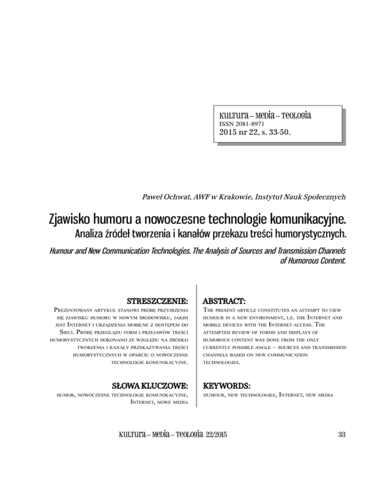 Kultura – Media – Teologia ISSN 2081-8971 2015 nr 22, s. 33-50. Paweł Ochwat, AWF w Krakowie, Instytut Nauk Społecznych Zjawisko humoru a nowoczesne technologie komunikacyjne. Analiza źródeł tworzenia i kanałów przekazu treści humorystycznych. Humour and New Communication Technologies. The Analysis of Sources and Transmission Channels of Humorous Content. STRESZCZENIE: PREZENTOWANY ARTYKUŁ STANOWI PRÓBĘ PRZYJRZENIA SIĘ ZJAWISKU HUMORU W NOWYM ŚRODOWISKU, JAKIM JEST INTERNET I URZĄDZENIA MOBILNE Z DOSTĘPEM DO SIECI. PRÓBĘ PRZEGLĄDU FORM I PRZEJAWÓW TREŚCI HUMORYSTYCZNYCH DOKONANO ZE WZGLĘDU NA ŹRÓDŁO TWORZENIA I KANAŁY PRZEKAZYWANIA TREŚCI HUMORYSTYCZNYCH W OPARCIU O NOWOCZESNE ABSTRACT: THE PRESENT ARTICLE CONSTITUTES AN ATTEMPT TO VIEW HUMOUR IN A NEW ENVIRONMENT, I.E. THE INTERNET AND MOBILE DEVICES WITH THE INTERNET ACCESS. THE ATTEMPTED REVIEW OF FORMS AND DISPLAYS OF HUMOROUS CONTENT WAS DONE FROM THE ONLY CURRENTLY POSSIBLE ANGLE TECHNOLOGIE KOMUNIKACYJNE. TECHNOLOGIES. SŁOWA KLUCZOWE: KEYWORDS: HUMOR, NOWOCZESNE TECHNOLOGIE KOMUNIKACYJNE, – SOURCES AND TRANSMISSION CHANNELS BASED ON NEW COMMUNICATION HUMOUR, NEW TECHNOLOGIES, INTERNET, NEW MEDIA INTERNET, NOWE MEDIA Kultura – Media – Teologia 22/2015 33 PRZESTRZENIE KULTURY H umor był przedmiotem dociekań badaczy od czasów starożytności – już Arystoteles uważał go za cechę wyróżniającą człowieka pośród innych zwierząt dwunożnych1. Obecnie jest to zagadnienie, które interesuje przedstawicieli różnych dyscyplin naukowych: fizjologów, socjologów, psychologów, genetyków, lingwistów, literaturoznawców, kognitywistów czy specjalistów od reklamy2. W ujęciu współczesnej nauki humor rozpatrywany jest najczęściej na dwa sposoby. Pierwszy ujmuje go jako doraźny emocjonalny stan jednostki związany z fizjologicznymi i emocjonalnymi reakcjami na daną sytuację. Humor może dotyczyć konkretnego bodźca (np. w przypadku dowcipów, filmów komediowych), procesu umysłowego odpowiedzialnego za zrozumienie i docenienie jego istoty oraz reakcji rozbawienia przejawiającej się radością i śmiechem3. Drugie ujęcie problemu sytuuje humor jako stałą cechę osobowości, określaną jako poczucie humoru. Jest to konstrukt wielowymiarowy, obejmujący wzorce zachowania (m.in. tendencję do opowiadania dowcipów), zdolności do tworzenia, wyrażania, rozumienia i reagowania na komiczne sytuacje, a także cechy temperamentu, postawy oraz strategie radzenia sobie ze stresem4. To, jak ważne w życiu współczesnego człowieka jest poczucie humoru, ilustruje następujący przykład: na zagranicznych portalach randkowych często można znaleźć anonse o treści: Szukam pana wrażliwego, opiekuńczego, GSOH, lub Chętnie poznam atrakcyjną, ciekawą świata, z dużym sercem i z GSOH (good sense of humor). Poczucie humoru okazuje się tak ważne i oczekiwane u potencjalnego partnera, że powstał skrót (akronim) dla jego określenia5. Według Geoffrey’a Milllera poczucie humoru i zdolność rozbawiania innych dowodzą intelektualnej sprawności i są wskaźnikami kompetencji społecznych, np. towarzyskości czy tendencji do przewodzenia innym – przyczyniają się też do wzrostu popularności danej osoby w grupie. Humor pomaga zwrócić uwagę atrakcyjnego partnera, zdobyć go i zatrzymać przy sobie6. Również Arnie Cann zauważa, że poczucie humoru wzmacnia wzajemną atrakcyjność w początkowych fazach związku dwojga ludzi i zbliża do siebie partnerów. Jest to bezpieczny sposób na dyskretne okazanie zainteresowania drugą osobą. W razie odrzucenia schowanie się za fasadą humoru pozwala też wycofać się z relacji bez utraty twarzy7. 1 2 3 4 5 6 7 34 K. Wieczorek, Poczucie humoru a filozofia, w: S. Gajda, D. Brzozowska (red.), Świat humoru, Opole 2000, s. 13-25. J. Tomczuk-Wasilewska, Przegląd narzędzi do pomiaru poczucia humoru , „Roczniki Psychologiczne” nr 2 (Tom XIII), 2010. R. A. Martin, Sense of humor, in: S.J. Lopez, C.R. Snyder (ed.), Positive psychological assessment. A Handbook of models and measures, Washington 2003, p. 313-326. R. A. Martin, Sense of humor and physical health: Theoretical issues, recent findings, and future directions. ”Humor: International Journal of Humor Research” no. 17 (1/2), 2004, pp. 1-19. A. Radomska, Dobry żart męża wart, „Charaktery” nr 4, 2012. G. Miller., The Mating Mind, New York 2001. A. Cann, C. L. Zapata, H. B. Davis, Humor style and relationship satisfaction in dating couples: Perceived versus self-reported humor styles as predictors of satisfaction, ”Humor: International Journal of Kultura – Media – Teologia 22/2015 P. Ochwat, Zjawisko humoru a nowoczesne technologie komunikacyjne... Do komponentów poczucia humoru zaliczyć można wiele elementów, m.in. zdolność rozumienia treści komicznych, poznawczą ocenę zabawności bodźca komicznego, afektywną reakcję na bodziec (uśmiech, śmiech, śmiech serdeczny), aktywność w poszukiwaniu źródeł komizmu, pamięć zabawnych historii i sytuacji, zdolność wykorzystywania humoru do celów społecznych, postawę wobec komizmu, preferencje określonych typów humoru i inne. Przedstawiona lista nie wyczerpuje wszystkich komponentów poczucia humoru; ilustruje ona jednak, jak skomplikowana i wielowymiarowa jest kwestia komizmu w relacjach społecznych, a co za tym idzie, jak różnie może się ona przejawiać u poszczególnych osób. Innymi słowy, ludzie różnią się poczuciem humoru między sobą w sposób znaczny, czasami subtelny, a często nie różnią się w ogóle. Pomimo występowania treści humorystycznych pod różnymi postaciami w różnych przestrzeniach medialnych (zarówno analogowych, jak i cyfrowych), możliwe wydaje się sklasyfikowanie ich ze względu na konkretną kategorię. Humor występuje w różnych formach, posiada różne funkcje i w różnych celach jest on stosowany (cele społeczne, polityczne, komercyjne i inne