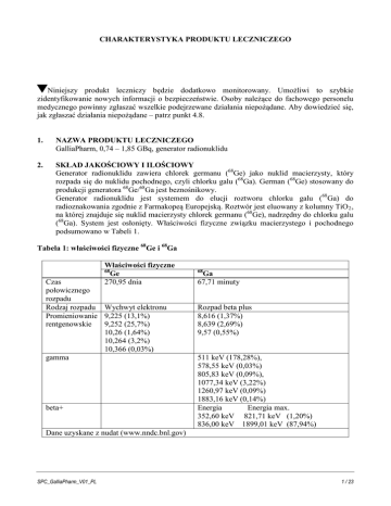 CHARAKTERYSTYKA PRODUKTU LECZNICZEGO Niniejszy produkt leczniczy będzie dodatkowo monitorowany. Umożliwi to szybkie zidentyfikowanie nowych informacji o bezpieczeństwie. Osoby należące do fachowego personelu medycznego powinny zgłaszać wszelkie podejrzewane działania niepożądane. Aby dowiedzieć się, jak zgłaszać działania niepożądane – patrz punkt 4.8. 1. NAZWA PRODUKTU LECZNICZEGO GalliaPharm, 0,74 – 1,85 GBq, generator radionuklidu 2. SKŁAD JAKOŚCIOWY I ILOŚCIOWY Generator radionuklidu zawiera chlorek germanu (68Ge) jako nuklid macierzysty, który rozpada się do nuklidu pochodnego, czyli chlorku galu (68Ga). German (68Ge) stosowany do produkcji generatora 68Ge/68Ga jest beznośnikowy. Generator radionuklidu jest systemem do elucji roztworu chlorku galu (68Ga) do radioznakowania zgodnie z Farmakopeą Europejską. Roztwór jest eluowany z kolumny TiO 2 , na której znajduje się nuklid macierzysty chlorek germanu (68Ge), nadrzędny do chlorku galu (68Ga). System jest osłonięty. Właściwości fizyczne związku macierzystego i pochodnego podsumowano w Tabeli 1. Tabela 1: właściwości fizyczne 68Ge i 68Ga Właściwości fizyczne 68 Ge 270,95 dnia Czas połowicznego rozpadu Rodzaj rozpadu Wychwyt elektronu Promieniowanie 9,225 (13,1%) rentgenowskie 9,252 (25,7%) 10,26 (1,64%) 10,264 (3,2%) 10,366 (0,03%) gamma beta+ 68 Ga 67,71 minuty Rozpad beta plus 8,616 (1,37%) 8,639 (2,69%) 9,57 (0,55%) 511 keV (178,28%), 578,55 keV (0,03%) 805,83 keV (0,09%), 1077,34 keV (3,22%) 1260,97 keV (0,09%) 1883,16 keV (0,14%) Energia Energia max. 352,60 keV 821,71 keV (1,20%) 836,00 keV 1899,01 keV (87,94%) Dane uzyskane z nudat (www.nndc.bnl.gov) SPC_GalliaPharm_V01_PL 1 / 23 Ilość roztworu chlorku galu (68Ga) przeznaczonego do radioznakowania zgodnie z Farmakopeą Europejską, który można eluować z generatora, zależy od ilości znajdującego się w nim chlorku germanu (68Ge), objętości zastosowanego eluentu (zwykle 5 ml) i czasu, jaki upłynął od poprzedniej elucji. Jeśli nuklid macierzysty i pochodny znajdują się w równowadze, można eluować ponad 60% z dostępnego chlorku galu (68Ga). Tabela 2 podsumowuje aktywność w generatorze i uzyskaną w wyniku elucji na początku okresu ważności i na koniec okresu ważności. Tabela 2: aktywność w generatorze i uzyskana w wyniku elucji Aktywność wewnątrz generatora na początku okresu ważności 0,74 GBq 0,74 GBq ± 10% 1,11 GBq 1,11 GBq ± 10% 1,48 GBq 1,48 GBq ± 10% 1,85 GBq 1,85 GBq ± 10% NLT = not less than – nie mniej niż * w równowadze Moc Aktywność wewnątrz generatora na koniec okresu ważności 0,3 GBq ± 10% 0,4 GBq ± 10% 0,6 GBq ± 10% 0,7 GBq ± 10% Eluowana aktywność na początku okresu ważności NLT 0,45 GBq NLT 0,67 GBq NLT 0,89 GBq NLT 1,11 GBq Eluowana aktywność na koniec okresu ważności* NLT 0,18 GBq NLT 0,24 GBq NLT 0,36 GBq NLT 0,42 GBq Bardziej szczegółowe wytłumaczenia i przykłady eluowanych aktywności w różnych punktach czasowych podano w punkcie 12. Pełny wykaz substancji pomocniczych, patrz punkt 6.1. 3. POSTAĆ FARMACEUTYCZNA Generator radionuklidu Generator to obudowa ze stali nierdzewnej z dwoma uchwytami oraz z portem wlotowym i wylotowym. Roztwór do elucji jest podłączony do otworu wlotowego, natomiast eluat można zebrać z portu wylotowego lub umieścić bezpośrednio w urządzeniu do syntezy. 4. SZCZEGÓŁOWE DANE KLINICZNE 4.1. Wskazania do stosowania Produkt leczniczy nie jest przeznaczony do bezpośredniego stosowania u pacjentów. Eluat (roztwór chlorku galu (68Ga)) jest stosowany do radioznakowania in vitro określonych cząsteczek nośnikowych, które zostały specjalnie opracowane i zatwierdzone do radioznakowania tym radionuklidem w celu zastosowania do diagnostyki obrazowej, z użyciem pozytonowej tomografii emisyjnej (PET). 4.2. Dawkowanie i sposób podawania Produkt leczniczy jest przeznaczony do stosowania wyłącznie w wyznaczonych ośrodkach medycyny nuklearnej i powinien być przygotowywany wyłącznie przez specjalistę mającego doświadczenie w radioznakowaniu in vitro. SPC_GalliaPharm_V01_PL 2 / 23 Dawkowanie Ilość eluatu (roztwór chlorku galu (68Ga)) potrzebna do radioznakowania i ilość produktu leczniczego znakowanego 68Ga, który następnie podaje się pacjentowi, będzie zależała od radioznakowanego produktu leczniczego oraz jego przewidzianego zastosowania. Należy zapoznać się z treścią Charakterystyki Produktu Leczniczego i Ulotki dla pacjenta określonego produktu leczniczego, który będzie podlegał radioznakowaniu. Dzieci i młodzież W celu uzyskania bardziej szczegółowych informacji na temat stosowania u dzieci i młodzieży należy zapoznać się z treścią Charakterystyki Produktu Leczniczego i Ulotki dla pacjenta produktu leczniczego, który będzie podlegał radioznakowaniu 68Ga. Sposób podawania Roztwór chlorku galu (68Ga) nie jest przeznaczony do bezpośredniego podawania pacjentom, ale jest stosowany do radioznakowania in vitro różnych cząsteczek nośnikowych. Należy stosować się do drogi podania końcowego produktu leczniczego. Instrukcje dotyczące doraźnego przygotowania produktu leczniczego przed podaniem, patrz punkt 12. 4.3. Przeciwwskazania Roztworu chlorku galu (68Ga) nie należy podawać bezpośrednio pacjentom. Stosowanie produktów leczniczych radioznakowanych 68Ga jest przeciwwskazane w następującym przypadku: - Nadwrażliwość na substancję czynną lub na którąkolwiek substancję pomocniczą wymienioną w punkcie 6.1. W celu uzyskania informacji na temat przeciwwskazań do stosowania określonych produktów leczniczych podlegających radioznakowaniu 68Ga przygotowanych przez radioznakowanie roztworem chlorku galu (68Ga) należy zapoznać się z treścią Charakterystyki Produktu Leczniczego i Ulotki dla pacjenta produktu leczniczego, który będzie podlegał radioznakowaniu. 4.4. Specjalne ostrzeżenia i środki ostrożności dotyczące stosowania Roztwór chlorku galu (68Ga