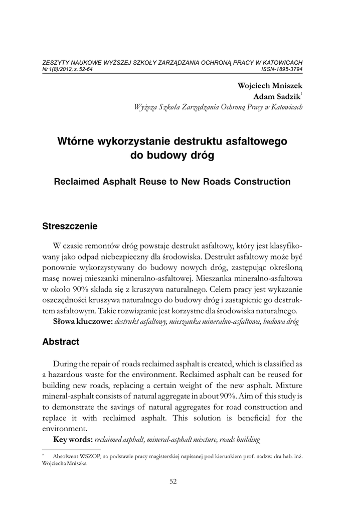 ZESZYTY NAUKOWE WYŻSZEJ SZKOŁY ZARZĄDZANIA OCHRONĄ PRACY W KATOWICACH Nr 1(8)/2012, s. 52-64 ISSN-1895-3794 Wojciech Mniszek Adam Sadzik1 Wyższa Szkoła Zarządzania Ochroną Pracy w Katowicach Wtórne wykorzystanie destruktu asfaltowego do budowy dróg Reclaimed Asphalt Reuse to New Roads Construction Streszczenie W czasie remontów dróg powstaje destrukt asfaltowy, który jest klasyfikowany jako odpad niebezpieczny dla środowiska. Destrukt asfaltowy może być ponownie wykorzystywany do budowy nowych dróg, zastępując określoną masę nowej mieszanki mineralno-asfaltowej. Mieszanka mineralno-asfaltowa w około 90% składa się z kruszywa naturalnego. Celem pracy jest wykazanie oszczędności kruszywa naturalnego do budowy dróg i zastąpienie go destruktem asfaltowym. Takie rozwiązanie jest korzystne dla środowiska naturalnego. Słowa kluczowe: destrukt asfaltowy, mieszanka mineralno-asfaltowa, budowa dróg Abstract During the repair of roads reclaimed asphalt is created, which is classified as a hazardous waste for the environment. Reclaimed asphalt can be reused for building new roads, replacing a certain weight of the new asphalt. Mixture mineral-asphalt consists of natural aggregate in about 90%. Aim of this study is to demonstrate the savings of natural aggregates for road construction and replace it with reclaimed asphalt. This solution is beneficial for the environment. Key words: reclaimed asphalt, mineral-asphalt mixture, roads building * Absolwent WSZOP, na podstawie pracy magisterskiej napisanej pod kierunkiem prof. nadzw. dra hab. inż. Wojciecha Mniszka 52 Wtórne wykorzystanie destruktu asfaltowego do budowy dróg 1. Wprowadzenie Nawierzchnie dróg wykonywane są z mieszanek mineralno-asfaltowych, których produkcja niekorzystnie wpływa na środowisko naturalne. Kluczowy wpływ na degradację środowiska ma pozyskiwanie kruszyw, które stanowią około 90% mieszanki mineralno-asfaltowej, stosowanej do budowy nowych dróg. Następstwem jest budowa i eksploatacja kopalń surowców drogowych, działalność ta powoduje nieodwracalną degradację środowiska naturalnego. Dodatkowym źródłem degradacji środowiska jest emisja spalin z silników samochodów, przewożących kruszywo drogowe do miejsc produkcji mieszanek mineralno-asfaltowych. Remonty dróg o nawierzchni mineralno-asfaltowej wymagają frezowania starej i zniszczonej warstwy wskutek czego powstaje odpad w postaci destruktu asfaltowego. Destrukt poddany recyklingowi może być ponownie wykorzystany do produkcji mieszanek mineralno-asfaltowych, co umożliwia pozbycie się odpadu oraz ogranicza zapotrzebowanie na kruszywa naturalne. Destrukt asfaltowy obejmuje mieszanki mineralno-asfaltowe które są uzyskiwane w wyniku frezowania warstw asfaltowych oraz w wyniku rozkruszenia płyt wyciętych z nawierzchni asfaltowej. Skład destruktu jest prawie taki sam jak skład mieszanki mineralno-asfaltowej w warstwach nawierzchni i składa się z następujących składników [1]: · kruszyw mineralnych w ilości około 88%, · mączki wapiennej w ilości około 7%, · asfaltu w ilości około 5%. Art. 1. ustawy o odpadach [2] określa zasady postępowania z odpadami w sposób zapewniający ochronę życia i zdrowia ludzi oraz ochronę środowiska zgodnie z zasadą zrównoważonego rozwoju, a w szczególności zasady zapobiegania powstawaniu odpadów lub ograniczania ilości odpadów i ich negatywnego oddziaływania na środowisko, a także odzysku lub unieszkodliwiania odpadów. Art. 3. pkt. 14. recykling – rozumie się przez to taki odzysk, który polega na powtórnym przetwarzaniu substancji lub materiałów zawartych w odpadach w procesie produkcyjnym w celu uzyskania substancji lub materiału o przeznaczeniu pierwotnym lub o innym przeznaczeniu, w tym też recykling organiczny, z wyjątkiem odzysku energii. W zależności od składu, destrukt asfaltowy zostaje sklasyfikowany jako odpad w podgrupie 03, pod kodem 17 03 01 - asfalt zawierający smołę lub pod kodem 17 03 02 - asfalt inny niż wymieniony w 17 03 01 tj. niezawierający 53 Wojciech Mniszek, Adam Sadzik smoły [3]. Oczywiście sklasyfikowanie asfaltowego destruktu jako odpadu nie stoi w sprzeczności z jego dalszym wykorzystaniem, destrukt asfaltowy jest pełnowartościowym materiałem, który jest i powinien być używany jako dodatek do nowych mieszanek mineralno-asfaltowych. Rosnące zastosowanie metod recyklingu w produkcji mieszanek mineralnoasfaltowych spowodowało konieczność ustalenia wymagań wobec destruktu asfaltowego, który będzie sprzedawany jako składnik do produkcji tych mieszanek, podobnie jak kruszywa i lepiszcze. Według norm europejskich [4] zastosowanie destruktu asfaltowego jest dopuszczone w określonej ilości i przy dotrzymaniu określonych wymagań. Destrukt asfaltowy może być zastosowany jako materiał budowlany do wytwarzania mieszanek mineralno-asfaltowych na gorąco w otaczarkach zgodnie ze specyfikacjami na te mieszanki. Norma Europejska zawiera wymagania wobec destruktu asfaltowego dotyczące właściwości lepiszcza, kruszywa i zawartości materiałów obcych, będących składnikami destruktu asfaltowego, które obowiązują we wszystkich przypadkach jego zastosowania. Dodatkowo niniejsza Norma Europejska wymienia właściwości destruktu asfaltowego i jego składników, które muszą być określone i udokumentowane, jeśli wymagany jest opis granulatu asfaltowego. Uziarnienie kruszywa, właściwości lepiszcza i zawartość materiałów obcych w destrukcie asfaltowym mają wpływ na jakość wyrobu tj. mieszanki mineralno-asfaltowej z użyciem tego destruktu. Wielkości kawałków destruktu asfaltowego, które mogą występować jako duże bryły lub drobno zmielony materiał, mają znaczenie tylko w trakcie dodawania destruktu do mieszanki mineralno-asfaltowej w procesie mieszania. Ponieważ wymagania dotyczące mieszanek mineralnoasfaltowych z dodatkiem lub bez dodatku destruktu asfaltowego są takie s