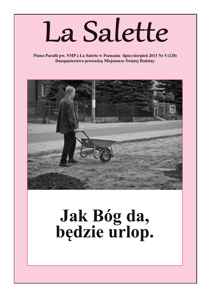 Pismo Parafii pw. NMP z La Salette w Poznaniu lipiec/sierpień 2013 Nr 5 (128) Duszpasterstwo prowadzą Misjonarze Świętej Rodziny Jak Bóg da, będzie urlop. Boże Ciało 2013 Tegoroczna Uroczystość Najświętszego Ciała i Krwi Chrystusa była kolejnym istotnym wydarzeniem w historii naszej parafii. Procesja Eucharystyczna, która odbyła się w tym dniu, po raz pierwszy przeszła bowiem ulicami naszego osiedla: Ścinawską, Braniborską, Dziewińską i Srebrną. Punktualnie o godz. 16:00 w kościele rozpoczęły się uroczyste Nieszpory, które poprowadził ks. Łukasz Rodziejczak msf. Następnie wyruszyliśmy w Procesji i przy akompaniamencie orkiestry i śpiewie p. Marka dotarliśmy do pierwszego ołtarza przy ul. Srebrnej. Kolejne znajdowały się na ul. Dziewińskiej, na rogu ul. Srebrnej i Ścinawskiej oraz przy krzyżu. Wszystkie zostały przygotowane przez parafian. Przy każdym (pięknie przybranym zresztą) ołtarzu wysłuchaliśmy nawiązującego do niego tematyką fragmentu Ewangelii oraz krótkiej nauki. Słowa, które szczególnie mogły zapaść 2 La Salette - lipiec/sierpień 2013 nam w pamięć odnosiły się do tego, że „jesteśmy solą ziemi, ale czasem i solą w oku” oraz że jako chrześcijanie powinniśmy „dzielić się wiarą jak chlebem”. Procesja zakończyła się przy naszym kościele, gdzie później odbyła się jeszcze jedna w tym dniu Msza św. Co ciekawe, Boże Ciało była historycznym wydarzeniem w naszej parafii nie tylko ze względu na procesję ulicami osiedla. Uczestnicząc w tym dniu we Mszy św., po raz pierwszy (od momentu jego święceń kapłańskich) mogliśmy wysłuchać kazania ks. Łukasza. Z pewnością w pamięci zostanie nam aura w jakiej przyszło nam przeżywać tą Uroczystość. Jeszcze kilka minut przed Nieszporami mieliśmy prawdziwe urwanie chmury. Deszcz zelżał nieco do godz. 16:00, ale i tak spotkaliśmy się w kościele gdy na zewnątrz z nieba lały się strugi wody. Procesja ruszała do pierwszego ołtarza w momencie jak deszcz był na tyle mały, że parasole były w stanie chronić nas od wody. Nim doszliśmy do pierwszego ołtarza już nie padało. Taka pogoda utrzymała się aż do końca by znowu lunąć zaraz po zakończeiu procesji. Perfekcyjnie wybrany czas. Turniej ministrantów Za nami kolejna edycja Turnieju im. ks. Jana Berthiera. W rozgrywkach dla ministrantów ze szkól podstawowych najlepsza okazała się drużyna z Parafii pw. Świętego Krzyża w Poznaniu, która pokonała w finale zespół z Parafii pw. św. Antoniego Padewskiego w Przeźmierowie 1:0. Nasza reprezentacja, choć walczyła dzielnie, po raz kolejny okazała się gościnna... …i nie wyszła ze swojej grupy, zajmując w niej 4. miejsce (na 6 możliwych). Trzeba jednak przyznać, że drużyna zmagała się z brakami kadrowymi. W zespole wystąpił też najmłodszy zawodnik turnieju, który dobrze zastąpił jednego z chwilowo kontuzjowanych graczy (na szczęście nie stało się nic poważnego). Mimo braku awansu do fazy pucharowej nie powinniśmy narzekać na brak zaangażowania naszych piłkarzy, gdyż wygrali oni 2 mecze grupowe. Rozgrywki ministrantów ze szkół podstawowych były bardziej wyrównane niż starszych roczników. Żadnej z drużyn nie ominęła gorycz porażki. Blisko sukcesu była drużyna Parafii pw. św. Antoniego, jednak ostatecznie zajęła drugie miejsce. W przypadku obu spotkań półfinałowych o awansie decydowały rzuty karne, które – jak wiadomo – potrafią być grą nerwów. Kapryśna w tym dniu pogoda nie popsuła planów organizatorom i turniej z sukcesem dobiegł końca. Przyznano nagrody dla drużyn, które zajęły miejsca na podium oraz wyróżnienie dla najlepszego strzelca turnieju (został nim zawodnik z parafii św. Antoniego). Zwycięzcy - drużyna z Parafii pw. Świętego Krzyża pojedzie na ogólnopolski turniej, który w lipcu odbędzie się w Kazimierzu Biskupim. W sumie w tegorocznym Turnieju im. ks. Jana Berthiera (edycji poznańskiej) wzięło udział 20 drużyn (11 w kategorii szkoła podstawowa oraz 9 w kategorii szkoła ponadpodstawowa). Jeszcze raz wszystkim uczestnikom i organizatorom serdecznie dziękujemy i zapraszamy za rok. lipiec/sierpień 2013 - La Salette 3 Byliśmy na Lednicy 1 czerwca w Dzień Dziecka sześcioro naszych parafian dołączyło do parafian z parafii św Andrzeja Boboli, aby razem wyruszyć na Lednicę. Tegoroczny temat spotkań młodzieży na polach lednickich brzmiał "W imię Ojca". Na miejscu byliśmy o godzinie 15:00. Zaraz po przybyciu, wraz ze znajomymi z innych parafii prowadzonych przez Misjonarzy Świętej Rodziny odmówiliśmy Koronkę do Bożego Miłosierdzia. Mimo zmiennej i nie najciekawszej pogody towarzyszyły nam przepiękne tańce i śpiewy. Kulminacją spotkania było uczestnictwo w Eucharystii i wzruszającej adoracji Najświętszego Sakramentu. Wysłuchaliśmy także przesłania ojca świętego Franciszka. Wyjątkowo w tym roku swoją osobą na polach lednickich zaszczycił nas prezydent Bronisław Komorowski. Niestety nie przeszliśmy w tym roku przez słynną rybę. Na Junikowie byliśmy około godz. 2:00 w nocy. Pomimo późnej pory na naszych twarzach widniał uśmiech z miło spędzonego czasu. Z niecierpliwością czekamy na następny wyjazd na Lednicę. Uroczysta Msza św. ks. Piotra Szymańskiego Minął zaledwie tydzień od prymicji ks. Łukasza, a mogliśmy uczestniczyć w kolejnej równie radosnej uroczystości. W niedzielę 2. czerwca o godz. 12:00 swoją pierwszą Mszę św. w naszej parafii odprawił ks. Piotr Szymański. Pierwsza Msza św. ks. Piotra w naszym kościele miała podobnie uroczysty charakter, jak prymicje ks. Łukasza. Nie zabrakło procesji z rodzinnego domu neoprezbitera, choć tym razem ze względu na jego miejsce zamieszkania była ona dość krótka. Kazanie „od 4 La Salette - lipiec/sierpień 2013 serca” wygłosił ks. Wojciech Silski. Usłyszeliśmy m.in. kilka słów o nowym miejscu pracy ks
