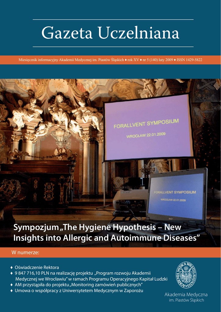 Gazeta Uczelniana Miesięcznik informacyjny Akademii Medycznej im. Piastów Śląskich ♦ rok XV ♦ nr 5 (140) luty 2009 ♦ ISSN 1429-5822 Sympozjum „The Hygiene Hypothesis – New Insights into Allergic and Autoimmune Diseases” W numerze: ♦ Oświadczenie Rektora ♦ 9 847 716,10 PLN na realizację projektu „Program rozwoju Akademii Medycznej we Wrocławiu” w ramach Programu Operacyjnego Kapitał Ludzki ♦ AM przystąpiła do projektu „Monitoring zamówień publicznych” ♦ Umowa o współpracy z Uniwersytetem Medycznym w Zaporożu Akademia Medyczna Gazeta Uczelniana luty 2009 im. Piastów Śląskich 1 Andrzej Boznański Sympozjum „The Hygiene Hypothesis – New Insights into Allergic and Autoimmune Diseases” Niespotykany dotąd w dziejach medycyny wzrost zachorowań na choroby uwarunkowane nadwrażliwością na czynniki środowiskowe jest z pewnością jedną z przyczyn, dla których choroby alergiczne zostały uznane za swoistą epidemię XXI wieku, a gremia decyzyjne Unii Europejskiej przeznaczyły znaczące środki na poznanie rzeczywistej skali i przyczyn tego zjawiska. Koszty leczenia astmy dziecięcej ponoszone przez kraje UE (3 mld euro rocznie) i społeczny rozmiar tego zjawiska (ok. 10% populacji do 18. roku życia) zadecydowały, że w ramach 6. Programu Ramowego znalazły się trzy projekty (GALEN, GABRIEL i FORALLVENT) poświęcone zagadnieniom astmy i alergii, finansowane łączną kwotą ponad 30 milionów euro. W realizacji pierwszego z nich uczestniczy Uniwersytet Jagielloński i Uniwersytet Medyczny w Łodzi, w dwóch pozostałych natomiast – Akademia Medyczna we Wrocławiu. 2 Choroby alergiczne zostały uznane za swoistą epidemię XXI wieku Projekt FORALLVENT (Forum for Allergy Prevention), realizowany w latach 2006–2009, w swoich założeniach stanowi platformę wymiany myśli i doświadczeń, szeroko zakrojonych badań realizowanych w trakcie poprzednich „sztandarowych” międzynarodowych opracowań epidemiologiczno-środowiskowych, takich jak: ALEX, (Allergy and Endotoxin Study), PASTEURE, PARSIFAL czy finansowany ze środków 5. Programu Ramowego projekt Environmental Influences and Infection as Aetiological Agencies in Atopy and Asthma in Young Children, w którym uczestniczył również ośrodek wrocławski. Być może właśnie wyniki uzyskane w trakcie realizacji ostatniego z nich, jak również osiągnięte podczas pierwszych trzech lat realizacji projektu GABRIEL zadecydowały, że konsorcjum naukowe projektu FORALLVENT postanowiło zorganizować konferencję podsumowującą właśnie we Wrocławiu. Gazeta Uczelniana luty 2009 Spotkanie europejskich koordynatorów projektu odbyło się 22 stycznia w Auli Leopoldyna Uniwersytetu Wrocławskiego, a uroczystość jego otwarcia uświetniła Prorektor ds. Rozwoju Uczelni – profesor Halina Milnerowicz, która odczytała adres powitalny JM Rektora. z czynnikami środowiska wiejskiego ogranicza w sposób bardzo wyraźny wystąpienie tych chorób w późniejszym wieku. Wyjaśnieniem tego fenomenu zajął się w kolejnym referacie profesor Harald Renz z Marburga, który zwrócił uwagę, że zwierzęta hodowlane są bogatym siedliskiem bakterii Gram-ujemnych, których błona komórkowa jest źródłem wielu endotoksyn. Badania ostatnich kilku lat pozwoliły na ustalenia wstępnego schematu współzależności decydujących o powstaniu tego zjawiska. Punktem wyjścia była obserwacja nasilonej ekspresji genu dla receptora TLR2 (Toll-like receptor) i cząsteczki CD14 u wiejskich dzieci. Receptory Spotkanie europejskich koordynatorów projektu odbyło się w Auli Leopoldyna Uniwersytetu Wrocławskiego Inauguracyjny wykład wygłosiła współpracująca od kilku lat z ośrodkiem wrocławskim profesor Erika von Mutius z uniwersytetu monachijskiego – znana autorka tzw. „higienicznej teorii” astmy i alergii. Teoria ta sugeruje, że stały kontakt (począwszy od okresu prenatalnego) Gazeta Uczelniana luty 2009 3 TLR2 są odpowiedzialne za kontakt ze składowymi ściany błony komórkowej większości bakterii. Nasilona ekspresja TLR2 na komórkach dendrytycznych prowadzi do aktywacji syntezy IL-12, cytokiny mającej wpływ na promocyjny zwrot komórek T w kierunku Th1, a tym samym ograniczeniu przez komórki Th2 wytwarzania cytokin „proalergicznych”, takich jak: IL-4, IL-5 czy IL-13. W dalszej części spotkania profesor Tari Haahtela z Helsinek przedstawił wyniki niezwykle ciekawych badań epidemiologicznych prowadzonych w Karelii, zwracając uwagę na ogromne różnice w zachorowalności na astmę między grupami etnicznymi rdzennych Finów i Rosjan narażonych na te same czynniki środowiskowe, co dało asumpt do rozpoczęcia dyskusji nad niewątpliwie istotnym wpływem czynników genetycznych. W konferencji brało udział około 80 osób z 14 krajów Wzbogaceniem dysputy nad interakcją „gen – środowisko” były referaty prezentujące wyniki „polskiej” części badań realizowanych w ramach projektu GABRIEL (dr Barbara Sozańska) i badań prowadzonych na Ukrainie przez zespół pod kierunkiem profesor Iriny Dardynskiej z Chicago. Profesor Braun-Fahrlander z Bazylei 4 i profesor Kneifel z Wiednia przedstawili wyniki prac prowadzonych m.in. w: Grecji, Wielkiej Brytanii i Nowej Zelandii, na podstawie których ustalono protekcyjny wpływ niektórych mikrobiologicznych składowych mleka krowiego. Interesującym przyczynkiem do dyskusji nad wpływem szczepień ochronnych w relacji do rozwoju nadwrażliwości atopowej był referat profesora Bufe z Bochum. Krytycznie w odniesieniu do szeroko akceptowalnych poglądów nad działaniem pro- i prebiotyków wypowiedział się profesor Riedler z Salzburga. W dyskusji, jaką wywołały tezy tego referatu szczególnie zaznaczył się głos Dominique Vuitton z Uniwersytetu Franche–Comte, która pozostaje nadal zwolenniczką tezy o skuteczności obu tych symbiotyków. Podkreśleniem wagi wrocławskiego spotkania była niewątpliwie obecn