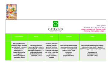 Dieta ogólna od 16.01.2017 DO 20.01.2017 Mogą znajdować się śladowe ilośći Alergeny :Mleko,jajko ,mięso , Poniedziałek Wtorek Pieczywo mieszanerazowe, graham, pszennoPieczywo mieszaneżytnie,1,3bułki pszenne z razowe, graham, pszennomasłem 7, szynka żytnie 1,3,bułki pszenne z wieprzowa 12,3 , masłem 7, polędwica 1,3,6 , twarożek z cebulka miód ,ogórek zielony 7,ogórek herbatka Malinowa herbatka miętowa (napar bez cukru) (napar bez cukru) Środa Czwartek Piątek Pieczywo mieszanerazowe, graham, pszenno-żytnie1,3, płatki kukurydziane z ciepłym mlekiem 7 ,ser żółty 7 ,papryka kolorowa (napar bez cukru) Herbata Pieczywo mieszane-razowe, graham, pszenno-żytnie1,3, twarożek ze szczypiorkiem ,humus z fasoli białej rzodkiewka herbata (napar bez cukru). Pieczywo mieszane-razowe, graham, pszenno-żytnie1,3 masło 7 , pasztet pomidorowy ,pasta z makreli z ogórkiem 3,4 Sałata zielona herbata z cytryna (napar bez cukru). Podwieczorek Obiad Zupa Szpinakowo serowa 7 Zupa z Fasolowa 1 W chrupiącej panierce Sos boloński 3,7 sznycel drobiowy 12 Wieprzowina po cygańsku serwowany z makaronem serwowany z 12,6 serwowana z kaszą 1 ziemniakami z jęczmienną 1 koperkiem oraz Surówka z marchwi surówką z kapusty Kompot z owocem Kompot z owocem modrej sok owocowy 200ml Jabłko /nasiona kompot 200ml słonecznika Zupa Grochowa ½ jabłka /mandarynka Kaszka manna z musem z owoców 7 Zupa Pomidorowa 12 kurczak w sosie 12 potrawkowym serwowany z ryżem na sypko 1 oraz marchwią gotowana Kolorowe kanapki na chlebie razowym z warzywami 1,3 Zupa Domowy rosół z kury 12 Naleśniki z dżemem jagodowym 1,7 Deser jabłko Kompot z owocem Panna c0tta z sosem owocowym 7 W jadłospisie zastrzega się prawo do zmian.
