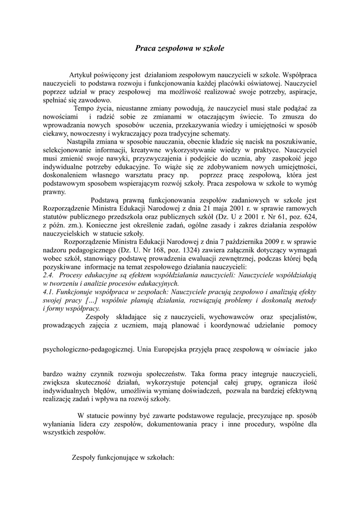 Praca zespołowa w szkole Artykuł poświęcony jest działaniom zespołowym nauczycieli w szkole. Współpraca nauczycieli to podstawa rozwoju i funkcjonowania każdej placówki oświatowej. Nauczyciel poprzez udział w pracy zespołowej ma możliwość realizować swoje potrzeby, aspiracje, spełniać się zawodowo. Tempo życia, nieustanne zmiany powodują, że nauczyciel musi stale podążać za nowościami i radzić sobie ze zmianami w otaczającym świecie. To zmusza do wprowadzania nowych sposobów uczenia, przekazywania wiedzy i umiejętności w sposób ciekawy, nowoczesny i wykraczający poza tradycyjne schematy. Nastąpiła zmiana w sposobie nauczania, obecnie kładzie się nacisk na poszukiwanie, selekcjonowanie informacji, kreatywne wykorzystywanie wiedzy w praktyce. Nauczyciel musi zmienić swoje nawyki, przyzwyczajenia i podejście do ucznia, aby zaspokoić jego indywidualne potrzeby edukacyjne. To wiąże się ze zdobywaniem nowych umiejętności, doskonaleniem własnego warsztatu pracy np. poprzez pracę zespołową, która jest podstawowym sposobem wspierającym rozwój szkoły. Praca zespołowa w szkole to wymóg prawny. Podstawą prawną funkcjonowania zespołów zadaniowych w szkole jest Rozporządzenie Ministra Edukacji Narodowej z dnia 21 maja 2001 r. w sprawie ramowych statutów publicznego przedszkola oraz publicznych szkół (Dz. U z 2001 r. Nr 61, poz. 624, z późn. zm.). Konieczne jest określenie zadań, ogólne zasady i zakres działania zespołów nauczycielskich w statucie szkoły. Rozporządzenie Ministra Edukacji Narodowej z dnia 7 października 2009 r. w sprawie nadzoru pedagogicznego (Dz. U. Nr 168, poz. 1324) zawiera załącznik dotyczący wymagań wobec szkół, stanowiący podstawę prowadzenia ewaluacji zewnętrznej, podczas której będą pozyskiwane informacje na temat zespołowego działania nauczycieli: 2.4. Procesy edukacyjne są efektem współdziałania nauczycieli: Nauczyciele współdziałają w tworzeniu i analizie procesów edukacyjnych. 4.1. Funkcjonuje współpraca w zespołach: Nauczyciele pracują zespołowo i analizują efekty swojej pracy […] wspólnie planują działania, rozwiązują problemy i doskonalą metody i formy współpracy. Zespoły składające się z nauczycieli, wychowawców oraz specjalistów, prowadzących zajęcia z uczniem, mają planować i koordynować udzielanie pomocy psychologiczno‐pedagogicznej. Unia Europejska przyjęła pracę zespołową w oświacie jako bardzo ważny czynnik rozwoju społeczeństw. Taka forma pracy integruje nauczycieli, zwiększa skuteczność działań, wykorzystuje potencjał całej grupy, ogranicza ilość indywidualnych błędów, umożliwia wymianę doświadczeń, pozwala na bardziej efektywną realizację zadań i wpływa na rozwój szkoły. W statucie powinny być zawarte podstawowe regulacje, precyzujące np. sposób wyłaniania lidera czy zespołów, dokumentowania pracy i inne procedury, wspólne dla wszystkich zespołów. Zespoły funkcjonujące w szkołach: • nauczyciele uczący w jednej klasie – tworzą zespół, który ustala zestaw programów nauczania, dobiera metody pracy do potrzeb indywidualnych uczniów, wypracowuje wspólne działania wychowawcze, efektywniejsze formy współpracy z rodzicami. • zespoły wychowawcze – działanie takiego zespołu to ciągłe planowanie pracy wychowawczej, ponieważ stale pojawiają się nowe problemy wychowawcze i trzeba modyfikować zadania na bieżąco. • zespoły przedmiotowe – zajmują się wprowadzaniem nowych metod nauczania, organizowaniem konkursów, realizacją ciekawych projektów, autorskich programów. • zespoły zadaniowe – tworzone są w konkretnym celu, do wykonania jakiegoś zadania. | Rodzajem zespołu zadaniowego jest zespół samokształceniowy, w którym nauczyciele doskonalą swój warsztat pracy, wspierają się w swoich działaniach. Nowym zadaniem dla nauczycieli jest zespołowe wypracowanie indywidualnych form pomocy dla uczniów ze specjalnymi potrzebami edukacyjnymi. Zespół tworzą wszyscy nauczyciele realizujący zadania edukacyjne z uczniami na zajęciach prowadzonych zgodnie z programami nauczania oraz prowadzący zajęcia dodatkowe, a także specjaliści zajmujący się zajęciami korekcyjno‐kompensacyjnymi, logopedycznymi. Nauczyciele obserwują uczniów, ich potrzeby edukacyjne, zainteresowania, uzdolnienia. Wychowawca zgłasza potrzebę objęcia ucznia pomocą i wszyscy, którzy pracują z uczniem spotykają się, analizują sytuację i ustalają formy pomocy. Należy nawiązać współpracę z rodzicami, którzy powinni brać udział w spotkaniach zespołu. Tworząc zespół trzeba określić: • cele, konkretne oczekiwania i priorytety szkoły, • zasoby, rozważyć czy w szkole nie brakuje chętnych do pracy i kompetentnych ludzi, • sposoby pracy zespołu, • sposoby motywowania, • skład grupy, (nie może to być działanie przypadkowe, musi być zaplanowane i związane z posiadanymi kompetencjami), • lidera, który będzie koordynował pracę, dostarczał informacji. Dobra organizacja zespołu polega na ustaleniu zasad współpracy, przydziale zadań, ich realizacji, monitoringu i ewaluacji działań. Organizacja spotkań: • zaplanowanie terminów spotkań, • spotkania mają z góry ustalony i znany uczestnikom program, • na początku każdy z uczestników zdaje relację z przeprowadzonych działań, • określa się czas wypowiedzi członków zespołu, • sprawozdawca zapisuje wnioski i podjęte decyzje, • zespół konsultuje swoje działania z Radą Pedagogiczną. W przypadku powołania nowego zespołu ważne jest ustalenie zasad współpracy, reguł np. wywiązywanie się z zadań w określonym terminie, dbanie o dobrą atmosferę pracy, szanowanie pomysłów innych itp. Należy opracować wspólny cel, tak, aby efektywnie współdziałać. Po zaakceptowaniu celu przez wszystkich członków trzeba zaplanować pracę, ustalić priorytety, plan pracy 