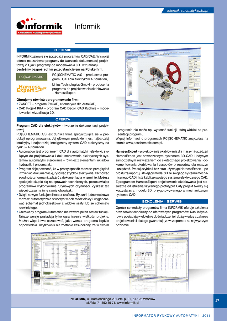 informik.automatykab2b.pl Informik O FIRMIE INFORMIK zajmuje się sprzedażą programów CAD/CAE. W swojej ofercie ma zarówno programy do tworzenia dokumentacji projektowej 2D, jak i programy do modelowania 3D i wizualizacji. Jesteśmy bezpośrednim przedstawicielem na Polskę firm: PC|SCHEMATIC A/S – producenta programu CAD dla elektryków Automation, Linius Technologies GmbH – producenta programu do projektowania okablowania – HarnessExpert. Oferujemy również oprogramowanie firm: ZwSOFT – program ZwCAD, alternatywa dla AutoCAD, CAD Projekt K&A – program CAD Decor, CAD Kuchnie – modelowanie i wizualizacja 3D. OFERTA Program CAD dla elektryków – tworzenie dokumentacji projektowej PC|SCHEMATIC A/S jest duńską firmą specjalizującą się w produkcji oprogramowania. Jej głównym produktem jest najbardziej intuicyjny i najbardziej inteligentny system CAD elektryczny na rynku – Automation. Automation jest programem CAD dla automatyki i elektryki, służącym do projektowania i dokumentowania elektrycznych systemów automatyki i sterowania – również z elementami układów hydrauliki i pneumatyki. Program daje pewność, że w prosty sposób możesz: przeglądać i zmieniać dokumentację, rysować szybko i efektywnie, zachować zgodność z normami, zdążyć z dokumentacją w terminie. Możesz spokojnie skupić się na sprawach technicznych, pozostawiając programowi wykonywanie rutynowych czynności. Zyskasz też więcej czasu na inne swoje obowiązki. Dzięki nowym funkcjom Kreator szaf oraz Rysunki jednokreskowe możesz automatycznie stworzyć widok rozdzielnicy i wygenerować schemat jednokreskowy z widoku szafy lub ze schematu rozwiniętego. Oferowany program Automation ma zawsze pełen zestaw funkcji. Tańsze wersje posiadają tylko ograniczenie wielkości projektu. Można więc łatwo oszacować, jaka wersja programu będzie odpowiednia. Użytkownik nie zostanie zaskoczony, że w swoim programie nie może np. wykonać funkcji, którą widział na prezentacji programu. Więcej informacji o programach PC|SCHEMATIC znajdziesz na stronie www.pcschematic.com.pl. HarnessExpert – projektowanie okablowania dla maszyn i urządzeń HarnesExpert jest nowoczesnym systemem 3D-CAD i jedynym samodzielnym rozwiązaniem do skutecznego projektowania i dokumentowania okablowania i zespołów przewodów dla maszyn i urządzeń. Pracuj szybko i bez strat używając HarnessExpert – po prostu zaimportuj istniejący model 3D ze swojego systemu mechanicznego CAD i listę kabli ze swojego systemu elektrycznego CAD. Z programem HarnessExpert projektowanie okablowania jest niezależne od istnienia fizycznego prototypu! Cały projekt tworzy się korzystając z modelu 3D, przygotowywanego w mechanicznym systemie CAD SZKOLENIA I SERWIS Oprócz sprzedaży programów firma INFORMIK oferuje szkolenia oraz serwis techniczny do oferowanych programów. Nasi inżynierowie posiadają wieloletnie doświadczenie i dużą wiedzę z zakresu projektowania i dlatego gwarantują zawsze pomoc na najwyższym poziomie. INFORMIK, ul. Kamieńskiego 201-219 p. 21, 51-126 Wrocław tel./faks 71 352 85 71, www.informik.pl I N F O R M AT O R R Y N KO W Y AU T O M AT Y K I 47 2011