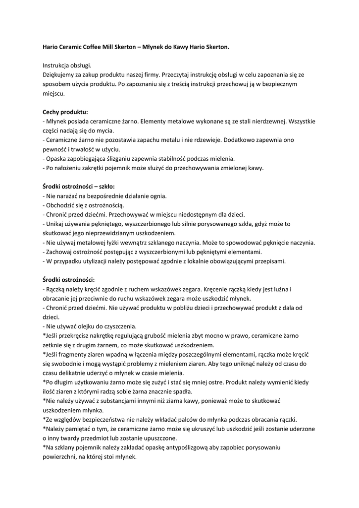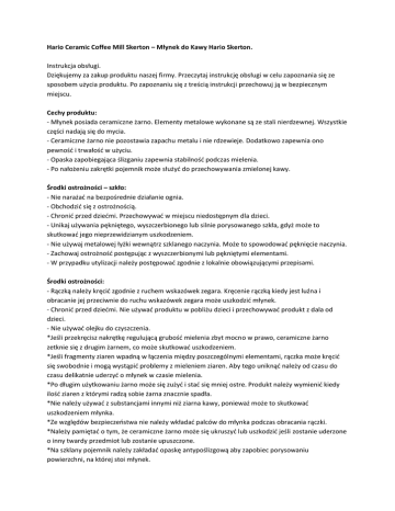 Hario Ceramic Coffee Mill Skerton – Młynek do Kawy Hario Skerton. Instrukcja obsługi. Dziękujemy za zakup produktu naszej firmy. Przeczytaj instrukcję obsługi w celu zapoznania się ze sposobem użycia produktu. Po zapoznaniu się z treścią instrukcji przechowuj ją w bezpiecznym miejscu. Cechy produktu: - Młynek posiada ceramiczne żarno. Elementy metalowe wykonane są ze stali nierdzewnej. Wszystkie części nadają się do mycia. - Ceramiczne żarno nie pozostawia zapachu metalu i nie rdzewieje. Dodatkowo zapewnia ono pewnośd i trwałośd w użyciu. - Opaska zapobiegająca ślizganiu zapewnia stabilnośd podczas mielenia. - Po nałożeniu zakrętki pojemnik może służyd do przechowywania zmielonej kawy. Środki ostrożności – szkło: - Nie narażad na bezpośrednie działanie ognia. - Obchodzid się z ostrożnością. - Chronid przed dziedmi. Przechowywad w miejscu niedostępnym dla dzieci. - Unikaj używania pękniętego, wyszczerbionego lub silnie porysowanego szkła, gdyż może to skutkowad jego nieprzewidzianym uszkodzeniem. - Nie używaj metalowej łyżki wewnątrz szklanego naczynia. Może to spowodowad pęknięcie naczynia. - Zachowaj ostrożnośd postępując z wyszczerbionymi lub pękniętymi elementami. - W przypadku utylizacji należy postępowad zgodnie z lokalnie obowiązującymi przepisami. Środki ostrożności: - Rączką należy kręcid zgodnie z ruchem wskazówek zegara. Kręcenie rączką kiedy jest luźna i obracanie jej przeciwnie do ruchu wskazówek zegara może uszkodzid młynek. - Chronid przed dziedmi. Nie używad produktu w pobliżu dzieci i przechowywad produkt z dala od dzieci. - Nie używad olejku do czyszczenia. *Jeśli przekręcisz nakrętkę regulującą grubośd mielenia zbyt mocno w prawo, ceramiczne żarno zetknie się z drugim żarnem, co może skutkowad uszkodzeniem. *Jeśli fragmenty ziaren wpadną w łączenia między poszczególnymi elementami, rączka może kręcid się swobodnie i mogą wystąpid problemy z mieleniem ziaren. Aby tego uniknąd należy od czasu do czasu delikatnie uderzyd o młynek w czasie mielenia. *Po długim użytkowaniu żarno może się zużyd i stad się mniej ostre. Produkt należy wymienid kiedy ilośd ziaren z którymi radzą sobie żarna znacznie spadła. *Nie należy używad z substancjami innymi niż ziarna kawy, ponieważ może to skutkowad uszkodzeniem młynka. *Ze względów bezpieczeostwa nie należy wkładad palców do młynka podczas obracania rączki. *Należy pamiętad o tym, że ceramiczne żarno może się ukruszyd lub uszkodzid jeśli zostanie uderzone o inny twardy przedmiot lub zostanie upuszczone. *Na szklany pojemnik należy zakładad opaskę antypoślizgową aby zapobiec porysowaniu powierzchni, na której stoi młynek. Konserwacja produktu- szkło: - Do czyszczenia należy używad miękkiej gąbki oraz łagodnych środków czyszczących. - Nie używad gąbek o powierzchni ściernej lub metalowej oraz silnych środków czyszczących, gdyż może to uszkodzid naczynie. - Produkt nadaje się do mycia w zmywarce. Należy postępowad według instrukcji dołączonej do zmywarki. - Rozcieoczony domowy rozpuszczalnik może byd użyty do usunięcia uciążliwych plam. W takim przypadku należy postępowad według zaleceo umieszczonych na etykiecie wybielacza oraz dokładnie umyd naczynie po wykonaniu czynności. Konserwacja produktu- młynek: Młynek może byd rozebrany na części w celu konserwacji. Należy uważad, aby nie zgubid poszczególnych części. Żarno jest ceramiczne a elementy metalowe wykonane są ze stali nierdzewnej. Wszystkie części nadają się do mycia. *Olejki z kawy pokrywają żarno. Zanurz żarno w rozcieoczonym obojętnym detergencie, a następnie dokładnie je wypłucz. Po umyciu żarno należy pozostawid do całkowitego wyschnięcia. Jak wyjąd żarno? 1. Przekręd śrubę blokującą w kierunku przeciwnym do ruchu wskazówek zegara i wyjmij ją, rączkę i blokadę. 2. Przekręd nakrętkę regulującą stopieo mielenia w kierunku przeciwnym do ruchu wskazówek zegara i usuo ją oraz uszczelkę. 3. Wyjmij żarno przytrzymując je od spodu. Elementy: Śruba blokująca Rączka Blokada Nakrętka regulująca stopieo mielenia Uszczelka Żarno Regulacja grubości mielenia: 1. Przekręd śrubę blokującą w kierunku przeciwnym do ruchu wskazówek zegara i odłącz ją. 2. Zdejmij rączkę i blokadę. 3. Przekręd nakrętkę regulującą stopieo mielenia aby dostosowad grubośd mielenia. *Przekręd nakrętkę w prawo (zgodnie z ruchem wskazówek zegara) aby mielid bardziej drobno. Przekręd nakrętkę w lewo aby ziarna były zmielone grubiej. 4. Zablokuj nakrętkę regulującą stopieo mielenia za pomocą blokady. 5. Zamontuj rączkę i śrubę blokującą. Użyte materiały: Pokrywa zbiornika: silikon. Zakrętka: polipropylen. Opaska antypoślizgowa: silikon. Uchwyt: polipropylen. Korpus (zbiornik): polipropylen. Szklany pojemnik: szkło żaroodporne (maksymalna różnica temperatur 120˚C) Śruba blokująca: stal nierdzewna. Rączka: stal nierdzewna. Blokada: stal nierdzewna (zablokuj nakrętkę regulującą stopieo mielenia według własnych preferencji). Nakrętka regulująca stopieo mielenia: stal nierdzewna (przekręd nakrętkę w prawo *zgodnie z ruchem wskazówek zegara+ aby mielid bardziej drobno. Przekręd nakrętkę w lewo aby ziarna były zmielone grubiej). Użytkowanie. 1. Umieśd małą ilośd ziaren w zbiorniku i dostosuj grubośd mielenia podczas przemiału (patrz: „Regulowanie grubości mielenia”). 2. 10 – 12g ziaren wystarcza na porcję kawy (120ml). Nie należy mielid ilości przekraczającej poziom oznaczony na butelce symbolem 2 filiżanek, ponieważ może to skutkowad uszkodzeniem młynka. 3. Aby zmielid ziarna chwyd młynek pewnie i powoli obracaj rączkę zgodnie z ruchem wskazówek zegara. *Nie należy obracad rączki w kierunku przeciwnym do ruchu wskazówek zegara, ponieważ może to skutkowad uszkodzeniem młynka. Grubośd mielenia zia