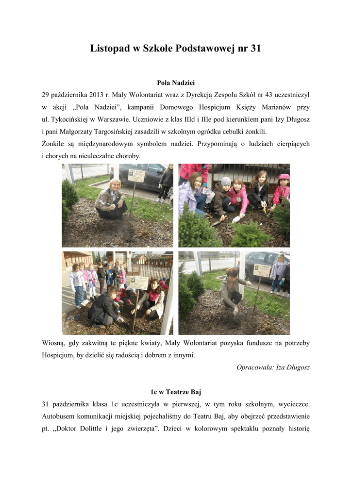 Listopad w Szkole Podstawowej nr 31 Pola Nadziei 29 października 2013 r. Mały Wolontariat wraz z Dyrekcją Zespołu Szkół nr 43 uczestniczył w akcji „Pola Nadziei”, kampanii Domowego Hospicjum Księży Marianów przy ul. Tykocińskiej w Warszawie. Uczniowie z klas IIId i IIIe pod kierunkiem pani Izy Długosz i pani Małgorzaty Targosińskiej zasadzili w szkolnym ogródku cebulki żonkili. Żonkile są międzynarodowym symbolem nadziei. Przypominają o ludziach cierpiących i chorych na nieuleczalne choroby. Wiosną, gdy zakwitną te piękne kwiaty, Mały Wolontariat pozyska fundusze na potrzeby Hospicjum, by dzielić się radością i dobrem z innymi. Opracowała: Iza Długosz 1c w Teatrze Baj 31 października klasa 1c uczestniczyła w pierwszej, w tym roku szkolnym, wycieczce. Autobusem komunikacji miejskiej pojechaliśmy do Teatru Baj, aby obejrzeć przedstawienie pt. „Doktor Dolittle i jego zwierzęta”. Dzieci w kolorowym spektaklu poznały historię niezwykłego lekarza, który rozumiał mowę zwierząt i kiedy dowiedział się o chorobie małp, miał odwagę udać się do Afryki. Była to wyprawa bogata w przygody, ale i niebezpieczne sytuacje, np. spotkanie z piratami. Doktorowi udało się uratować chore małpy oraz zdobyć nowych przyjaciół. W tej rozśpiewanej opowieści uczniowie mieli okazję zobaczyć aktorów grających lalkami, z maskami, a także teatr cieni. Dzieciom bardzo podobało się przedstawienie, dla wielu atrakcją okazała się również podróż autobusem miejskim. Opracowała: Dorota Sztolsztejner Święto Niepodległości W czwartek 7 listopada 2013 roku uczniowie klas IIId i IIIe zaprezentowały przedstawienie z okazji rocznicy Odzyskania Niepodległości. Na uroczysty apel zostali zaproszeni: dyrekcja szkoły, nauczyciele oraz uczniowie z klas drugich i trzecich. Inscenizacja przedstawiona przez młodych aktorów opowiadała o tym, jak żołnierze pod dowództwem Józefa Piłsudskiego przygotowywali się do walki o niepodległość kraju i jak okoliczni mieszkańcy wspierali wojska polskie w tych działaniach. Nie zabrakło pięknych, wzruszających pieśni patriotycznych, które śpiewali sami aktorzy, jak również towarzyszący chór. Opracowała: Elwira Krawczuk Trzecioklasiści w Salezjańskim Muzeum Misyjnym 13 listopada klasy 3a i 3c wybrały się na wycieczkę do Salezjańskiego Ośrodka Misyjnego. W drzwiach ośrodka powitała nas pani Wioletta – misjonarka z Afryki. Pani Wioletta opowiedział nam o pracy na placówce w City of Hope w Lusace, stolicy Zambii oraz wyświetliła film misyjny. W muzeum zwiedziliśmy cztery działy. Dział etnograficzny przedstawia życie codzienne i kulturę ludzi z różnych zakątków świata. W dziale przyrodniczym znajdują się różnego gatunku owady, gady i ssaki, ale również skóry węży i kości zwierząt. W dziale ze sztuką ludową podziwialiśmy afrykańskie płaskorzeźby wykonane w twardej żółtej akacji i przepiękne malowidła na wyprawionej skórze kozy czy antylopy. Wśród zbiorów specjalnych zachwycaliśmy się obrazami wykonanymi ze skrzydeł motyli, słomki ryżowej, z muszelek, z piór oraz obrazami na liściach. Dodatkową atrakcją podczas zwiedzania były barwne opowieści księdza Marka Kowalskiego, opiekuna muzeum. Wizyta w Muzeum Misyjnym była dla nas niesamowitą podróżą wśród ludów Afryki, Azji i Ameryki, która dostarczyła nam niezapomnianych wrażeń. Opracowała: Patrycja Sabak 1c w Domu Spotkań z Historią 16 listopada klasa 1c wybrała się na wycieczkę do Domu Spotkań z Historią, aby uczestniczyć w zajęciach „Czuję, rozumiem, reaguję”. Dzieci uczyły się nazywać rożne uczucia, odróżniać je od innych stanów fizycznych naszego ciała. Próbowały zapisywać i rysować swoje uczucia. Następnie obejrzały krótki film, przedstawiający mowę ciała wyrażającą uczucie złości. zastanawiały się również, czy dobrze byłoby mieć specjalne okulary, dzięki którym moglibyśmy zobaczyć różne troski otaczających nas ludzi. Na zakończenie prowadzący opowiedział nam historię pomieszczenia, w którym odbywały się zajęcia. Okazało się, że kiedyś był tu skarbiec bankowy, dlatego prowadzą do niego bardzo grube drzwi. Opracowała: Dorota Sztolsztejner 1a na Farmie Iluzji 26 listopada 2013 r. klasa I a wybrała się na wycieczkę do Farmy Iluzji. Jest to park edukacji i rozrywki, który zimą zmienia się w Farmę Mikołaja. Już sama podróż była dla nas wspaniałą przygodą, zaś w parku czekało na nas wiele atrakcji. Kiedy przekroczyliśmy bramę Farmy Iluzji, powitała nas tablica "Dziękujemy, że zabrałeś najważniejsze narzędzie do tworzenia iluzji... swój mózg". Następnie spotkaliśmy się z najprawdziwszym w świecie elfem, który oprowadził nas po parku. Swoją wędrówkę rozpoczęliśmy od spojrzenia na Lewitujący Kran. Później podziwialiśmy Latającą Chatę Tajemnic, która sprawiała wrażenie unoszonej z jednej strony przez balony. Wewnątrz niej wszystko było inne, niż się z pozoru wydaje. Ludzie chodzą dziwnie pochyleni, woda pokonuje siłę grawitacji i płynie do góry, a kule bilardowe same znajdują drogę do łuz. Nawet krótka wizyta w chacie sprawiła, że odtąd nic nie było już takie oczywiste. Zabawa przy lewitujących piłeczkach i zdjęcia przy głowie na talerzu sprawiły nam ogromną radość. Zwiedziliśmy też Muzeum Iluzji, w którym lustrzane ściany utrudniały poruszanie się wewnątrz pomieszczenia. Graliśmy w kolosalne szachy wielkości niektórych z nas. Widzieliśmy krzesło i stół olbrzyma. W Piecu Złych Uczynków spłonęły nasze złe tajemnice, co jest gwarancją, że Mikołaj w tym roku na pewno nas odwiedzi. Po tych atrakcjach wreszcie mogliśmy spotkać się i porozmawiać ze Świętym Mikołajem, który tradycyjnie, jak to Mikołaj, wręczył nam upominki. Następnie obejrzeliśmy jego gabinet i wpisaliśmy się do Księgi gości. Zmęczeni zabawami w