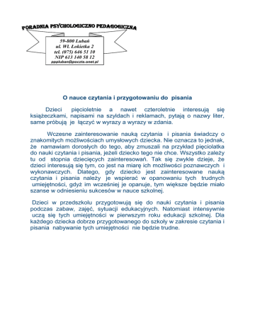 59-800 Lubań ul. Wł. Łokietka 2 tel. (075) 646 51 10 NIP 613 140 58 12 [email protected] P O nauce czytania i przygotowaniu do pisania Dzieci pięcioletnie a nawet czteroletnie interesują się książeczkami, napisami na szyldach i reklamach, pytają o nazwy liter, same próbują je łączyć w wyrazy a wyrazy w zdania. Wczesne zainteresowanie nauką czytania i pisania świadczy o znakomitych możliwościach umysłowych dziecka. Nie oznacza to jednak, że namawiam dorosłych do tego, aby zmuszali na przykład pięciolatka do nauki czytania i pisania, jeżeli dziecko tego nie chce. Wszystko zależy tu od stopnia dziecięcych zainteresowań. Tak się zwykle dzieje, że dzieci interesują się tym, co jest na miarę ich możliwości poznawczych i wykonawczych. Dlatego, gdy dziecko jest zainteresowane nauką czytania i pisania należy je wspierać w opanowaniu tych trudnych umiejętności, gdyż im wcześniej je opanuje, tym większe będzie miało szanse w odniesieniu sukcesów w nauce szkolnej. Dzieci w przedszkolu przygotowują się do nauki czytania i pisania podczas zabaw, zajęć, sytuacji edukacyjnych. Natomiast intensywnie uczą się tych umiejętności w pierwszym roku edukacji szkolnej. Dla każdego dziecka dobrze przygotowanego do szkoły w zakresie czytania i pisania nabywanie tych umiejętności nie będzie trudne. O sposobie uczenia dzieci czytania i pisania Czytanie to rozpoznawanie, identyfikowanie a także sensowne łączenie liter drukowanych lub pisanych. Pisanie natomiast to kodowanie informacji za pomocą tych samych symboli. Sposobów uczenia dzieci czytania i pisania jest wiele, ale najczęściej stosowanym schematem jest - zwrócenie uwagi na znajdujący się w oglądanej przez dziecko książeczce napis (zdanie) np. To lis; - dokonanie analizy zdania , czyli wyodrębnienie wyrazu, w którym występuje nowa litera. Tym razem będzie to wyraz lis; - określenie, jaką głoskę słyszy na początku słowa, na końcu i w środku w słowa lis; - zidentyfikowanie nowej głoski i litery, w tym przypadku jest to „l"; - poznawanie kształtu nowej litery „l" poprzez kojarzenie wyodrębnionej głoski i litery, za pomocą której można ją oznaczyć ( kodować); - pisanie palcem poznanej litery w powietrzu, na zaparowanej szybie, piasku, ołówkiem na papierze po zakropkowanym śladzie a następnie w linijkach zeszytu. Ten proces powoduje silne skojarzenie brzmienia głoski3 z kształtem jej znaku - literą; - włączanie zbitki głoska - litera do wyrazu, wyrazu do zdania a zdania do opowiadania. Dzieci czytają i piszą tak, jak mówią, dlatego niezwykle ważne jest poprawne i czyste wybrzmiewanie głosek. Przygotowując je do nauki czytania i pisania należy zadbać o to, aby: - mówiły poprawnie pod względem artykulacyjnym. Dzieci z wadami wymowy muszą być pod opieką logopedy a przed pójściem do szkoły wady te powinny być skorygowane poprzez odpowiednie ćwiczenia; - swobodnie wypowiadały się w rozwiniętej i uporządkowanej formie. Dzieci idące do szkoły mają mieć bogate słownictwo i powinny przestrzegać podstawowych zasady kultury słuchania i mówienia. Oznacza to, że muszą zadbać o to, aby były rozumiane przez innych a także starały się słuchać tego, co mówią inni; - miały dobrze rozwiniętą percepcję słuchową, w tym także słuch fonematyczny ( fonemowy). Jest on ważnym wskaźnikiem dojrzałości dziecka do nauki czytania i pisania i polega na zdolności różnicowania głosek w wypowiadanych i słyszanych słowach; do - umiały dostrzec, jaki kształt ma poznawana litera i go zapamiętać. Dobrze rozwinięta spostrzegawczość i pamięć wzrokowa jest niezbędna w początkowej nauce czytania i pisania. Każde dziecko w krótkim czasie ma zapamiętać prawie 200 znaków graficznych w tym wszystkie litery małe i wielkie w wersji pisanej i drukowanej oraz cyfry (znaki graficzne liczb), znaki działań oraz stosowane w edukacji reprezentacje graficzne (uproszczone rysunki, grafy, drzewka, tabelki). - potrafiły odwzorować litery, nie pomijając ani jednego szczegółu. Do tego potrzebna jest bardzo dobra sprawność rąk oraz współpraca ręki i oka w obrębie ruchów dłoni i palców. Niezaspokojona potrzeba ruchu, wyręczanie dzieci w prostych czynnościach sprawia, że sporo z nich charakteryzuje się niezbornością ruchową całego ciała w tym niezręcznością manualną; - nie miały większych kłopotów z koordynowaniem czynności rąk pod kontrolą wzroku od strony lewej do prawej. Podczas czytania wodzi się wzrokiem po szeregach liter tworzących słowa, zaczynając od strony lewej do prawej. Podobnie jest w pisaniu. Piszący musi jednocześnie prowadzić wzrok i organizować sensownie skomplikowane ruchy ręki od lewej do prawej strony; Oprócz tych wymienionych przeze mnie zagadnień są jeszcze inne odgrywające również ważną rolę. Do nich należy interesowanie się czytaniem i pisaniem a także rozumienie sensu kodowania i dekodowania. Chodzi tu o motywację i większą podatność do nauki czytania i pisania. mgr Małgorzata Grzesiak Dyrektor Poradni Psychologiczno-Pedagogicznej w Lubaniu Co dziecko kończące przedszkole ma wiedzieć i umieć w zakresie przygotowania do czytania i pisania Dziecko rozpoczynające naukę w klasie pierwszej ma: - określać kierunki oraz miejsca na kartce papieru i rozumieć sens poleceń typu: Narysuj kółeczko w prawym górnym rogu kartki ......, Rysuj szlaczek, zaczynając od lewej strony kartki....; - uważnie patrzeć, aby rozpoznać i zapamiętać to, co jest przedstawione na obrazkach; - mieć sprawne ręce oraz dobrą koordynację wzrokowo - ruchową ( współpraca ręki i oka), która jest potrzebna na zajęciach plastyczno technicznych i w nauce pisania; -interesować się czytaniem i pisaniem oraz ma być do tego dobrze przygotowane; - interesować się książkami, słuchać opowiadań, baśni itp. oraz rozmawiać na ich temat; - układać krótkie zdania, dzie