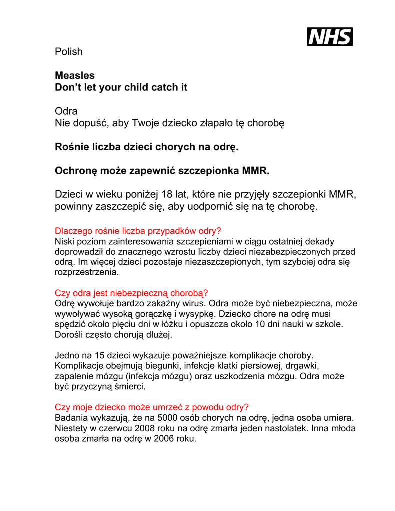 Polish Measles Don’t let your child catch it Odra Nie dopuść, aby Twoje dziecko złapało tę chorobę Rośnie liczba dzieci chorych na odrę. Ochronę może zapewnić szczepionka MMR. Dzieci w wieku poniżej 18 lat, które nie przyjęły szczepionki MMR, powinny zaszczepić się, aby uodpornić się na tę chorobę. Dlaczego rośnie liczba przypadków odry? Niski poziom zainteresowania szczepieniami w ciągu ostatniej dekady doprowadził do znacznego wzrostu liczby dzieci niezabezpieczonych przed odrą. Im więcej dzieci pozostaje niezaszczepionych, tym szybciej odra się rozprzestrzenia. Czy odra jest niebezpieczną chorobą? Odrę wywołuje bardzo zakaźny wirus. Odra może być niebezpieczna, może wywoływać wysoką gorączkę i wysypkę. Dziecko chore na odrę musi spędzić około pięciu dni w łóżku i opuszcza około 10 dni nauki w szkole. Dorośli często chorują dłużej. Jedno na 15 dzieci wykazuje poważniejsze komplikacje choroby. Komplikacje obejmują biegunki, infekcje klatki piersiowej, drgawki, zapalenie mózgu (infekcja mózgu) oraz uszkodzenia mózgu. Odra może być przyczyną śmierci. Czy moje dziecko może umrzeć z powodu odry? Badania wykazują, że na 5000 osób chorych na odrę, jedna osoba umiera. Niestety w czerwcu 2008 roku na odrę zmarła jeden nastolatek. Inna młoda osoba zmarła na odrę w 2006 roku. Czy moje dziecko jest zagrożone? Odra jest jedną z najbardziej zakaźny chorób. Kaszel lub kichanie może rozprzestrzenić wirusa odry na dużym terenie. W związku z tym, że choroba ta jest tak zakaźna, istnieje duże ryzyko zachorowania Twojego dziecka, w przypadku, gdy nie jest ono zabezpieczone. Ryzyko jest największe w przypadku dzieci. które nie otrzymały szczepionki MMR. Dzieci, które przyjęły tylko jedną dawkę szczepionki MMR, muszą otrzymać również drugą dawkę, aby zabezpieczenie przed chorobą było skuteczne. Niektóre dzieci nie mogą przyjmować szczepionki MMR, ponieważ cierpią np. na białaczkę. Dla nich ochroną będą zaszczepione zdrowe dzieci, dzięki którym odra zostanie wyeliminowana z danego środowiska. Co należy zrobić? Najbezpieczniejszym i najskuteczniejszym sposobem ochrony przed odrą jest pełne zaszczepienie dziecka szczepionką MMR. Twoje dziecko powinno otrzymać szczepionki MMR w wieku 13 miesięcy, a następnie w wieku trzech lat i czterech miesięcy lub krótko później – najlepiej przed rozpoczęciem nauki w szkole. Jeśli dziecko opuściło jedno z obowiązkowych szczepień MMR, lokalne ośrodki służby zdrowia, w tym lekarz rodzinny, mogą wysłać wezwanie do przyprowadzenia i zaszczepienia dziecka szczepionką MMR. To nadrabianie zaległości jest oferowane wszystkim dzieciom oraz młodzieży w wieku do 18 lat. Nigdy nie jest za późno na zaszczepienie dziecka. Nie pamiętam, czy moje dziecko przyjmowało szczepionkę MMR. Sprawdź kartotekę historii medycznej dziecka (‘czerwona książeczka’). Dzięki niej dowiesz się jakie szczepionki otrzymało Twoje dziecko. W przypadku wątpliwości skontaktuj się ze swoją przychodnią lub lekarzem rodzinnym. Jeśli nie ma pewności, czy szczepionka została podana, lepiej jest przeprowadzić szczepienie, ponieważ dodatkowa dawka nie stwarza ryzyka dla zdrowia Twojego dziecka, nawet gdyby wcześniej otrzymało dwa szczepienia MMR. Moje dziecko otrzymało pojedyncze szczepionki przeciwko odrze, śwince i różyczce. Czy nadal może przyjąć szczepionkę MMR? Jeśli Twoje dziecko nie przyjęło sześciu oddzielnych szczepionek, zalecamy przynajmniej jedną dawkę MMR, a najlepiej dwie. Nadal mam wątpliwości, czy mam podać dziecku te trzy szczepionki w ramach jednej iniekcji. Jest to zrozumiałe, że rodzice przejmują się szczepieniami dzieci, ale układ immunologiczny dziecka jest na tyle silny, że poradzi sobie z dziecięcymi szczepionkami. Szczepionka MMR chroni dziecko nie tyko przed odrą, ale również przed świnką i różyczką. Choroby te mogą mieć poważny przebieg w przypadku młodzieży. Czy szczepionka MMR ma jakieś skutki uboczne? Wszystkie szczepionki mogą wywoływać umiarkowane skutki uboczne, taki jak swędzenie w pobliżu miejsca iniekcji. Trzy wirusy znajdujące się w szczepionce MMR uaktywniają się w różnym momencie i mogą wywoływać następujące skutki uboczne po zaaplikowaniu pierwszej dawki: • Od sześciu do dziesięciu dni po szczepionce jedno na dziesięć dzieci może mieć lekką gorączkę, wysypkę przypominającą odrę oraz mogą wystąpić wymioty. Objawy te mogą wystąpić gdy szczep odry zaczyna działać - jest to normalne zjawisko. • U jednego dziecka na tysiąc mogą wystąpić drgawki na skutek gorączki. Objawy te są określane jako 'drgawki gorączkowe' i mogą być spowodowane każdą gorączką. Jednak jeśli dziecko nie zostanie zaszczepione i zarazi się odrą, to ryzyko wystąpienia drgawek jest pięciokrotnie wyższe. • W sporadycznych przypadkach mogą wystąpić u dzieci symptomy przypominające świnkę (gorączka i obrzęk węzłów chłonnych) około trzech tygodni po szczepieniu, ponieważ właśnie wtedy uaktywnia się część szczepionki odpowiedzialna za świnkę. • Po sześciu tygodniach od szczepienia, w bardzo rzadkich przypadkach, u dzieci może wystąpić wysypka i plamki przypominające siniaki. Objawy te są zazwyczaj spowodowane uaktywnieniem części antybiotyku, który odpowiada za odrę lub różyczkę. Jeśli zauważysz tego typu plamy, udaj się z dzieckiem do lekarza w celu przebadania. Lekarz poradzi Ci jak postępować w przypadku wysypki. • U mniej niż jednego dziecka na milion występuje zapalenie mózgu (obrzęk mózgu) po podaniu szczepionki MMR i jest bardzo mało dowodów wskazujących na to, że przyczyną tego zachorowania jest właśnie ta szczepionka. Jeśli jednak dziecko złapie odrę, ryzyko wystąpienia zapalenia mózgu waha się pomiędzy jeden do 200 i jeden do 5000. Twój lekarz lub pielęgniarka będą w stanie pr