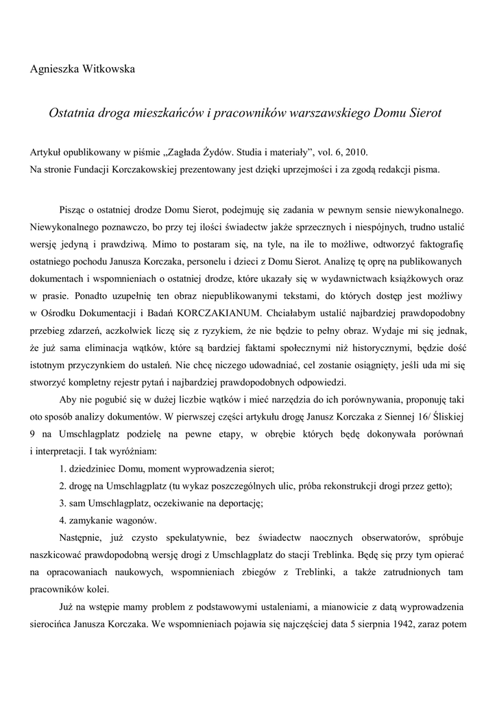 Agnieszka Witkowska Ostatnia droga mieszkańców i pracowników warszawskiego Domu Sierot Artykuł opublikowany w piśmie „Zagłada Żydów. Studia i materiały”, vol. 6, 2010. Na stronie Fundacji Korczakowskiej prezentowany jest dzięki uprzejmości i za zgodą redakcji pisma. Pisząc o ostatniej drodze Domu Sierot, podejmuję się zadania w pewnym sensie niewykonalnego. Niewykonalnego poznawczo, bo przy tej ilości świadectw jakże sprzecznych i niespójnych, trudno ustalić wersję jedyną i prawdziwą. Mimo to postaram się, na tyle, na ile to możliwe, odtworzyć faktografię ostatniego pochodu Janusza Korczaka, personelu i dzieci z Domu Sierot. Analizę tę oprę na publikowanych dokumentach i wspomnieniach o ostatniej drodze, które ukazały się w wydawnictwach książkowych oraz w prasie. Ponadto uzupełnię ten obraz niepublikowanymi tekstami, do których dostęp jest możliwy w Ośrodku Dokumentacji i Badań KORCZAKIANUM. Chciałabym ustalić najbardziej prawdopodobny przebieg zdarzeń, aczkolwiek liczę się z ryzykiem, że nie będzie to pełny obraz. Wydaje mi się jednak, że już sama eliminacja wątków, które są bardziej faktami społecznymi niż historycznymi, będzie dość istotnym przyczynkiem do ustaleń. Nie chcę niczego udowadniać, cel zostanie osiągnięty, jeśli uda mi się stworzyć kompletny rejestr pytań i najbardziej prawdopodobnych odpowiedzi. Aby nie pogubić się w dużej liczbie wątków i mieć narzędzia do ich porównywania, proponuję taki oto sposób analizy dokumentów. W pierwszej części artykułu drogę Janusz Korczaka z Siennej 16/ Śliskiej 9 na Umschlagplatz podzielę na pewne etapy, w obrębie których będę dokonywała porównań i interpretacji. I tak wyróżniam: 1. dziedziniec Domu, moment wyprowadzenia sierot; 2. drogę na Umschlagplatz (tu wykaz poszczególnych ulic, próba rekonstrukcji drogi przez getto); 3. sam Umschlagplatz, oczekiwanie na deportację; 4. zamykanie wagonów. Następnie, już czysto spekulatywnie, bez świadectw naocznych obserwatorów, spróbuje naszkicować prawdopodobną wersję drogi z Umschlagplatz do stacji Treblinka. Będę się przy tym opierać na opracowaniach naukowych, wspomnieniach zbiegów z Treblinki, a także zatrudnionych tam pracowników kolei. Już na wstępie mamy problem z podstawowymi ustaleniami, a mianowicie z datą wyprowadzenia sierocińca Janusza Korczaka. We wspomnieniach pojawia się najczęściej data 5 sierpnia 1942, zaraz potem data 6, a także 12 i 3 sierpnia1. Tę ostatnią można odrzucić od razu, jako że ostatni zapisek w Pamiętniku2 doktora Korczaka jest datowany na 4 sierpnia 1942, co całkowicie wyklucza możliwość wyprowadzenia Domu Sierot dzień wcześniej. Datę 12 sierpnia można by zaś wytłumaczyć w następujący sposób: człowiek, który widział pochód, nie zapamiętał dokładnej daty, a jedynie dzień tygodnia i to, że działo się to jakoś na początku miesiąca. Jest zrozumiałe, że po doświadczeniu sytuacji granicznej, po latach, nie był w stanie dokładnie przypomnieć sobie wszystkich szczegółów i być może na zasadzie dedukcji próbował dochodzić do pewnych ustaleń. Wiedział, że była to środa mniej więcej na początku sierpnia, stąd, 12, druga środa sierpnia 1942. Data ta jest jednak wskazywana tak rzadko, że nie ma sensu upierać się przy jej prawdopodobieństwie, tym bardziej że historia getta warszawskiego także z trudem ją dopuszcza. Jedyne, co może być dla nas istotne w tym wspomnieniu, to zasugerowany dzień tygodnia. Można więc uznać za prawdopodobne zarejestrowanie okoliczności, ewentualnie jakichś wydarzeń towarzyszących. O ile zatem przyjęcie daty 12 sierpnia jest wykluczone, o tyle wskazanie, że to była środa, może być argumentem za dniem 5 sierpnia. Czy jednak na pewno? Środa nie jest zbyt charakterystycznym dniem tygodnia, nie jest to ani szabat, ani niedziela, ani żaden dzień w ich bezpośrednim sąsiedztwie. Można zatem przyjąć, że wydarzenie to miało miejsce albo 5, albo 6 sierpnia, czyli w środę lub czwartek. Rzetelny kronikarz getta, Abraham Lewin, 7 sierpnia pisze w swoim dzienniku: „Wczorajszy dzień był wstrząsający. Z małego getta zabrali bardzo wielu ludzi. […] Uprowadzono dzieci z sierocińca dra Korczaka, z doktorem na czele. Dwieście dzieci”3. Ale Lewin pochodu nie widział. Zostało mu to przekazane albo od razu przez naocznego świadka, albo z kolejnych ust, gdy smutna wiadomość zaczęła krążyć po getcie i żyć własnym życiem. 5 sierpnia było ciepło, ulice zalane były słońcem, natomiast 6 pogoda już nieco się popsuła, a temperatura powietrza spadła 4. To samo zapisał w swoim pamiętniku Franciszek Wyszyński, który notował stan pogody w Warszawie w czasie okupacji. Napisał mianowicie: „4 VIII wtorek. Z rana pochmurno i zimny wiatr. […] 5 VIII środa. Ciepło, można było wyjść bez palta. […] 6 VIII czwartek. Chłodnawo”5. Ponadto w informacji z Ministerstwa Infrastruktury i Gospodarki Wodnej wynika, że 6 były w Warszawie przelotne deszcze, o których w relacjach nikt nie wspomina. W większości wspomnień pojawia się dość wyraźny wątek upalnego sierpnia, który może sugerować, że jednak bardziej prawdopodobna jest wcześniejsza data, to jest 5. I właśnie tak Nachum Remba, pracownik Umschlagplatzu, który prawdopodobnie jako ostatni rozmawiał z Korczakiem, opisał okoliczności tego wydarzenia: „Był strasznie upalny dzień”6. Irena Sendlerowa dodaje: „Zapamiętałam 6 sierpnia 1942 jako dzień szalenie upalny”7. 1 M.B. [Antoni Szymanowski] Likwidacja getta warszawskiego (Reportaż), Komisja Propagandy BIP, Warszawa 1942, s. 28. J. Korczak, Pamiętnik [w:] idem, Pisma wybrane, t. 4, Warszawa 1986, s. 400. 3 A. Lewin, Dziennik z warszawskiego getta, zapis z 7 VIII 1942, cyt. Za: M. Falkowska, Myśl pedagogiczna Janusza Korczaka, Warszawa 1983, s. 286. 4 Por. B. Engelking, J. Leociak, Getto warszawskie