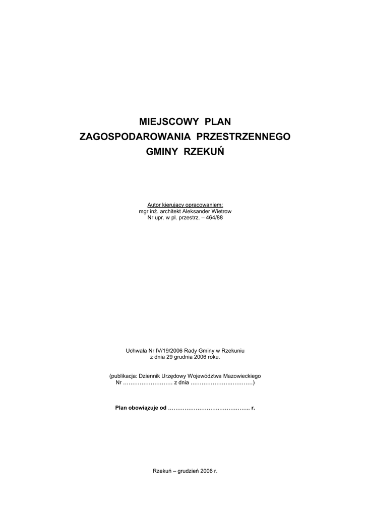 MIEJSCOWY PLAN ZAGOSPODAROWANIA PRZESTRZENNEGO GMINY RZEKUŃ Autor kierujący opracowaniem: mgr inż. architekt Aleksander Wietrow Nr upr. w pl. przestrz. – 464/88 Uchwała Nr IV/19/2006 Rady Gminy w Rzekuniu z dnia 29 grudnia 2006 roku. (publikacja: Dziennik Urzędowy Województwa Mazowieckiego Nr ……………………… z dnia ………………….…………) Plan obowiązuje od ……………………….…………….. r. Rzekuń – grudzień 2006 r. Miejscowy Plan Zagospodarowania Przestrzennego Gminy Rzekuń UCHWAŁA Nr IV/19/2006 Rady Gminy Rzekuń z dnia 29 grudnia 2006 r. w sprawie miejscowego planu zagospodarowania przestrzennego gminy Rzekuń. Na podstawie art. 18 ust. 2 pkt. 5 ustawy z dnie 8 marca 1990 r. o samorządzie gminnym (tekst jednolity: Dz. U. z 2001r., Nr 142, poz. 1591 ze zm.), art. 20 ust. 1 ustawy z dnia 27 marca 2003 r. o planowaniu i zagospodarowanie przestrzennym (Dz. U. z 2003r., Nr 80, poz. 717 ze zm.), rozporządzenia Ministra Infrastruktury z dnia 26 sierpnia 2003 r. w sprawie wymaganego zakresu projektu miejscowego planu zagospodarowania przestrzennego (Dz. U. z 2003r., Nr.164, poz. 1587) oraz Uchwały Nr III/12/2002 Rady Gminy w Rzekuniu z dnia 13 grudnia 2002 r. w sprawie przystąpienia do sporządzenia miejscowego planu zagospodarowanie przestrzennego dla gminy Rzekuń, uchwala się miejscowy plan zagospodarowania przestrzennego gminy Rzekuń. DZIAŁ I USTALENIA OGÓLNE Rozdział 1 Zakres obowiązywania planu §1. Miejscowy plan zagospodarowania przestrzennego zwany dalej planem – zawiera: 1) tekst planu miejscowego – treść uchwały, 2) rysunek planu miejscowego – część graficzna stanowiąca załącznik nr 1 do uchwały, a mianowicie rysunki w skali 1:2000: - rysunek nr 1 - Borawe, - rysunek nr 2 - Czarnowiec, - rysunek nr 3 - Daniszewo, - rysunek nr 4 - Drwęcz, - rysunek nr 5 - Dzbenin, - rysunek nr 6 - Goworki, - rysunek nr 7 - Kamianka, - rysunek nr 8 - Korczaki, - rysunek nr 9 - Laskowiec, - rysunek nr 10 - Ławy, - rysunek nr 11 - Nowa Wieś Wschodnia, - rysunek nr 12 - Ołdaki, - rysunek nr 13 - Przytuły Nowe, - rysunek nr 14 - Przytuły Stare, - rysunek nr 15 - Rozwory, - rysunek nr 16 - Rzekuń, - rysunek nr 17 - Susk Nowy, - rysunek nr 18 - Susk Stary, - rysunek nr 19 - Teodorowo, - rysunek nr 20 - Tobolice, 2 Miejscowy Plan Zagospodarowania Przestrzennego Gminy Rzekuń - rysunek nr 21 – Zabiele. §2. 1. Granica obszaru objętego opracowaniem obejmuje obszar gminy w jej granicach administracyjnych z uwzględnieniem granic obowiązujących od 1 stycznia 2007r.. 2. Plan określony jest jako perspektywiczny bez sprecyzowania terminu jego obowiązywania. 3. Plan zagospodarowania przestrzennego zagospodarowania przestrzennego. opracowano zgodnie ze studium uwarunkowań i kierunków §3. 1. W załączniku nr 2 do uchwały Rady Gminy rozstrzyga się o sposobie realizacji inwestycji z zakresu infrastruktury technicznej, które należą do zadań własnych gminy oraz zasadach ich finansowania. 2. W załączniku nr 3 do uchwały Rady Gminy rozstrzyga się o sposobie uwzględnienia uwag zgłoszonych do projektu planu. §4. Ilekroć w dalszych przepisach niniejszej uchwały jest mowa o: 1) ustawie – należy przez to rozumieć ustawę o planowaniu i zagospodarowaniu przestrzennym, 2) planie – należy przez to rozumieć ustalenia planu, o których mowa w §1 uchwały, o ile z treści przepisu nie wynika inaczej, 3) uchwale – należy przez to rozumieć niniejsza Uchwałę Rady Gminy Rzekuń w sprawie uchwalenia miejscowego planu zagospodarowania przestrzennego dla gminy Rzekuń w granicach określonych w §2 ust. 1 uchwały i oznaczonych w załączniku nr 1 do uchwały, o ile z treści przepisu nie wynika inaczej, 4) rysunku planu - należy przez to rozumieć załącznik graficzny nr 1 do niniejszej uchwały, który został sporządzony w formie rysunkowej na mapach ewidencyjnych sołectw w skali 1:2000, 5) przepisach szczególnych i odrębnych - należy przez to rozumieć przepisy ustaw wraz z aktami wykonawczymi oraz ograniczenia w dysponowaniu terenem, wynikające z prawomocnych decyzji administracyjnych, 6) obszarach funkcjonalnych - należy przez to rozumieć tereny o określonym rodzaju przeznaczenia podstawowego i dopuszczonego, wyznaczone na rysunku planu liniami rozgraniczającymi i oznaczone symbolami graficznymi, 7) obszarach górniczych – należy przez to rozumieć przestrzeń, w granicach której przedsiębiorca jest uprawniony do wydobywania kopalin oraz prowadzenia robót górniczych związanych z wykonywaniem koncesji, 8) terenie – należy przez to rozumieć nieruchomość gruntową lub działkę gruntu o określonym rodzaju przeznaczenia podstawowego i dopuszczalnego, wyznaczony na rysunku planu liniami rozgraniczającymi, 9) działce budowlanej - należy przez to rozumieć nieruchomość gruntowa lub działkę gruntu, której wielkość, cech geometryczne, dostęp do drogi publicznej oraz wyposażenie w urządzenia infrastruktury technicznej spełniają wymogi realizacji obiektów budowlanych wynikające z odrębnych przepisów i aktów prawa miejscowego, 10) przeznaczeniu podstawowym - należy przez to rozumieć takie przeznaczenie, które powinno przeważać na danym obszarze, wyznaczonym liniami rozgraniczającymi, 11) przeznaczeniu dopuszczalnym - należy przez to rozumieć rodzaje przeznaczenia inne niż podstawowe, które uzupełniają lub rozszerzają przeznaczenie podstawowe, 12) liniach rozgraniczających – należy przez to rozumieć, linie dzielącą tereny o różnym przeznaczeniu, różnych funkcjach lub różnych zasadach zagospodarowania, 13) nieprzekraczalnych liniach zabudowy – należy przez to rozumieć linie ograniczające potencjalną zabudowę wzdłuż powierzchni ścian zewnętrznych, bez wystających maksymalnie 1 m poza ten obrys okapów, schodów i balkonów, 14) mieszkalnictwie jednorodzinnym - należy przez to rozumieć zabudowę mieszkaniowa z budynkami jednorodzinnymi, d